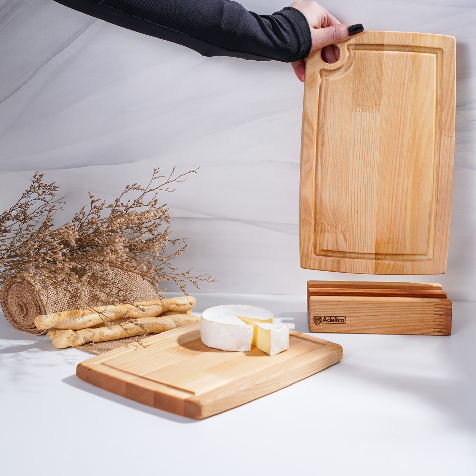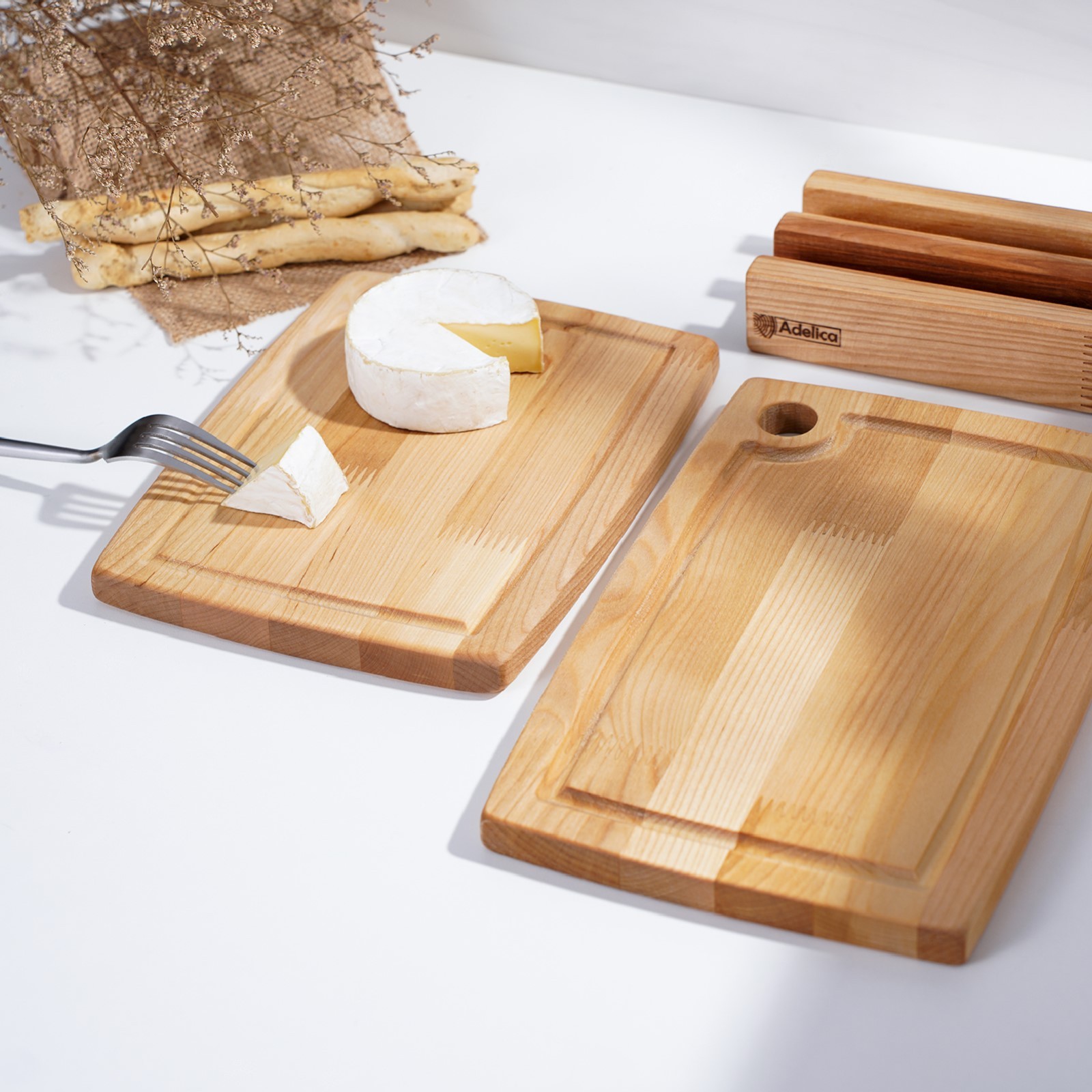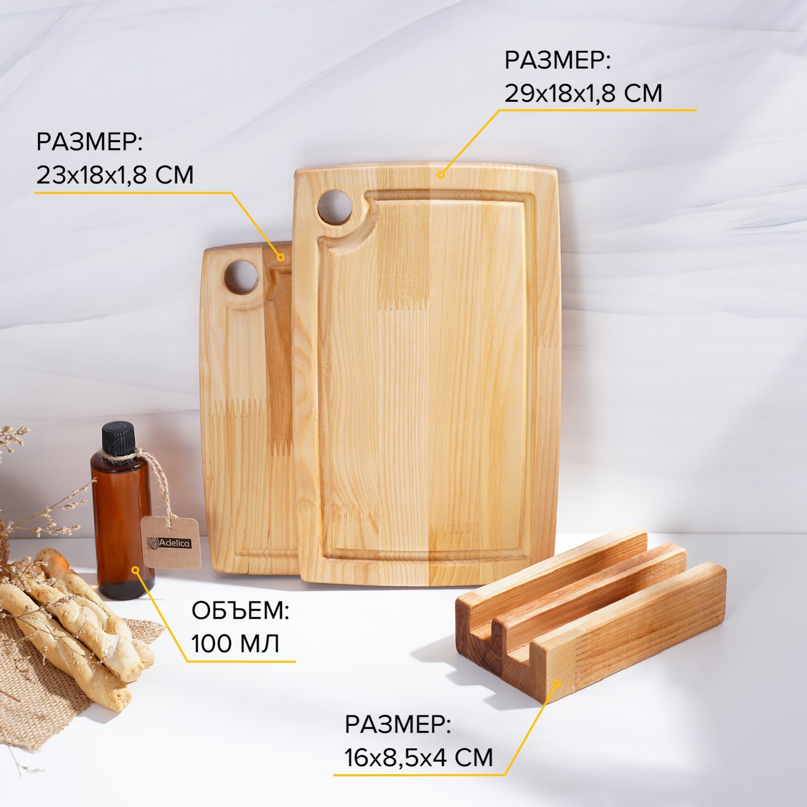 Набор разделочных досок 2 шт adelica, подставка под доски, берёза, масло в подарок 100 мл, в подарочной коробке. Преимущества деревянных разделочных досокОбладают необходимой упругостью при нарезании крошащихся, мокрых, твёрдых и тягучих продуктов. Натуральная древесина гипоаллергенна и гигиенична. Как ухаживать за деревянной разделочной доскойИзделие нужно обязательно мыть вручную в тёплой воде сразу после использования. Замачивание доски в раковине повредит её: от воды древесина может испортиться. После мытья необходимо протереть изделие мягкой тряпочкой. Сушите доску, уложив её на плоскую поверхность так, чтобы она не деформировалась. Если постоянно ставить её набок, то постепенно она будет выгибаться в определённую сторону. Периодически протирайте изделие раствором уксуса или чистого лимонного сока. Особенно это важно после нарезания сырого мяса, рыбы и сильно пахнущих продуктов. Обрабатывайте минеральным маслом или мазью. Это создаст защиту для влаги. Цвет: Бежевый Для кого: Унисекс Форма: Прямоугольная Длина, см: 23 Длина, см: 29 Ширина, см: 18 В наборе, шт.: 4 Вид упаковки: Коробка картонная Адресат: Без адресата Вид дерева: Берёза Материал: Дерево Тип доски: Стандартная Тип нанесения рисунка: Без нанесения Составляющие набора: Разделочная доска Возраст: Для взрослых Температурное ограничение: Нет Можно мыть в посудомоечной машине: Нет Особенности: На подставке Тематика подарка: Посуда Форма: Прямоугольник  развернуть описание ▼