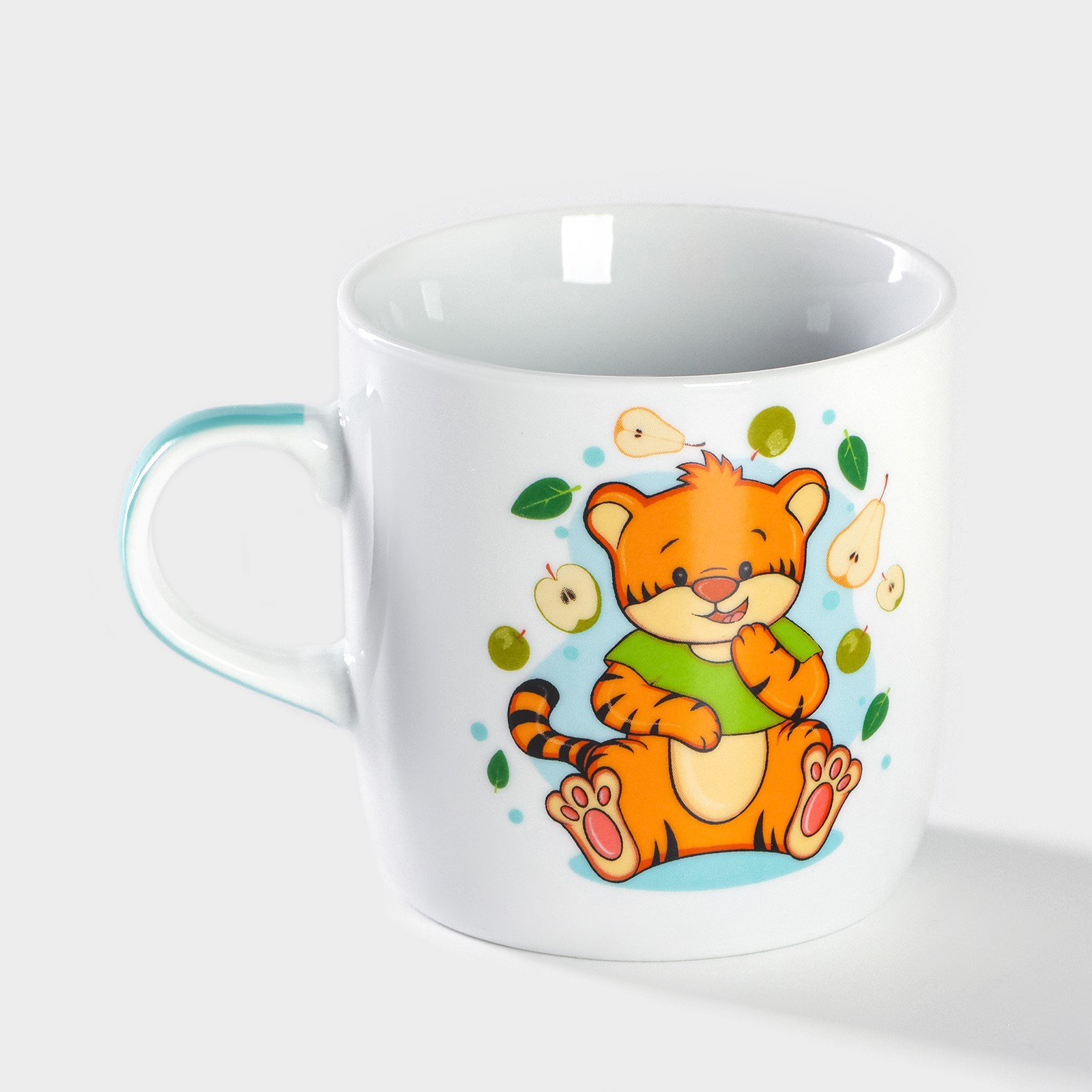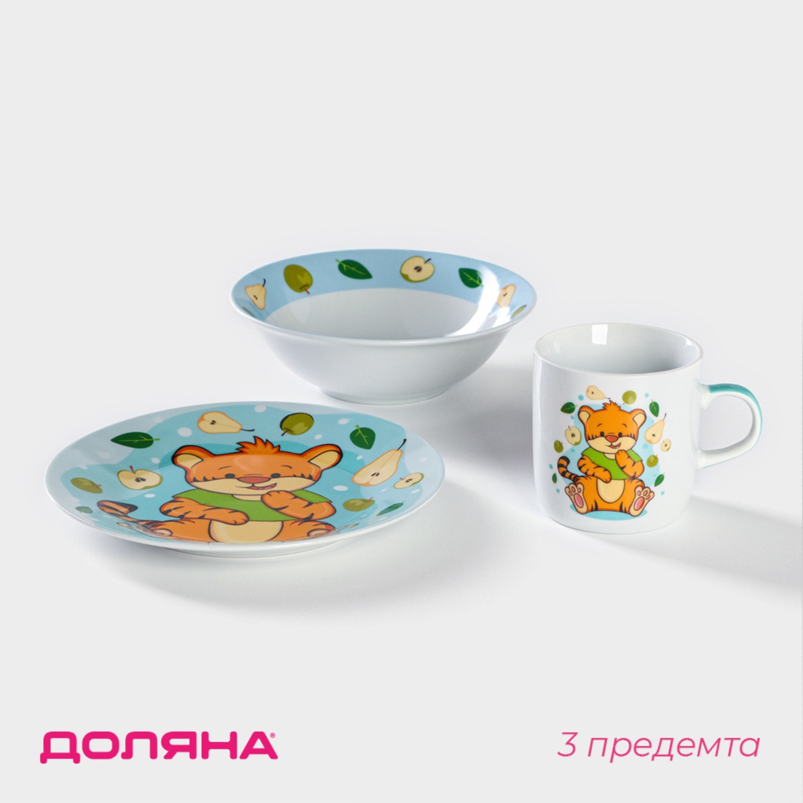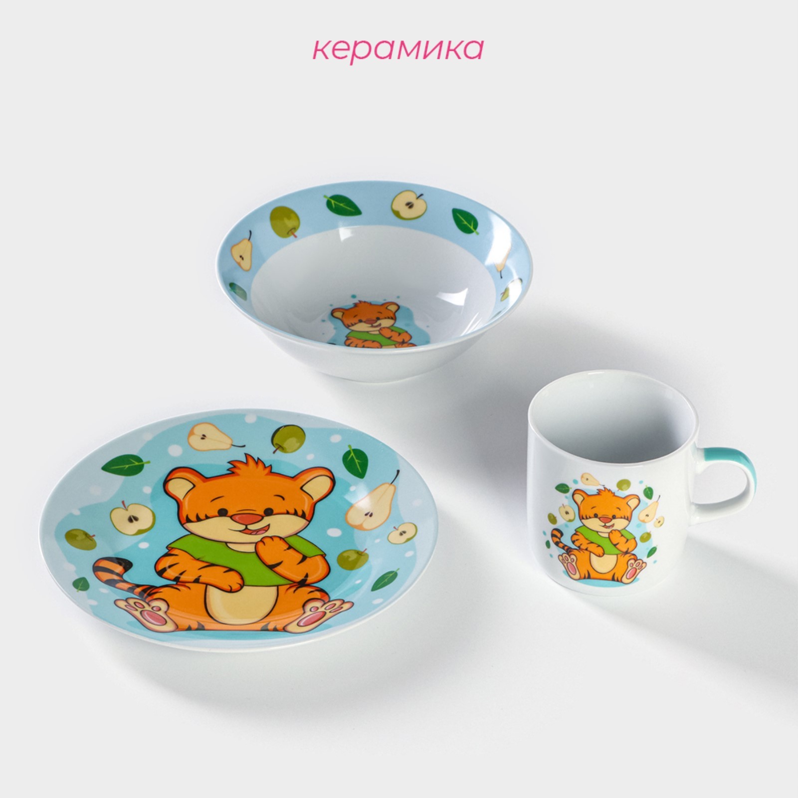Набор детской посуды из керамики доляна «тигрёнок с грушами», 3 предмета: кружка 230 мл, миска 400 мл, тарелка D=18 см