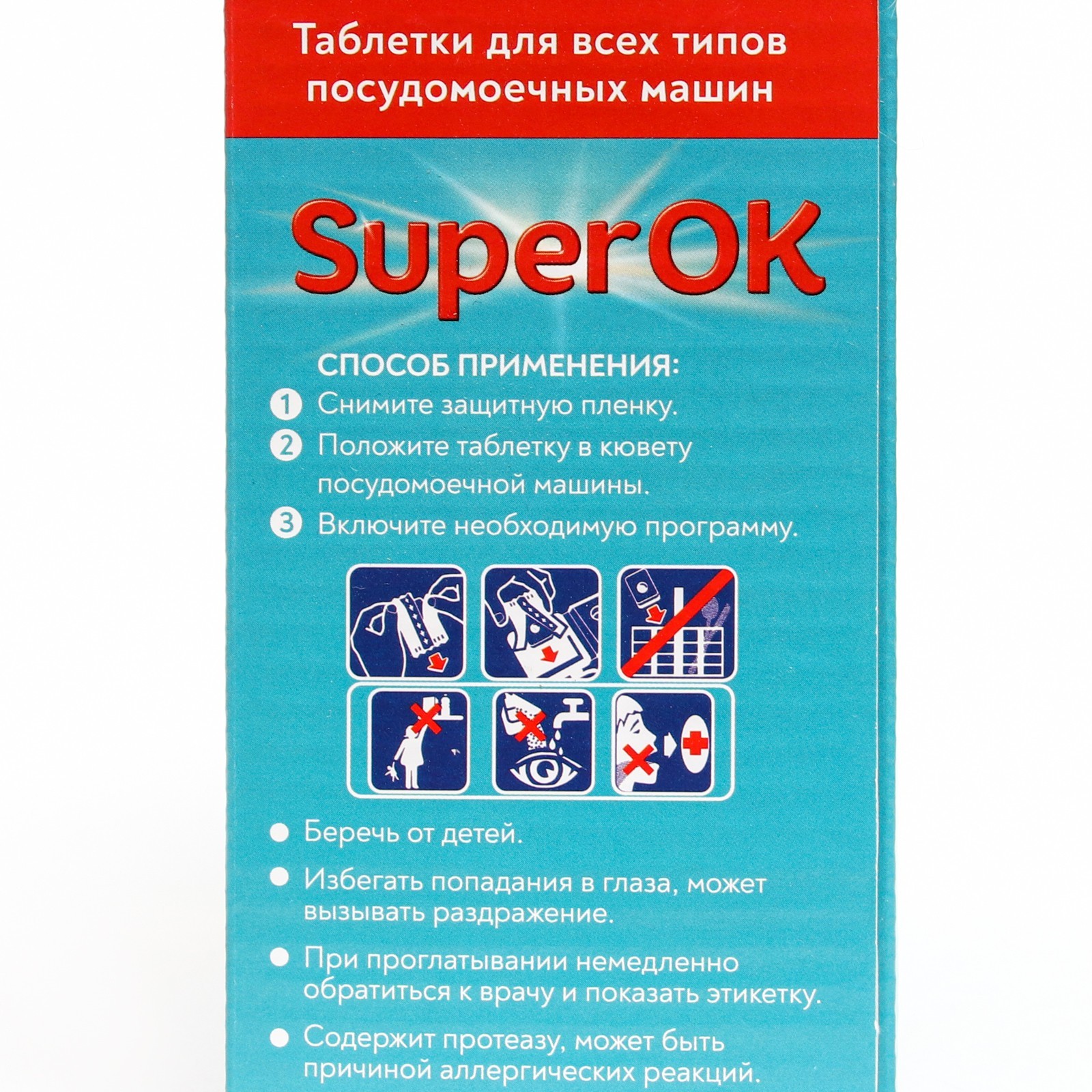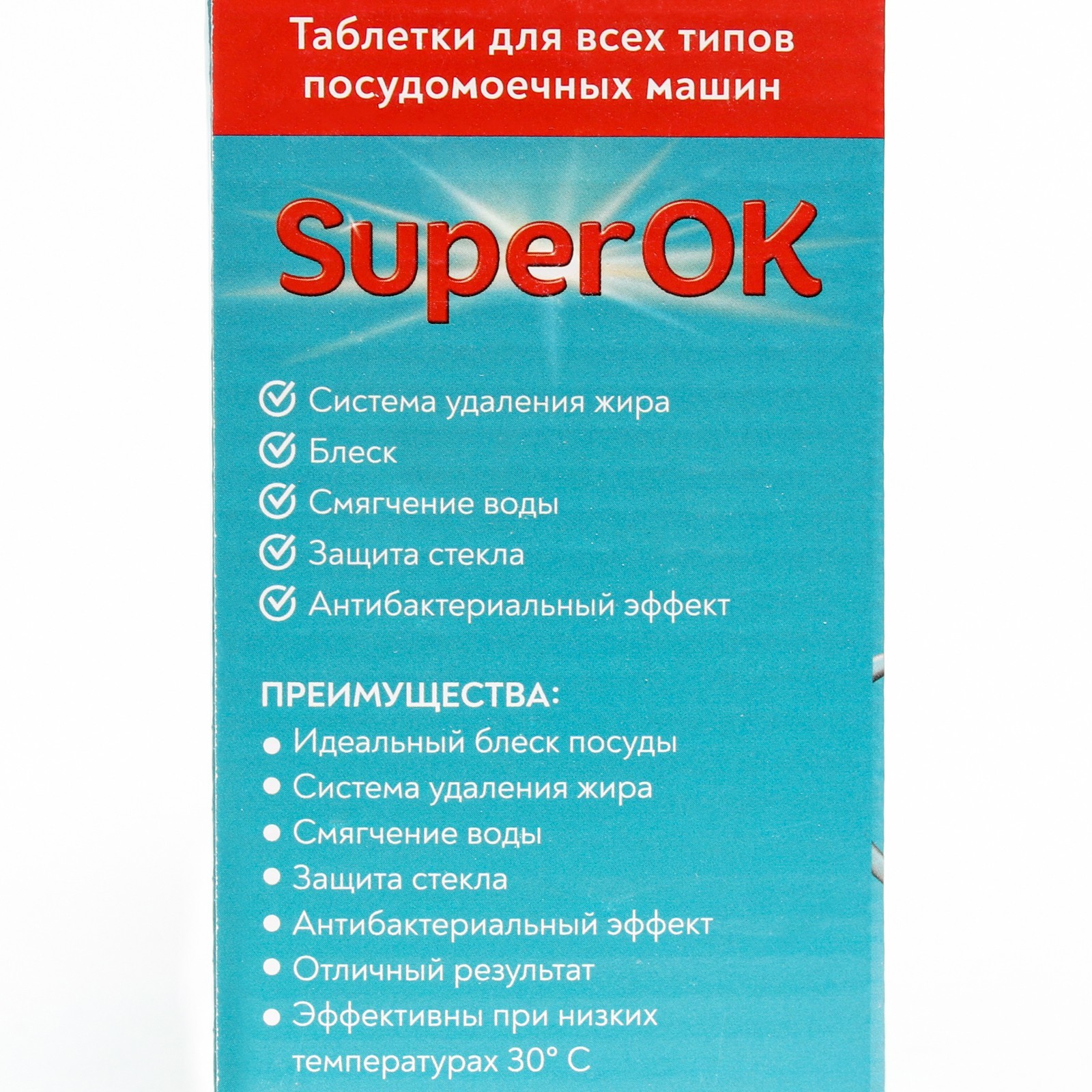 Таблетки для посудомоечных машин "superok" all in 1, 30 шт. Таблетки для посудомоечной машины SuperOK - это новый бренд от производителя таких известных марок, как Сlean&Fresh, Lotta, ECOLotta, Aquarius. Мы произвели для Вас новые качественные посудомоечные таблетки продукт по цене, доступной каждому ! Таблетки для посудомоечных машин всех типов SuperOK - это* отсутствие хлора и агрессивных ПАВ;* низкое содержание фосфатов;* биоразлагаемость 100%;* забота об окружающей среде;* перерабатываемая упаковка;* возможность использования в септиках;* высокая эффективность при низких температурах Достаточно поместить одну таблетку для посудомоечной в дозатор посудомоечной машины и посуда приобретает идеальную чистоту и свежесть, без разводов и известковых пятен. При использовании на коротких циклах мойки рекомендуется положить таблетку на дно посудомоечной машины. Важно! На качество мытья посуды в посудомоечной машине, помимо посудомоечных таблеток, влияют многие факторы. Поэтому, прежде чем выбрать моющее средство для посудомоечной машины, обращайте внимание на правильную расстановку посуды, выбирайте соответствующий режим мойки, следите за состоянием фильтров и разбрызгивателей. Средство для посудомойки полностью смывается водой. parts count: 0 В упаковке, шт.: 30 Ароматизированные: Нет Температурное ограничение: Нет  развернуть описание ▼