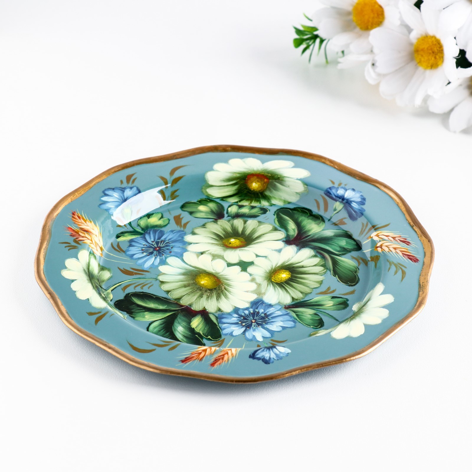 Поднос жостовский "ромашки", голубой, с авторской росписью, D=17 см