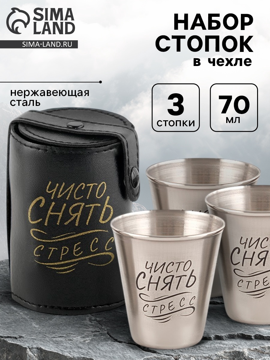 Стопки в чехле, нержавеющая сталь, набор 3 шт. х 70 мл. Набор стопок из 3 штук по 70 мл из пищевой нержавеющей стали в компактном чехле. Легкие и компактные, удобно брать с собой на отдых, рыбалку, охоту, природу или в путешествия. Супер прочные и стильные, эти стопки изготовлены из высокого качества 304 нержавеющей стали, они не только красиво смотрятся, но и обеспечивают долгий срок службы изделия. Легко моются и подходят для повседневного использования. Отлично заменят стеклянные рюмки и бокалы, смотрятся эффектно и стильно. Стопки не слишком высокие, удобно помещаются в руке и имеют оптимальный объем 30 мл. Это подарочный набор на все случаи жизни, который станет прекрасным подарком на новый год папе или маме, бабушке или дедушке, а еще коллеге или начальнику боссу на день рождения или 23 февраля, 9 мая, 8 марта, юбилей. Этот набор шоттов удивит и порадует каждого получателя. Рюмки подойдут для водки, самогона, коньяка, виски, рома, ликера и другого алкоголя. Также допустимо использовать для безалкогольных напитков, таких как сок, вода или морс. Небольшие шоты идеальны для коктейлей, текилы или настоек. Набор:Да|Цвет:Хромированный|В наборе, шт.:3|Объём, мл:70|Рисунок:Да|Материал:Нержавеющая сталь|Особенности:С надписью|Страна:Китай  развернуть описание ▼