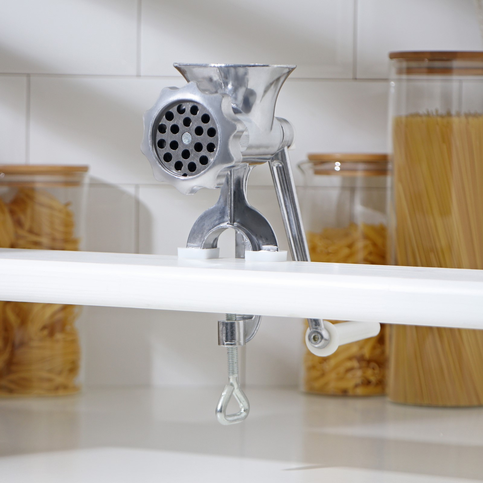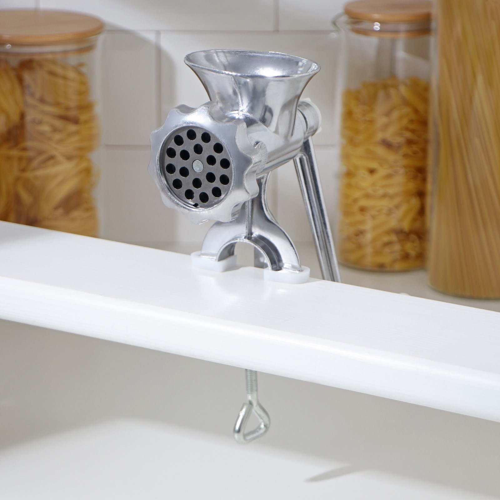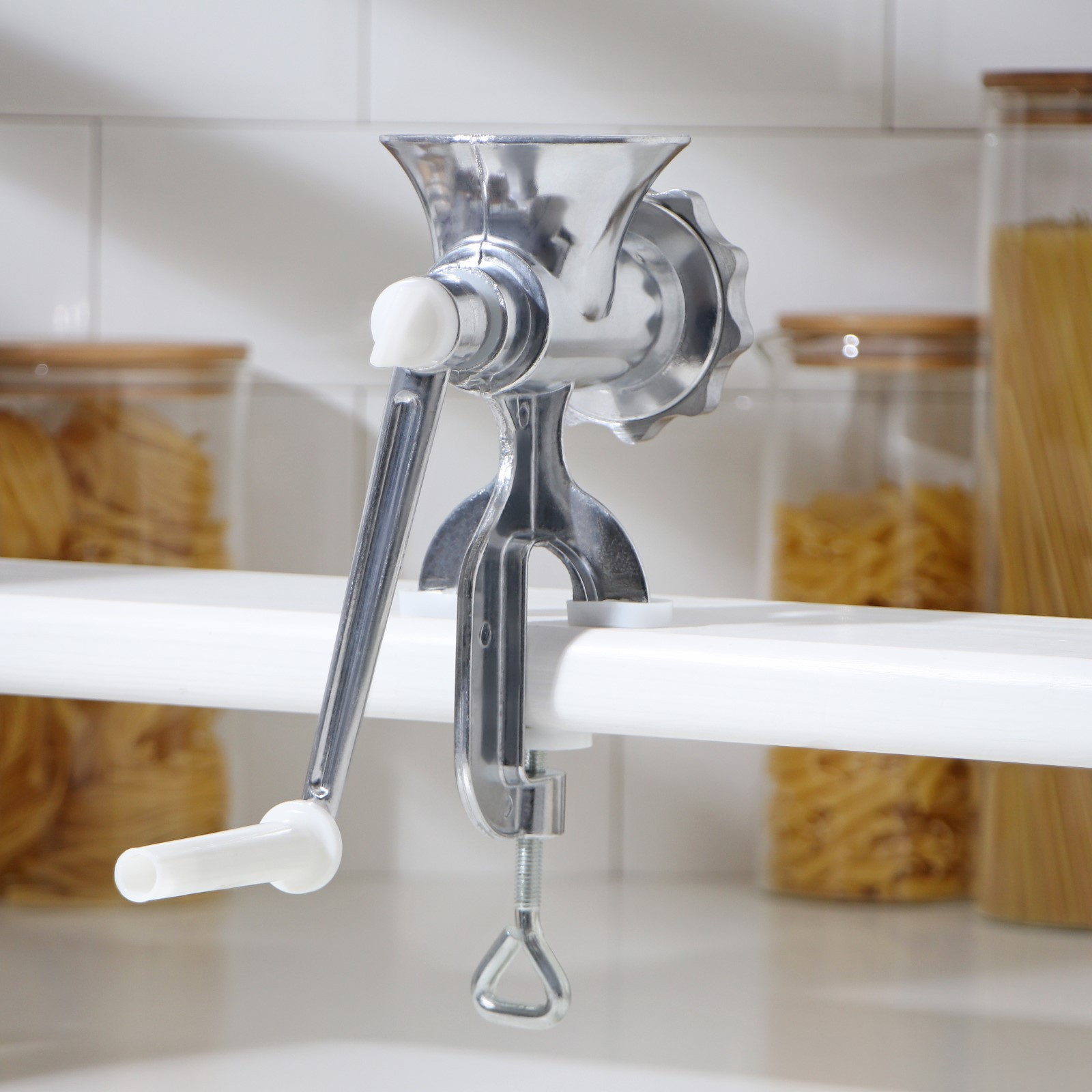 Мясорубка алюминиевая доляна «советская» 22,5x13,5 см. Несмотря на популяризацию электрических мясорубок, ручная механическая мясорубка не сдает своих позиций. Этот незаменимый железный прибор для кухни послужит вам не только для приготовления фарша из мяса, рыбы и индейки, но и позволит сэкономив время сделать овощные заготовки, колбасный паштет, соус болоньезе. Легко и быстро сделаете котлеты, правильное питание для всей семьи, фрикадельки, картофельный фарш для драников. Отлично подходит для изготовления домашних колбасок, сосисок. Часто эта мясорубка используется как шнековая соковыжималка для овощей и фруктов. Цвет: Серебристый Материал ручки: Пластик Материал: Алюминий  развернуть описание ▼