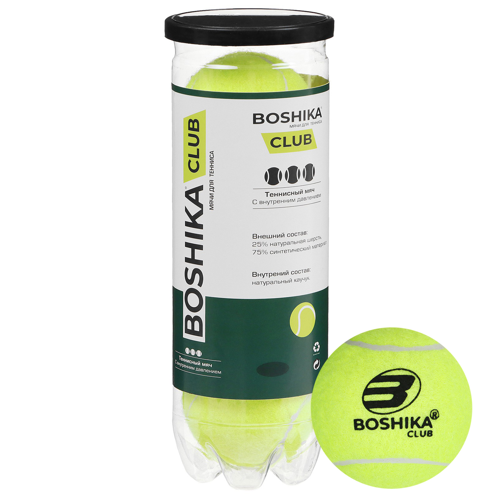 Набор мячей для большого тенниса boshika, тренировочный, 3 шт.. Мяч предназначен для тренировок и любительских турниров. Обладает внутренним давлением. Благодаря этому увеличивается прочность мяча, а отскок становится более сбалансированным и предсказуемым. Внутренний материал: натуральный каучук. Поверхность покрыта специальным сукном из ворса: 25 % шерсти, 75 % синтетического материала. Для хранения и транспортировки мячи поставляются в тубе. Цвет: Жёлтый Материал: Шерсть Материал: Каучук Тип соединения панелей: Клееный Уровень спорта: Тренировочный  развернуть описание ▼