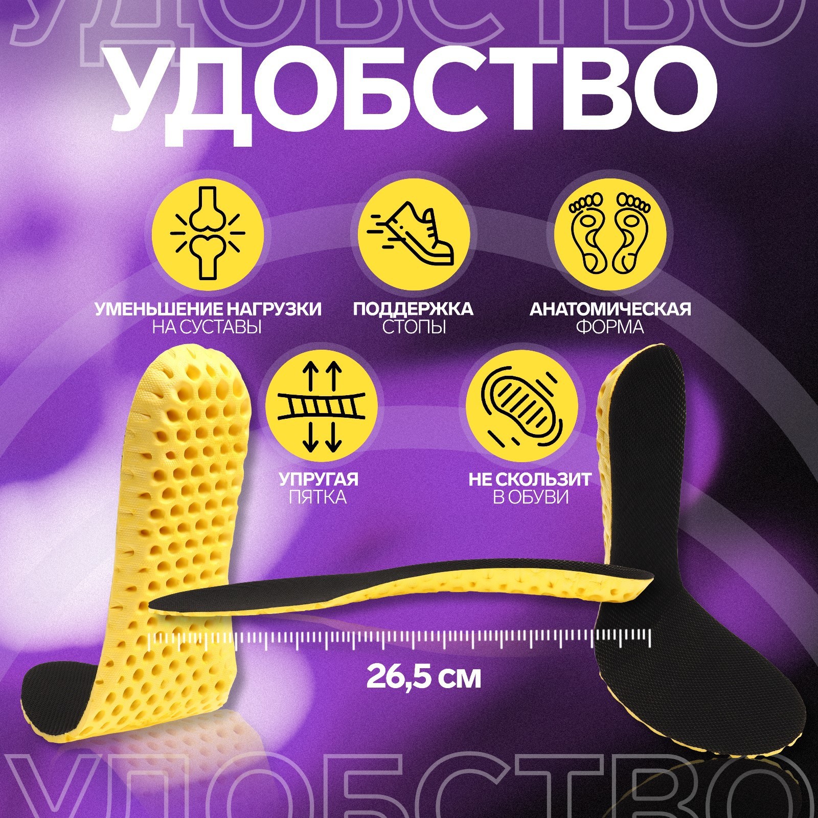 Стельки для обуви, влаговпитывающие, дышащие, р-р Ru 41 (р-р пр-ля 43), 26,5 см, пара, цвет чёрный/жёлтый