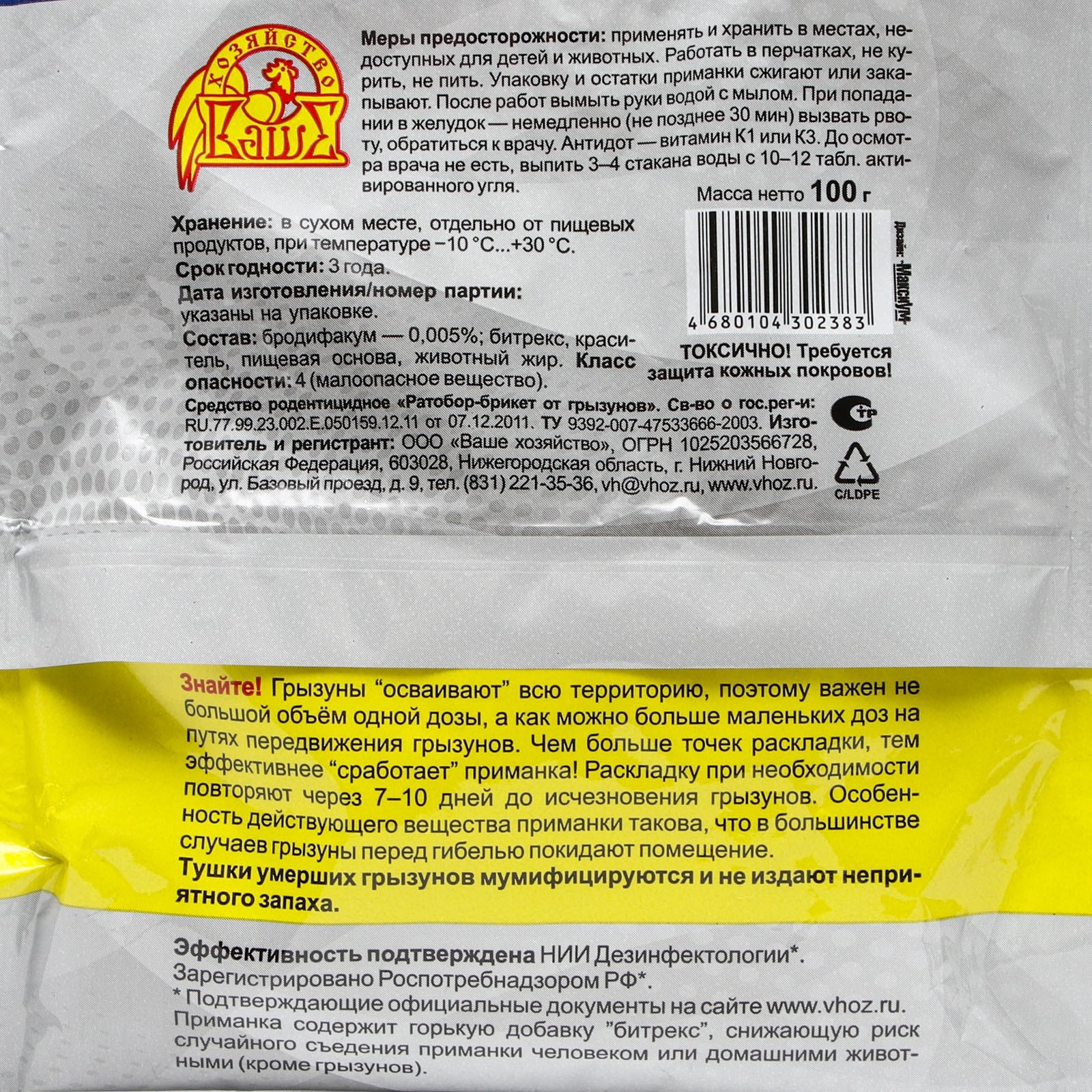 Тесто-брикет ратобор экстра, от грызунов, пак, 100 г