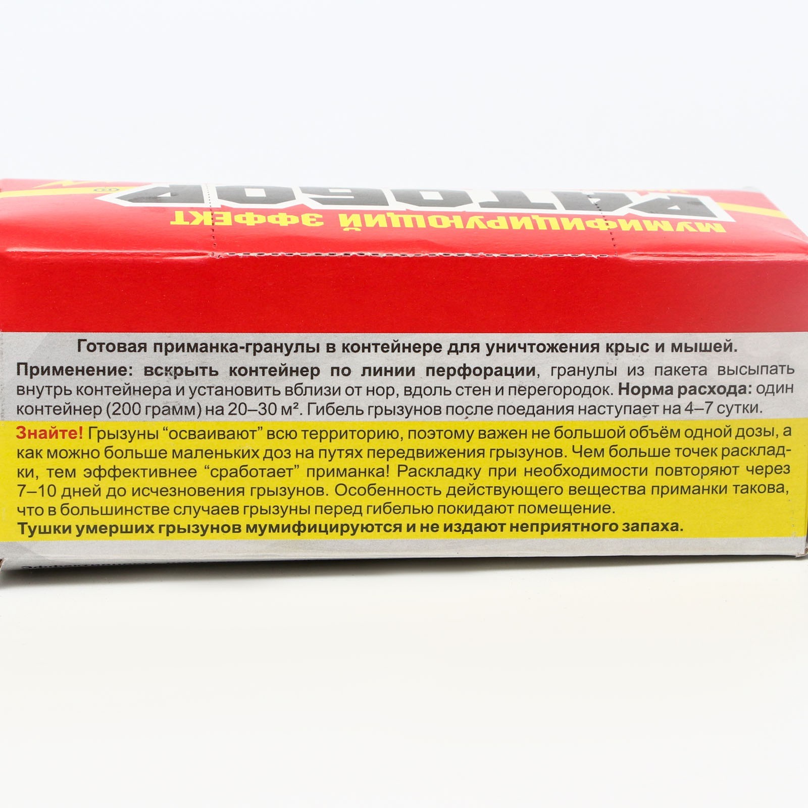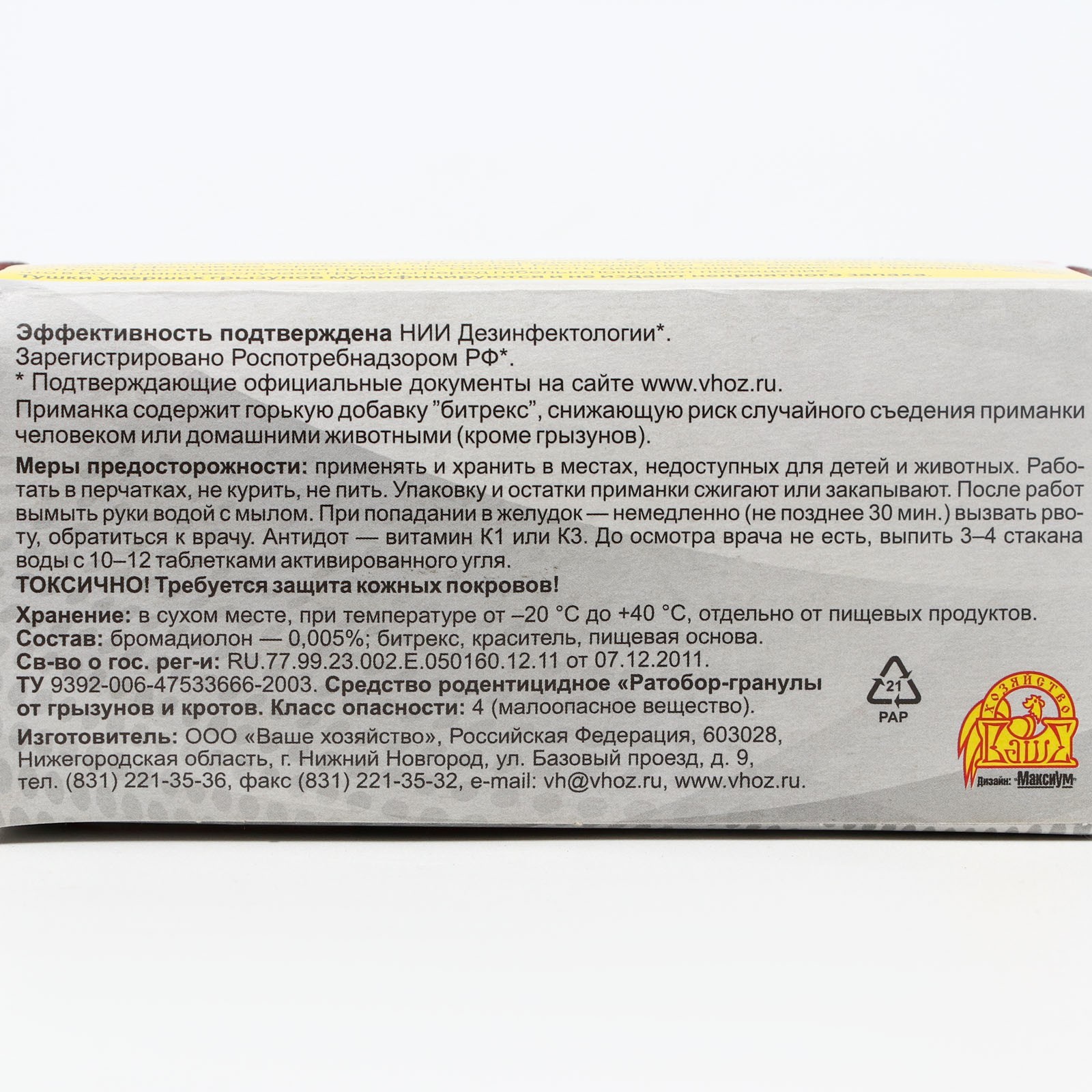 Гранулы ратобор, от грызунов, пак, 200 г. Предназначен для борьбы с серыми и черными крысами, домовыми и полевыми мышами, водяными крысами. Препаративная форма (твердые гранулы) в отличие от большинства аналогов характеризуется повышенной устойчивостью к размыканию, гранулы не ломаются, не крошатся. Введение в состав нескольких пищевых привлекателей гарантирует высокую поедаемость всеми видами грызунов с различными пищевыми предпочтениями. Действующее вещество распределено равномерно по всей толщине гранулы, что исключает его неэффективные потери. Может применяться в саду, в открытых и влажных норах. Тушки умерших грызунов мумифицируются и не издают неприятного запаха. Контейнер DOUBLE BOX (арт. 90421) состоит из двух половинок, каждая из которых используется как отдельная подставка для фильтр-пакета с приманкой. Это удобно, гигиенично и выгодно! Состав: бромадиолон — 0, 005%; битрекс, краситель, пищевая основа. Гарантийный срок хранения: 2 года. Применение: приманку насыпают на подложки (б/у жест. крышки, картонки) или лотки по 1 стол. ложке против мышей и по 2 ст. ложки против крыс вблизи от нор, вдоль стен через 2–4 м. Так повышается поедаемость и уменьшается растаскивание грызунами. Для водяных крыс приманку раскладывают около входа в норы по 15–30 г. Знайте! Грызуны «осваивают» всю территорию, поэтому важен не большой объём одной дозы, а как можно больше маленьких доз на путях передвижения грызунов. Чем больше точек раскладки, тем эффективнее «сработает» приманка! Раскладку при необходимости повторяют через 7–10 дней до исчезновения грызунов. Особенность действующего вещества приманки такова, что в большинстве случаев грызуны перед гибелью покидают помещение. Тушки умерших грызунов мумифицируются и не издают неприятного запаха. Меры предосторожности: применять и хранить в местах, недоступных для детей и животных. Работать в перчатках, не курить, не пить. Упаковку и остатки приманки сжигают или закапывают. После работ вымыть руки водой с мылом. При попадании в желудок — немедленно (не позднее 30 мин) вызвать рвоту, обратиться к врачу. Антидот — витамин К1 или К3. До осмотра врача не есть, выпить 3–4 стакана воды с 10–12 таблетками активированного угля. ТОКСИЧНО! Требуется защита кожных покровов! Хранение: в сухом месте, отдельно от пищевых продуктов. Вес, г: 200 Область применения: От грызунов Вид средства: Гранулы Температурное ограничение: Нет  развернуть описание ▼