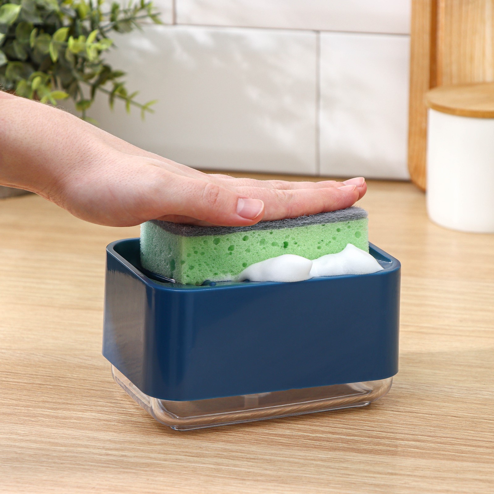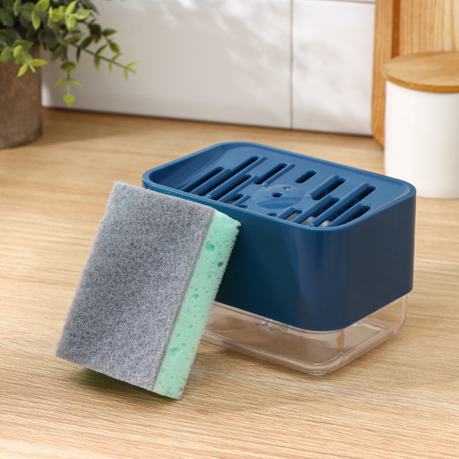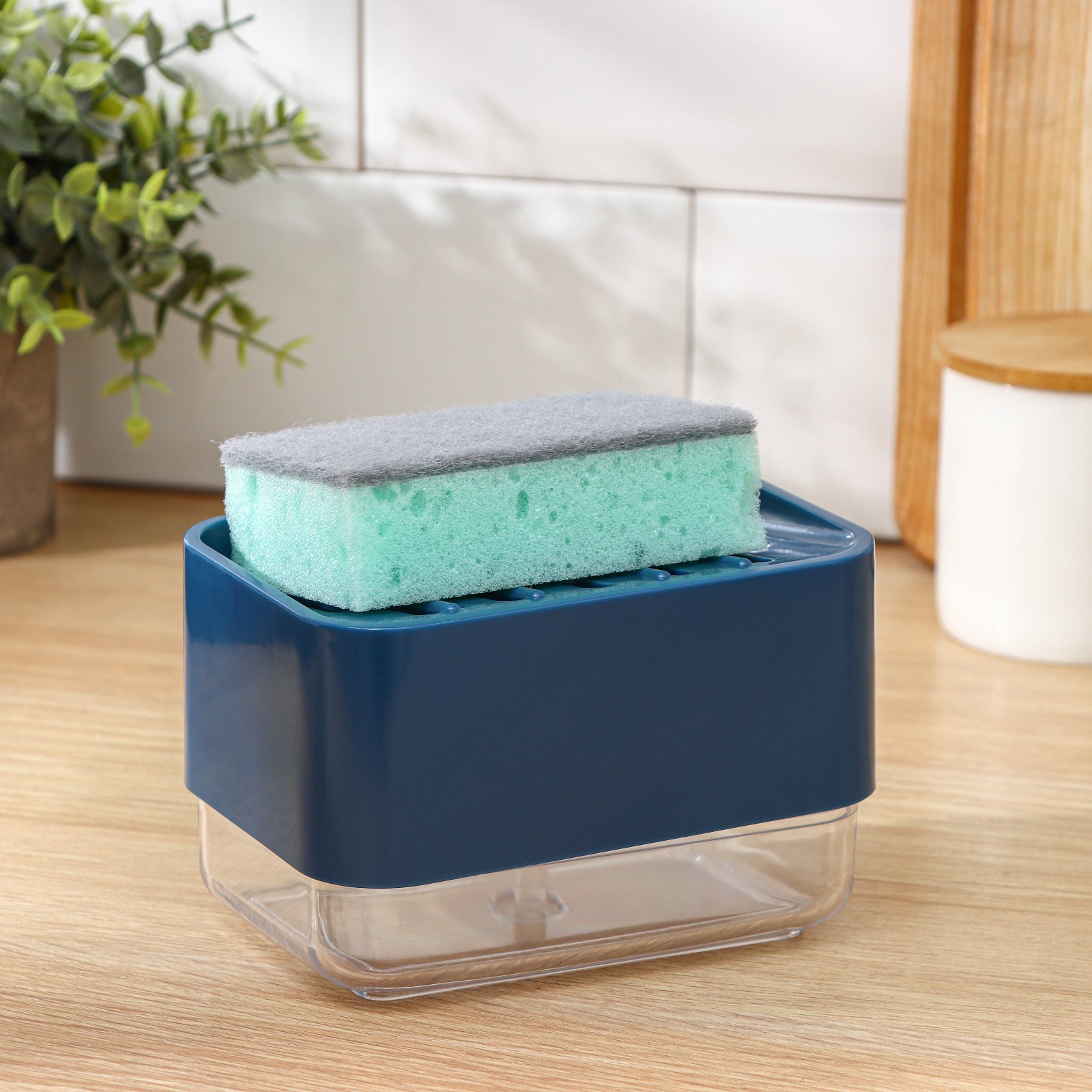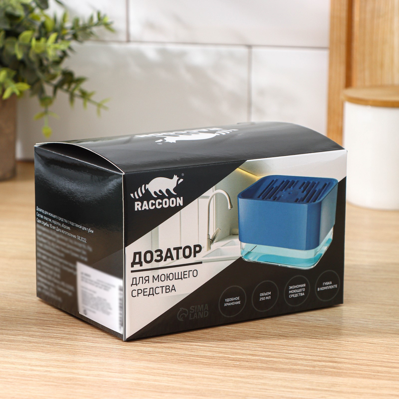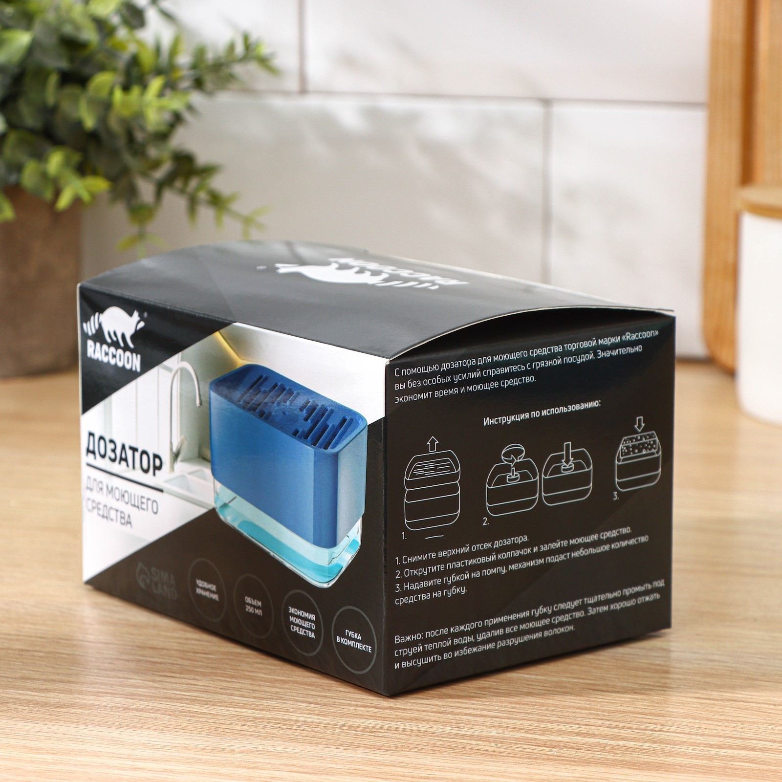 Дозатор для моющего средства с подставкой для губки raccoon, губка в комплекте, цвет синий. С помощью дозатора для моющего средства торговой марки Racoon вы без труда справитесь с грязной посудой. Преимущества: Дозатор для жидкого мыла сделает мытье посуды комфортным и быстрым. Оптимальная дозировка диспенсера для кухни позволит съэкономить на расходе моющего средства для посуды. Современный стиль органайзера для моющих жидкостей украсит любую кухню. Ваша губка и тряпка больше не будут валяться и не будет оставлять мыльные подтеки на кухонной мойке и кухонном гарнитуре, а удобно разместятся на подставке для губки, обеспечив порядок. Для мытья посуды вы можете использовать любое подходящее средство. Как пользоваться?: Снимите верхний отсек дозатора. Открутите пластиковый колпачок и залейте моющее средство. Надавите губкой на помпу. Механизм подаст небольшое количество средства на губку. Цвет: Синий parts count: 0 Объём, мл: 300 tnved: 3924900009 Материал: Пластик Наличие губки/щётки: Да Способ заправки: Наливной Механизм управления: Ручной  развернуть описание ▼
