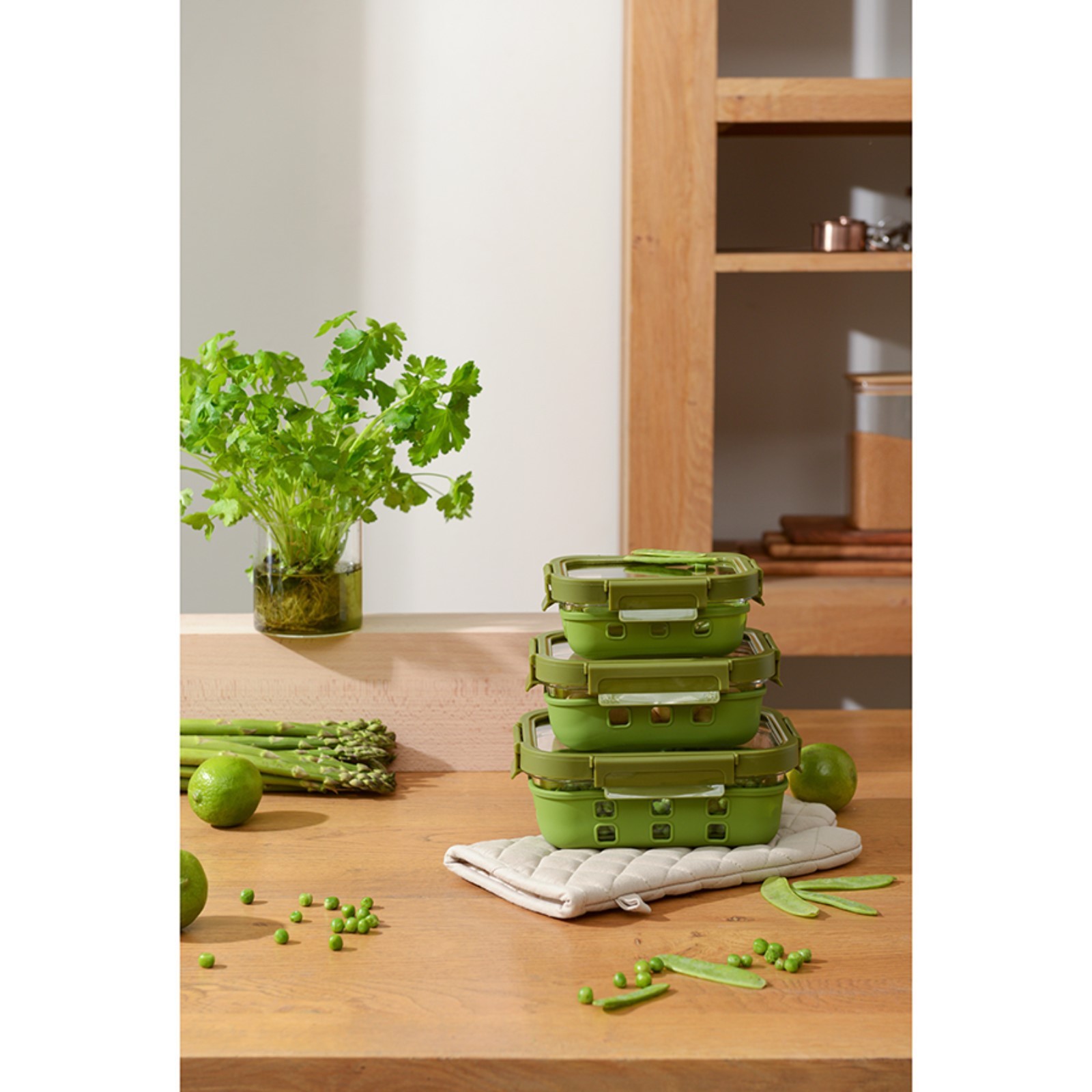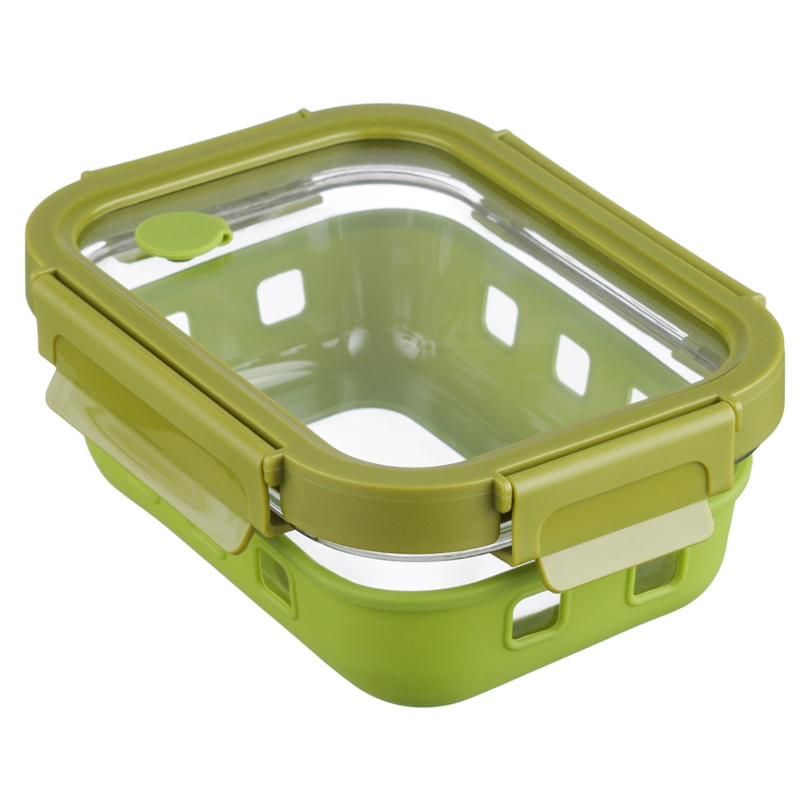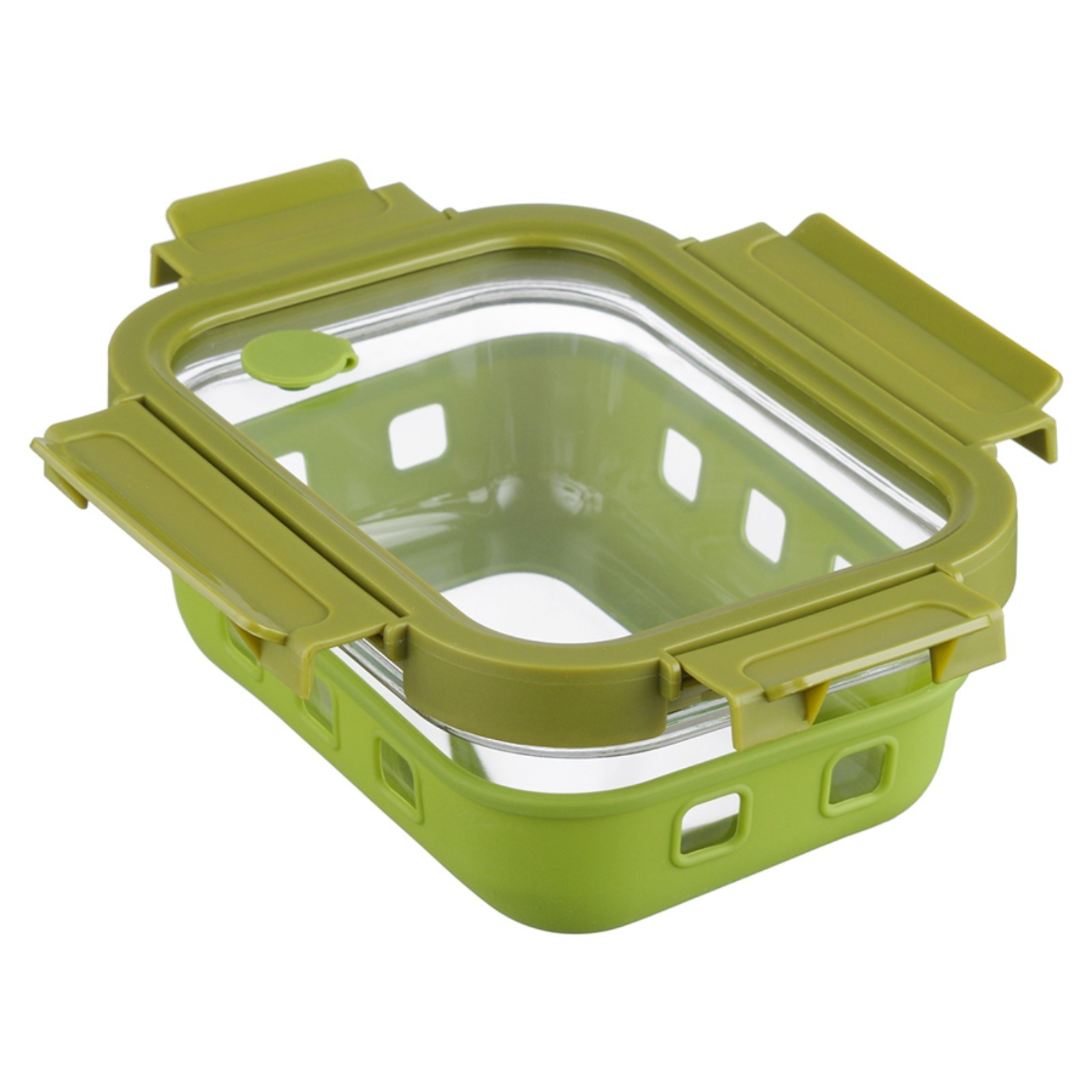 Контейнер для запекания, хранения и переноски продуктов в чехле smart solutions, цвет зелёный, 640 мл. — Контейнер стеклянный в чехле из силикона отлично подходит для хранения, запекания и транспортировки продуктов, в том числе готовых блюд. — Ёмкость из боросиликатного стекла не впитывает запахи и загрязнения, легко моется. — Крышка с надёжными пластиковыми замками на каждой стороне обеспечивает плотное закрывание. — Материалы не содержат бисфенол-А и являются абсолютно безопасными для здоровья. — Наличие специального вентиляционного отверстия позволяет выпустить лишний воздух или горячий пар, что повышает герметичность и улучшает условия хранения продуктов. — Силиконовый чехол без труда снимается для более тщательной очистки контейнера. Материалы: боросиликатное стекло, пластик, силикон. Объём: 640 мл. Цвет: зелёный. Можно мыть в посудомоечной машине, ставить в морозильную камеру и микроволновую печь. В духовке использовать без крышки при температуре до 560 градусов. Крышка с силиконовой прокладкой прослужит намного дольше, если очищать её вручную. Цвет: Зелёный Форма: Прямоугольная Объём, л: 0.64 Крышка: Да Материал: Боросиликатное стекло Материал: Силикон Материал: Пластик Герметичная крышка: Да Можно мыть в посудомоечной машине: Да Текстура: Гладкая Назначение: Универсальная Серия: Smart Solutions Серия: FineDesign Smart Solutions Форма: Прямоугольник Цвет крышки: Прозрачный  развернуть описание ▼