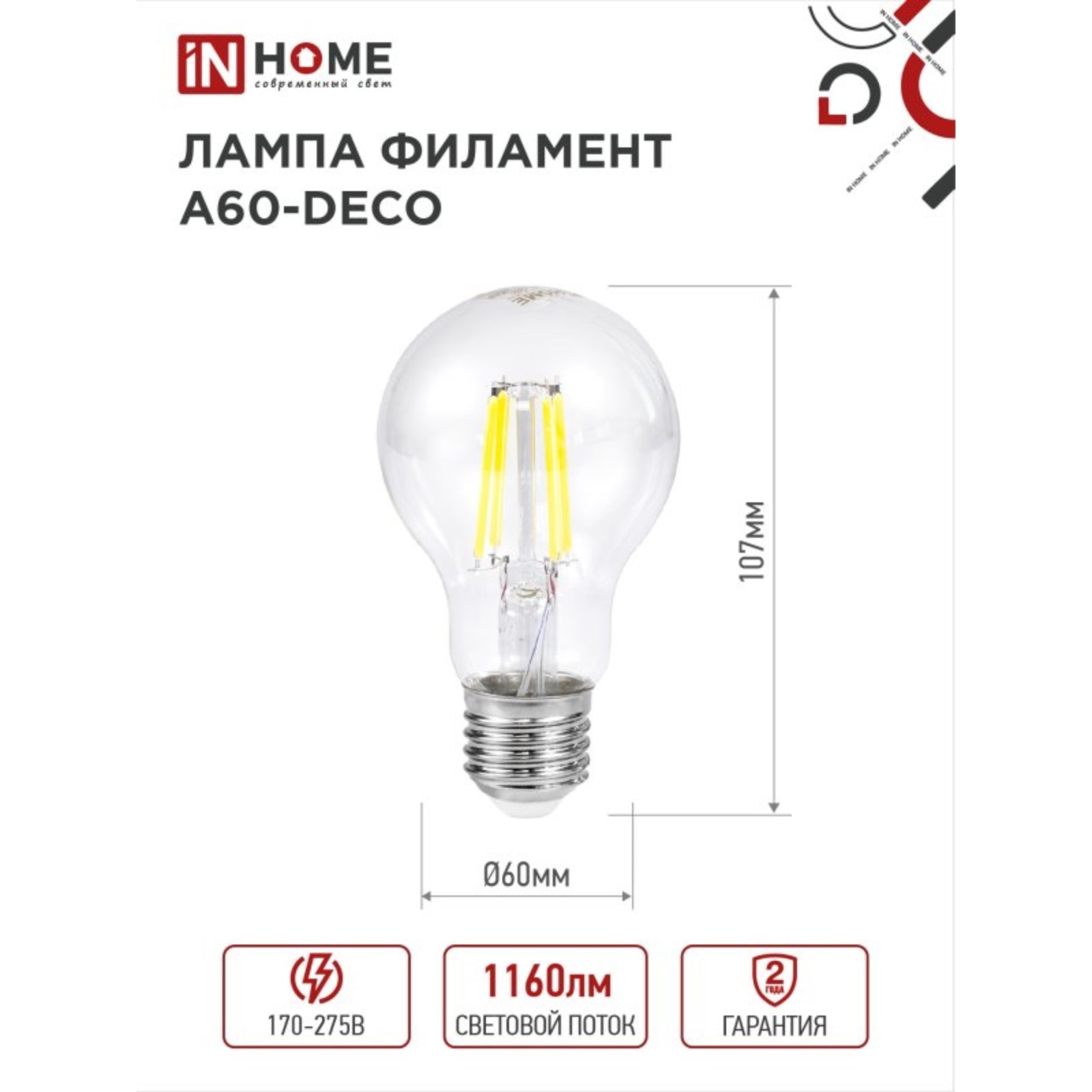 Лампа светодиодная In Home Led-a60-deco, 11 вт, 230 в, е27, 4000 к, 1160 лм, прозрачная