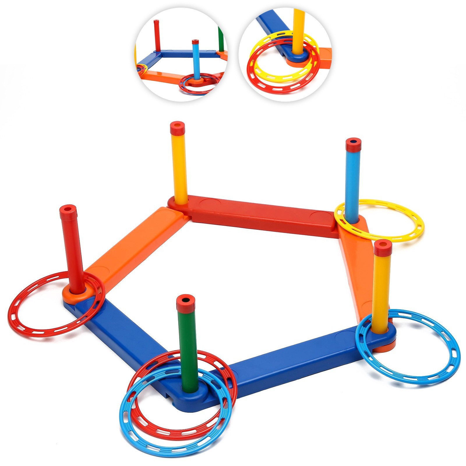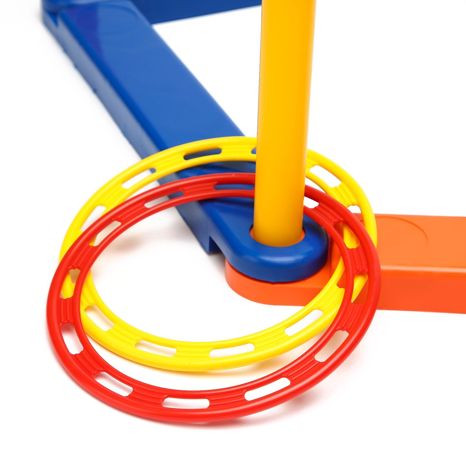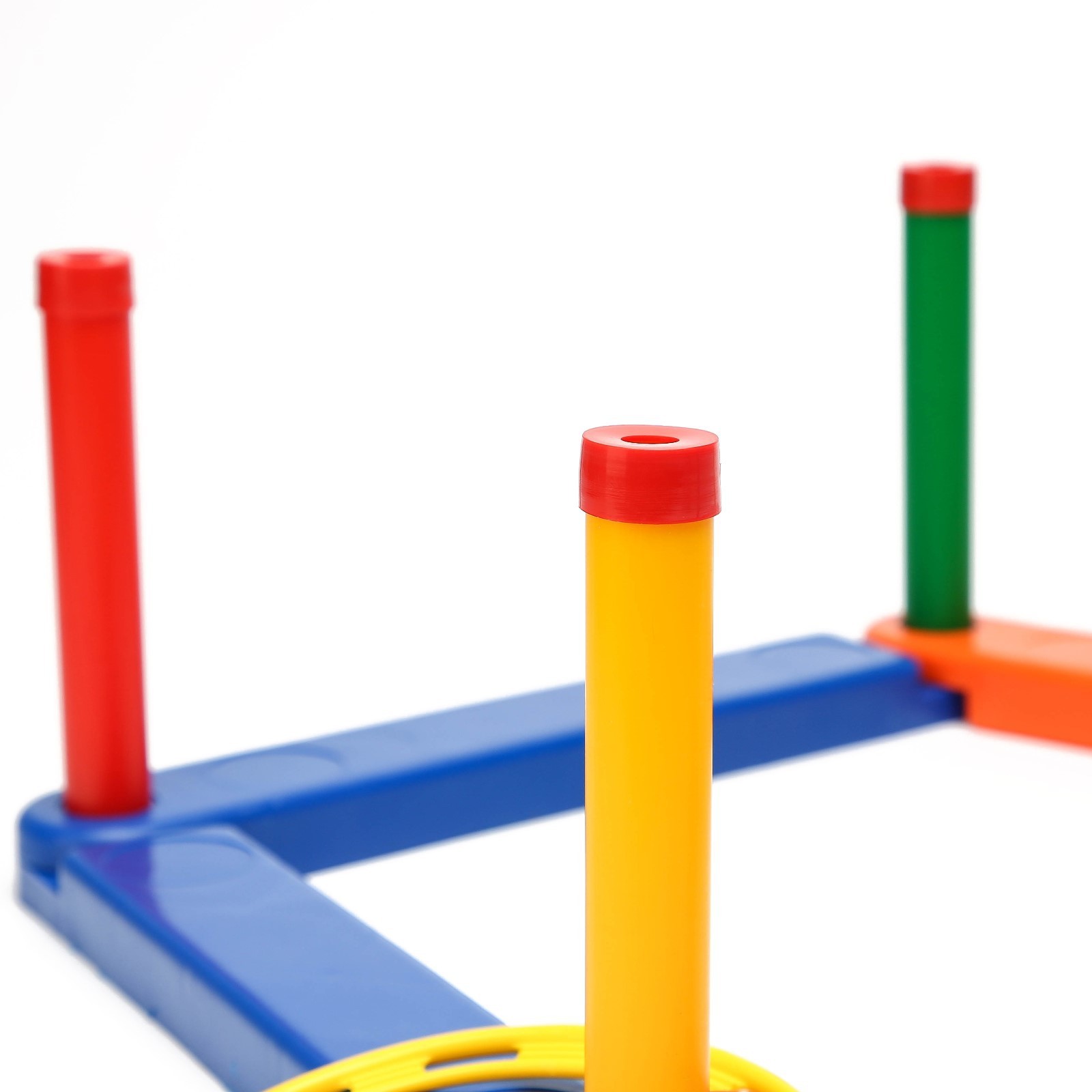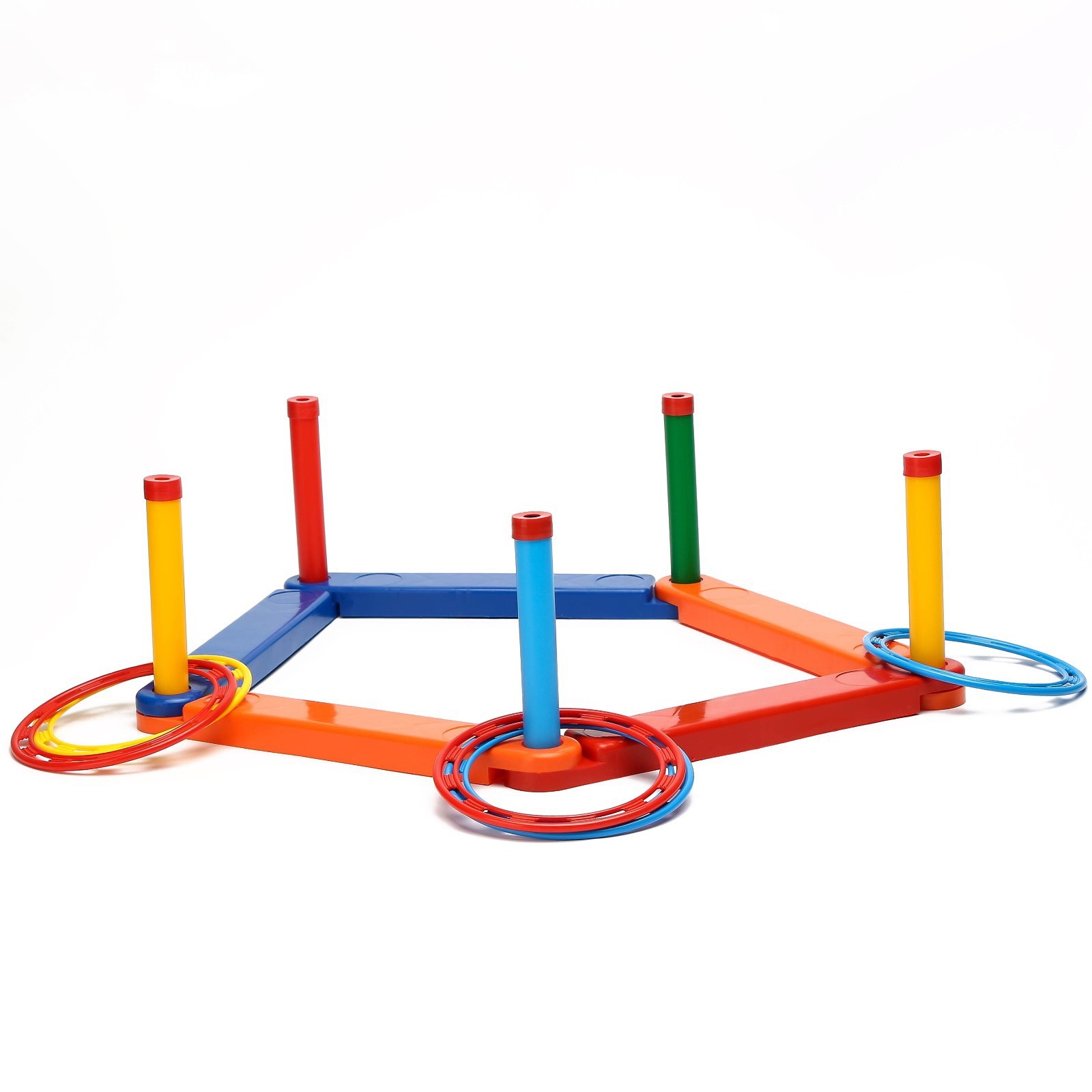 Кольцеброс, 5 стоек, 5 колец. Кольцеброс - отлично развивает меткость и ловкость, координацию движений и сноровку. Игроку необходимо не только определить траекторию броска, но и решить, с какой силой его нужно совершить, чтобы кольцо попало на стойку. Игра отлично подходит для семейных игр, детских праздников, развлечений на даче и корпоративов! Правила игры: Договоритесь, с какого расстояния будете бросать кольца, какие и по сколько штук. Сначала покажите ребенку, как это делается, начав с небольшого расстояния, а затем постепенно увеличивайте дальность броска. Можно играть как командами, так и «каждый сам за себя». Выигрывает тот игрок, который сделает большее количество попаданий. Вы можете установить свои правила игры (количество бросков, количество очков от попадания кольца на «свой» или «чужой» цвет, очередность попадания на стойки, бонусы за несколько попаданий подряд и т. д. ). Увлекательная игра станет отличным подарком малышам и более взрослым детям на день рождения, новый год или другой праздник. Играть можно в помещении или на улице, игру легко взять с собой на прогулку, пляж, на дачу, в загородный дом, на природу или пикник. Яркий тренажер ловкости, меткости, координации движений, концентрации внимания можно установить в детском саду, школе, в детском лагере, на уличной площадке. Возраст: От 3 лет Материал: Пластик Количество игроков: 2 - 4 игрока Температурное ограничение: Нет Назначение: Для улицы Вид игры: Кольцеброс Вид: Кольцеброс  развернуть описание ▼
