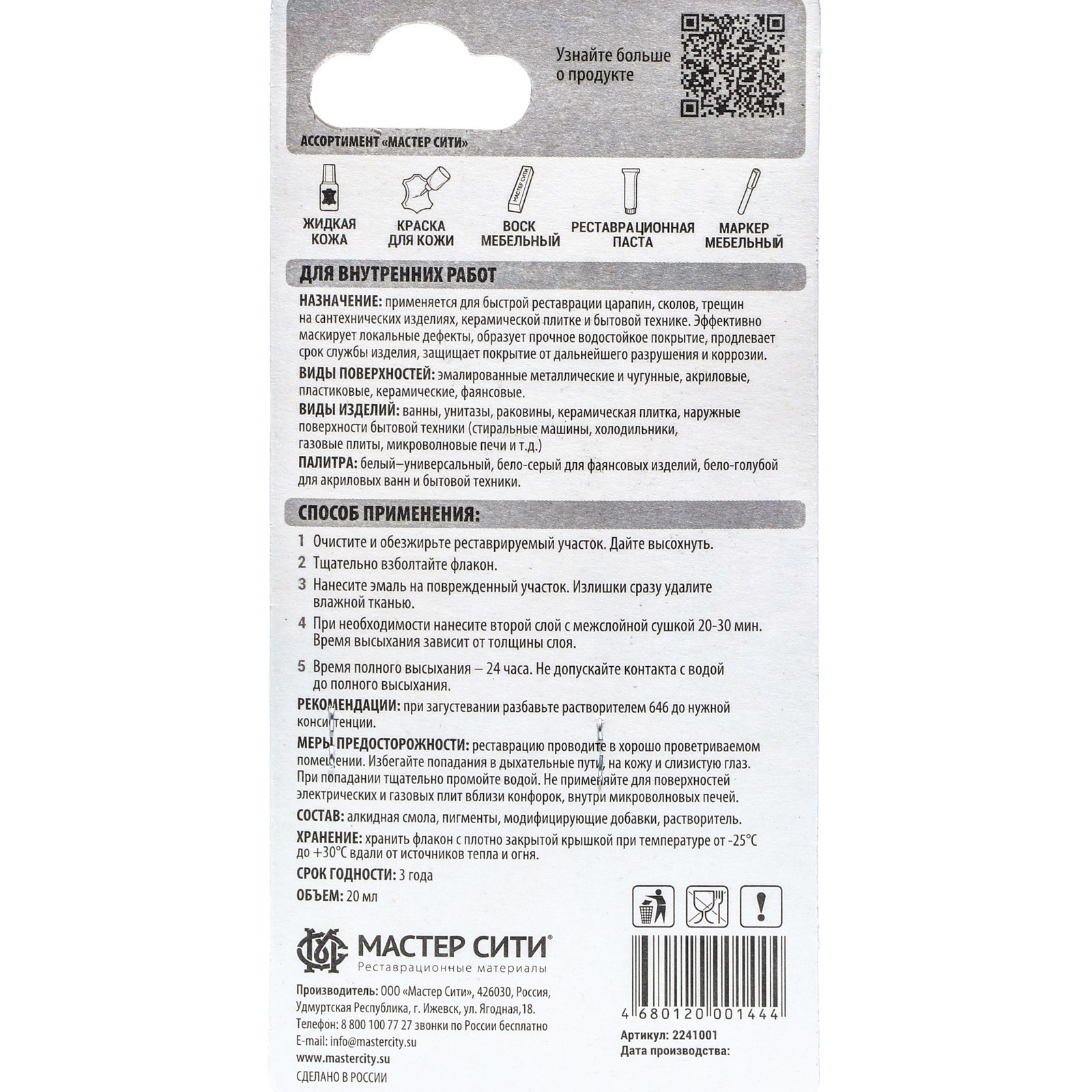 Эмаль "мастер сити" для ванн, сантехники и бытовой техники белый №001. Универсальная эмаль ведущего российского производителя реставрационных материалов «Мастер Сити» - это быстрая и качественная реставрация в домашних условиях. Применяйте для закрашивания и заполнения царапин, сколов, трещин на эмалированных металлических и чугунных поверхностях, а также акриле, пластике, керамике, фаянсе. Эмаль подходит для ванн, унитазов, раковин, керамической плитки, стиральных машин, холодильников, электрических и газовых плит, микроволновых печей и другой бытовой техники. Эмаль проста в использовании и не требует профессиональных навыков. При нанесении ложится ровным слоем, не стекает с вертикальных поверхностей. После затвердевания образуется гладкое, прочное покрытие, устойчивое к воздействию воды и бытовой химии. Эмаль эффективно маскирует локальные дефекты, продлевает срок службы изделия, защищает покрытие от дальнейшего разрушения и коррозии. Объём, мл: 20 Температурное ограничение: Нет  развернуть описание ▼