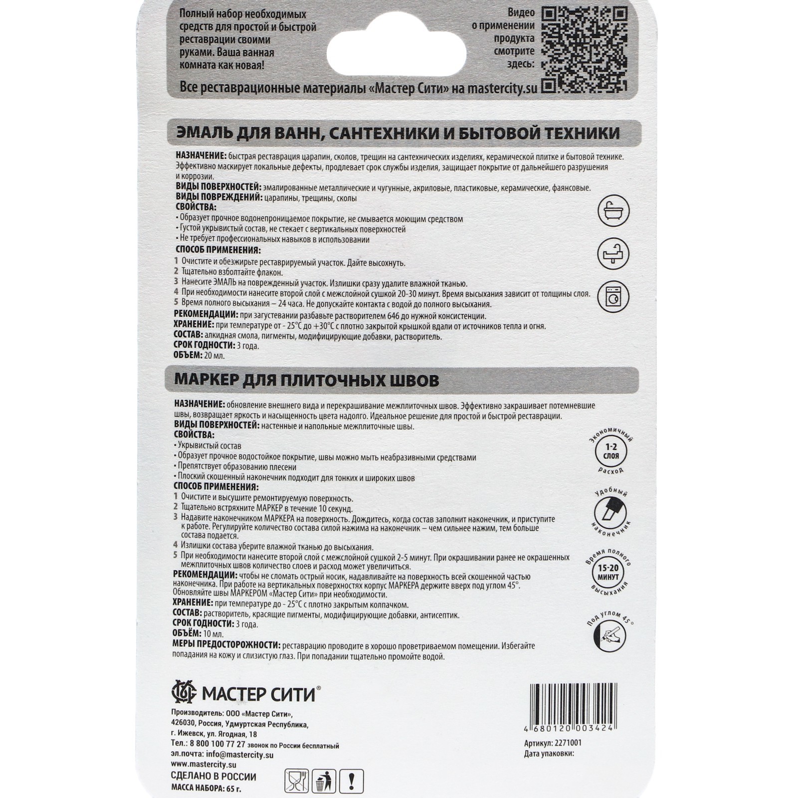 Набор для ремонта ванной "мастер сити". Набор применяется для простого и быстрого обновления ванной комнаты. МАРКЕР ДЛЯ ПЛИТОЧНЫХ ШВОВ эффективно закрашивает потемневшие швы, образует водостойкое покрытие, препятствует возникновению плесени. Используйте белый корректор для затирки настенных и напольных швов плитки. Перед использованием тщательно встряхните маркер, надавите на стержень. ВАЖНО дождаться, когда красящий состав заполнит наконечник. Маркер для затирки плитки водостойкий, устойчив к истиранию, обладает высокой укрывистостью и экономичным расходом. Удобный скошенный наконечник позволяет закрашивать швы шириной от 1 до 5 мм. ЭМАЛЬ ДЛЯ ВАНН маскирует дефекты, продлевает срок использования изделия, защищает от разрушения и коррозии. Универсальная эмаль ложится ровным слоем, не стекает с вертикальных поверхностей, образует гладкое, прочное, водонепроницаемое покрытие, не смывается моющим средством. Применяйте для ремонта ванны, унитазов, раковин, керамической плитки. Состав: Растворитель, красящие пигменты, модифицирующие добавки, антисептик. parts count: 0 Объём, мл: 10 Температурное ограничение: Нет  развернуть описание ▼