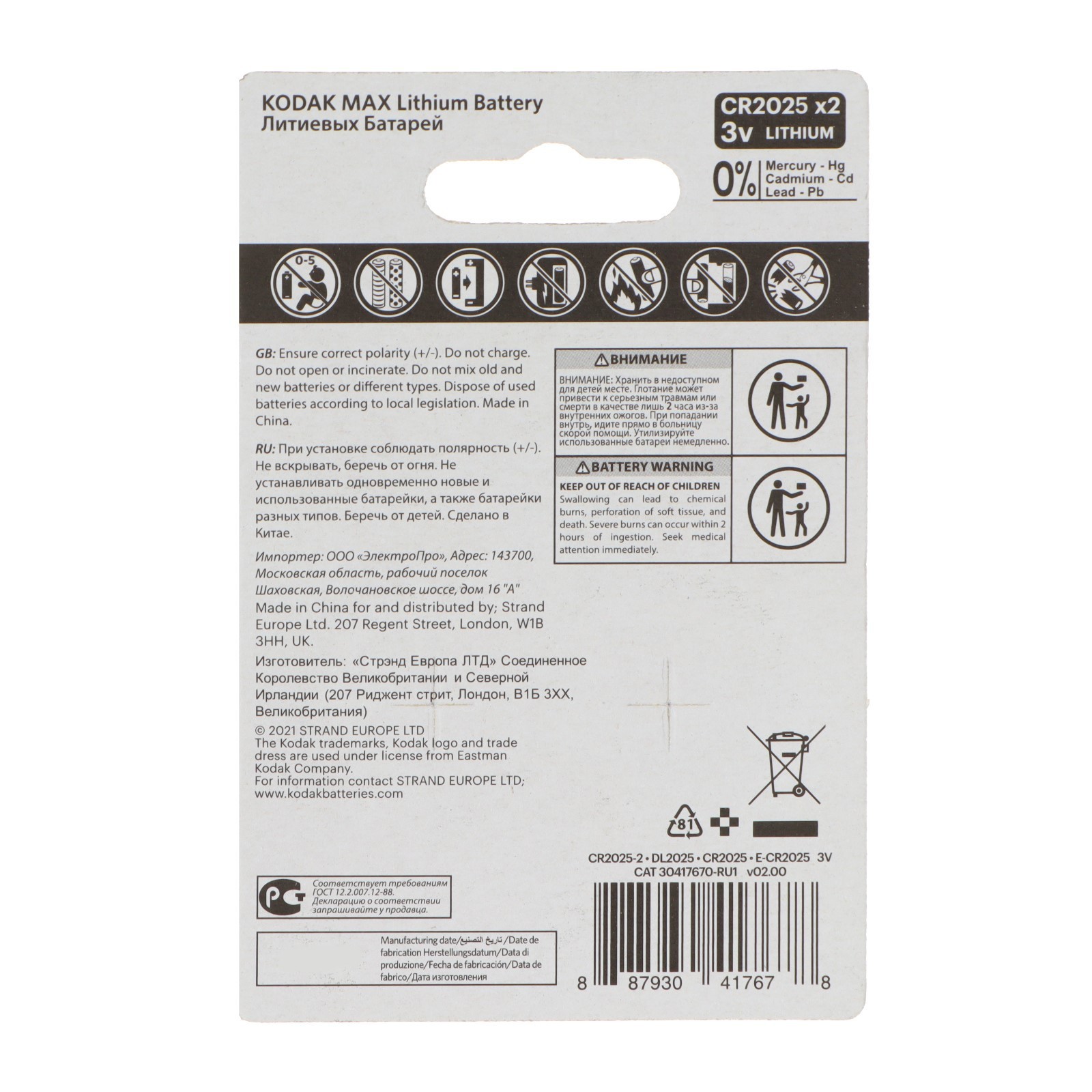 Батарейка литиевая Kodak, Cr2025-2bl, 3в, блистер, 2 шт.