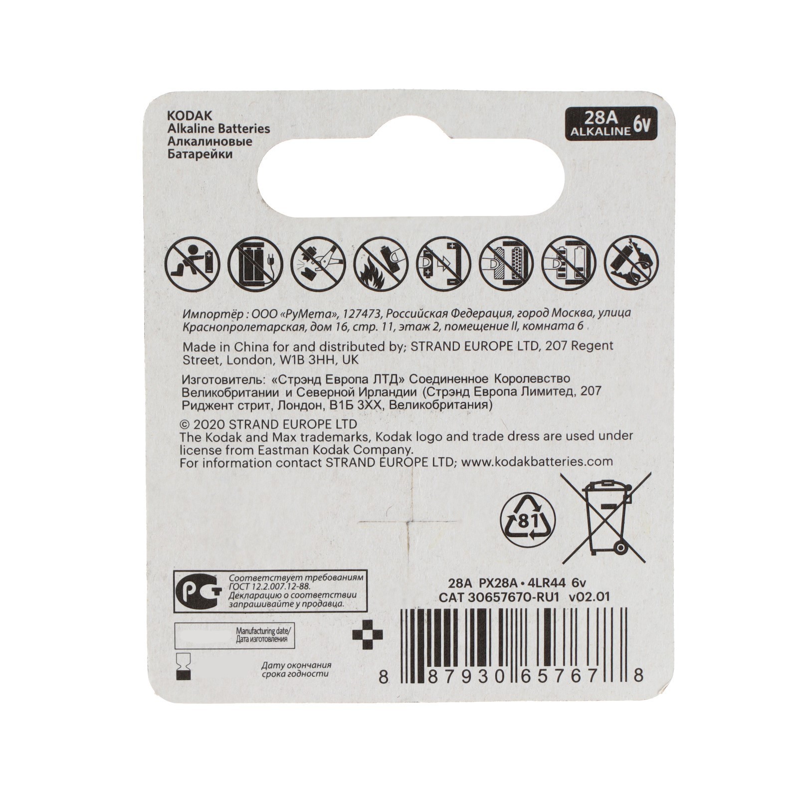 Батарейка алкалиновая Kodak Max Super, 28a (k28a-1/4lr44) -1bl, 6в, блистер, 1 шт.