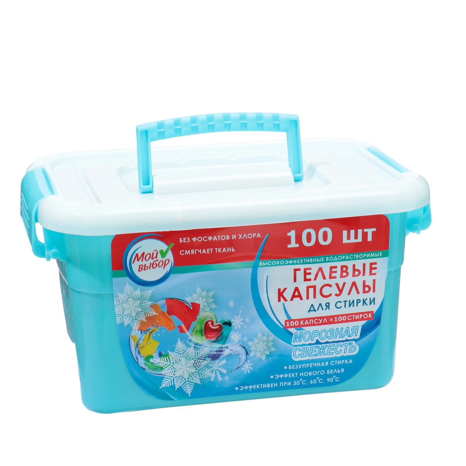Капсулы для стирки, 3в1, морозная свежесть, 13г*100шт. Специальная формула содержит компоненты, которые сохраняют цвет. Средство бережно отстирывает загрязнения, защищает структуру и придает свежесть одежде. Предназначено для использования стиральных машинах-автоматах в воде любой жесткости. Рекомендовано: для стирки изделий из х/б, льняных, синтетических тканей и тканей из смешанных волокон (кроме шерсти и шелка). Не содержит: фосфатов, хлорных соединений, агрессивных химикатов и этилового спирта. Перед использованием ознакомиться с инструкцией по применению и мерами предосторожности. Способ применения: Брать капсулу сухими руками! Не прокалывать, не разрывать, не надрезать! 100% водорастворимая пленка. Капсула помещается непосредственно барабан стиральной машины перед загрузкой белья: 1 капсула используется 4-5 кг сухого белья, для более 5 кг или при сильном загрязнении использовать 2 капсулы. Соблюдать рекомендации для стирки, указанные на бирке одежды (изделия из ткани). Не применять режим замачивания и предварительную стирку. Не рекомендуется использовать для режимов автоматической стирки длительностью менее 40 минут. Рекомендованная температура стирки - от +25 С до +90 С. В случае обнаружения остатков средства на ткани - ополоснуть теплой водой. Плотно закрывать упаковку после каждого использования. Условия хранения: Хранить, оставлять в таре изготовителя в сухом, недоступном для детей месте, защищенном от прямых солнечных лучей, негативных воздействий месте, вдали от продуктов питания, напитков, корма для животных при температуре от +5 С°до+35 С. Состав: ПАВ 25%, стабилизатор, ферменты, отдушка (ароматизатор), энзимы, краситель менее 5%. Меры предосторожности: Осторожно! Беречь от детей! Не использовать для ручной стирки, мытья рук или посуды. Объём, л: 1.3 Назначение: Для всех видов тканей Вид стирки: Автомат Количество компонентов: 3  развернуть описание ▼