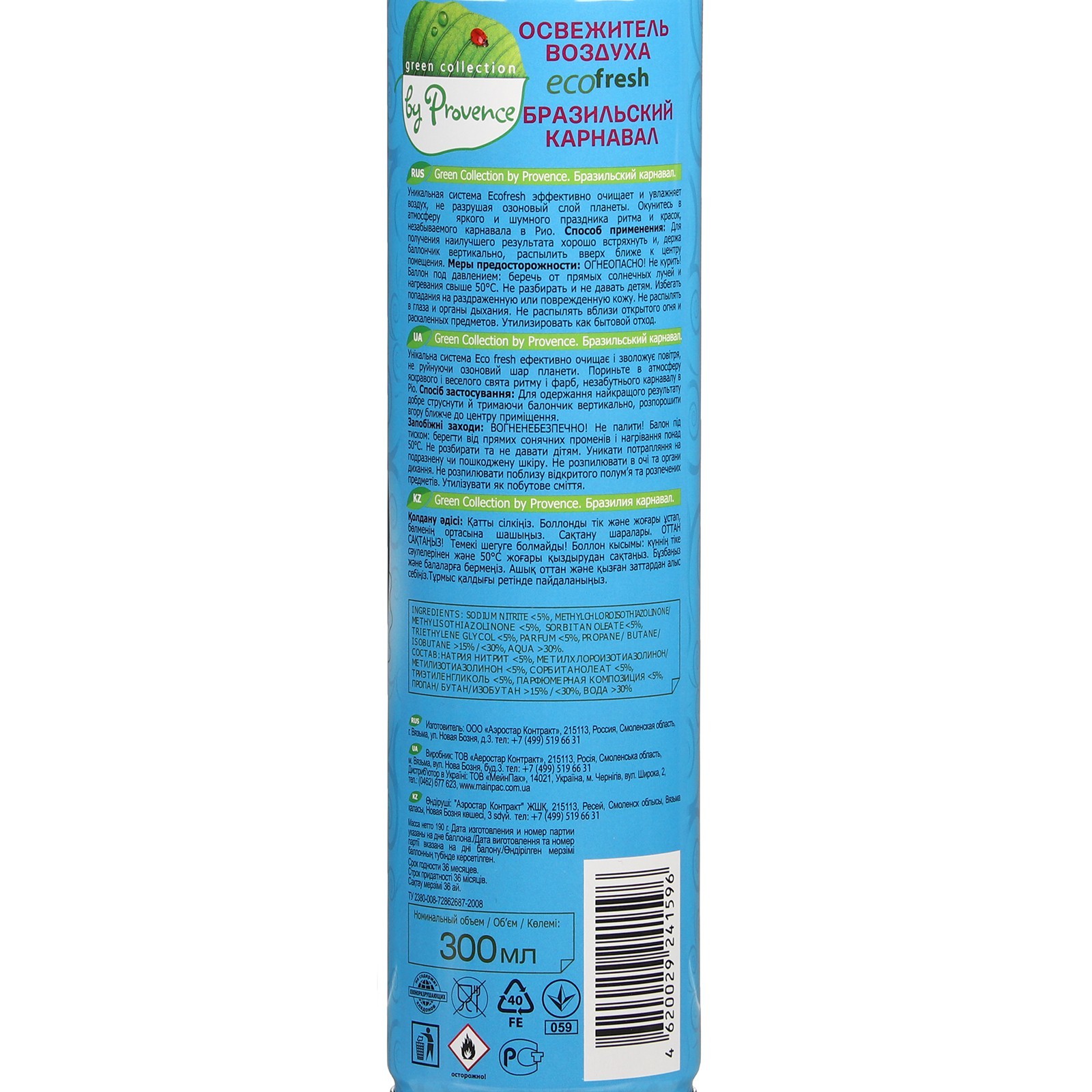 Освежитель воздуха в аэрозольной упаковке серии «green collection by provence», бразильский карнавал.   Освежитель воздуха Green Collection by Provence, сухое распыление, 300 мл.  Сухое распыление позволяет сохранить аромат на длительное время, не оставляет следов на кафельной плитке, потолке, обоях и гардинах. Обладает ярко выраженным действием против запаха табачного дыма. Подарите себе настроение и и приятные эмоции с помощью чарующих ароматов, отобранных нами с огромной любовью. Преобразите свой дом незабываемым благоуханием природы - Вы сами можете выбрать его атмосферу: спокойную и романтичную или яркую и жизнерадостную! parts count: 0 Объём, мл: 300 Аромат: Свежесть Форма выпуска: Аэрозоль Принцип работы: Ручной Вид распыления: Сухое Температурное ограничение: Нет Тип: Освежитель воздуха  развернуть описание ▼
