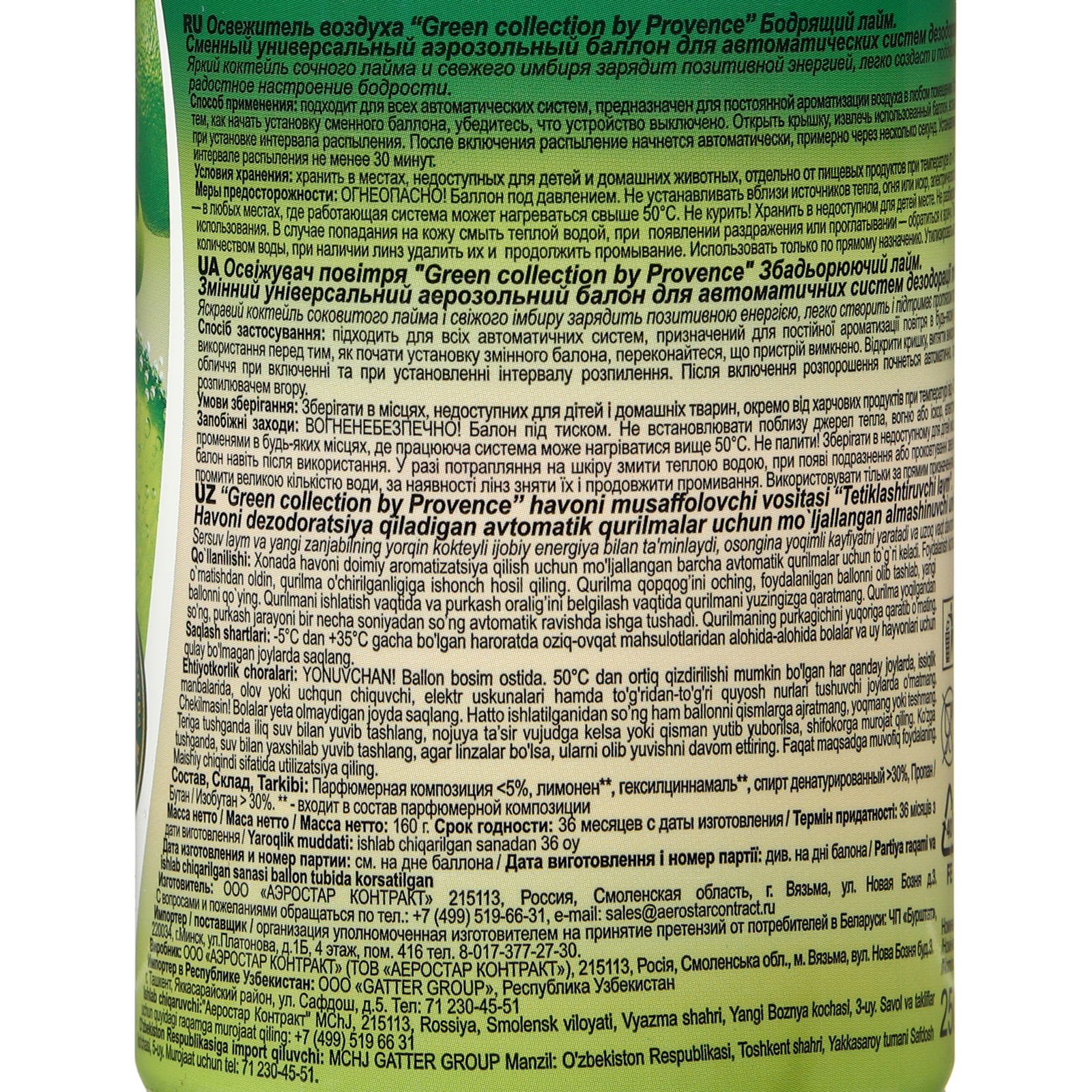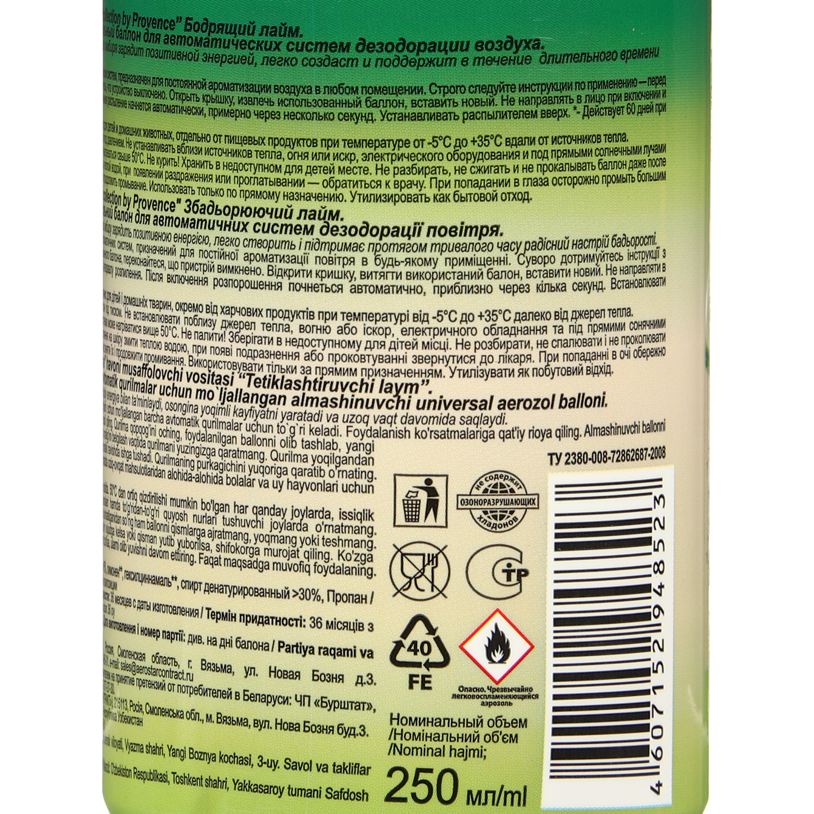 Освежитель воздуха «green collection by provence»: «бодрящий лайм», универсальный сменный баллон. Освежитель воздуха «Green collection by Provence», сменный баллон. "Сухое распыление" позволяет сохранить аромат на длительное время, не оставляет следов на кафельной плитке, потолке, обоях и гардинах. Обладает ярко выраженным действием против запаха. Экзотический аромат восстановит душевную гармонию и создаст атмосферу спокойствия и безмятежности в Вашем доме. СПОСОБ ПРИМЕНЕНИЯ: Подходит для всех автоматических систем, предназначен для постоянной ароматизации воздуха в любом помещении. Строго следуйте инструкции по применению - перед тем, как начать установку сменного баллона, убедитесь, что устройство выключено. Откройте крышку прибора, извлеките использованный баллон, вставьте новый. Не направляйте в лицо при включении и при установке интервала распыления. После включения распыление начнется автоматически, примерно через несколько секунд. Устанавливать распылителем вверх. Объём, мл: 250 Аромат: Лайм Форма выпуска: Аэрозоль Принцип работы: Автоматический Вид распыления: Сухое Температурное ограничение: Нет Тип: Сменный баллон  развернуть описание ▼