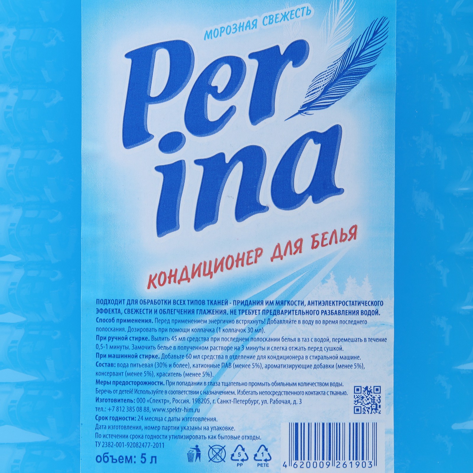 Кондиционер для белья perina "морозная свежесть", 5 л.   Кондиционер для белья Perina (Перина) "Морозная свежесть", 5 л.  Кондиционер для белья Perina «Морозная свежесть» подходит для всех типов тканей. Придает мягкость и свежесть, облегчает процесс глажения, обладает антиэлектростатическим эффектом. Не требует предварительного разбавления водой.  Состав: 5-15% Катионные ПАВ, <5% Неионогенные ПАВ, Ароматизирующие Добавки, Бензилсалицилат, Гексилкоричный Альдегид.  Объём, л: 5 Аромат: Морозная свежесть Назначение: Для белых тканей : 0 Температурное ограничение: Нет Особенности средства: Антистатический эффект  развернуть описание ▼