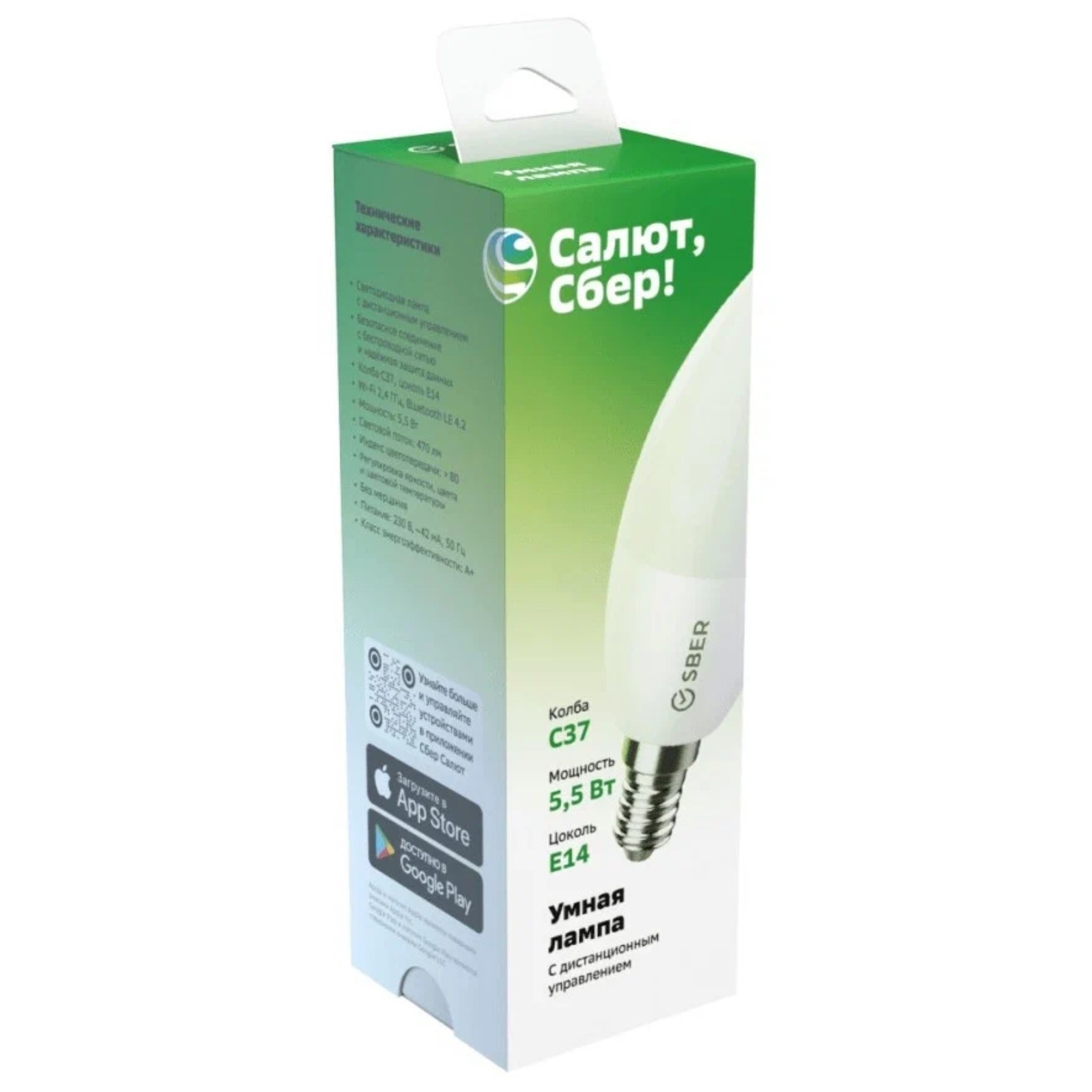 Умная лампа sber c37 sbdv-00020, e14, 5.5 вт, 470 лм, wi-fi, цветная, регулировка. Цвет свечения: RGB Вид лампы: Светодиодная Цоколь: E14 Мощность, Вт: 5.5 Световой поток, лм: 470 Форма лампы: Свеча Беспроводные интерфейсы: Wi-Fi Температурное ограничение: Нет Цветовая температура, К: 2700 - 6500 Управление со смартфона: Да Голосовой помощник: Салют Экосистема: Сбер  развернуть описание ▼