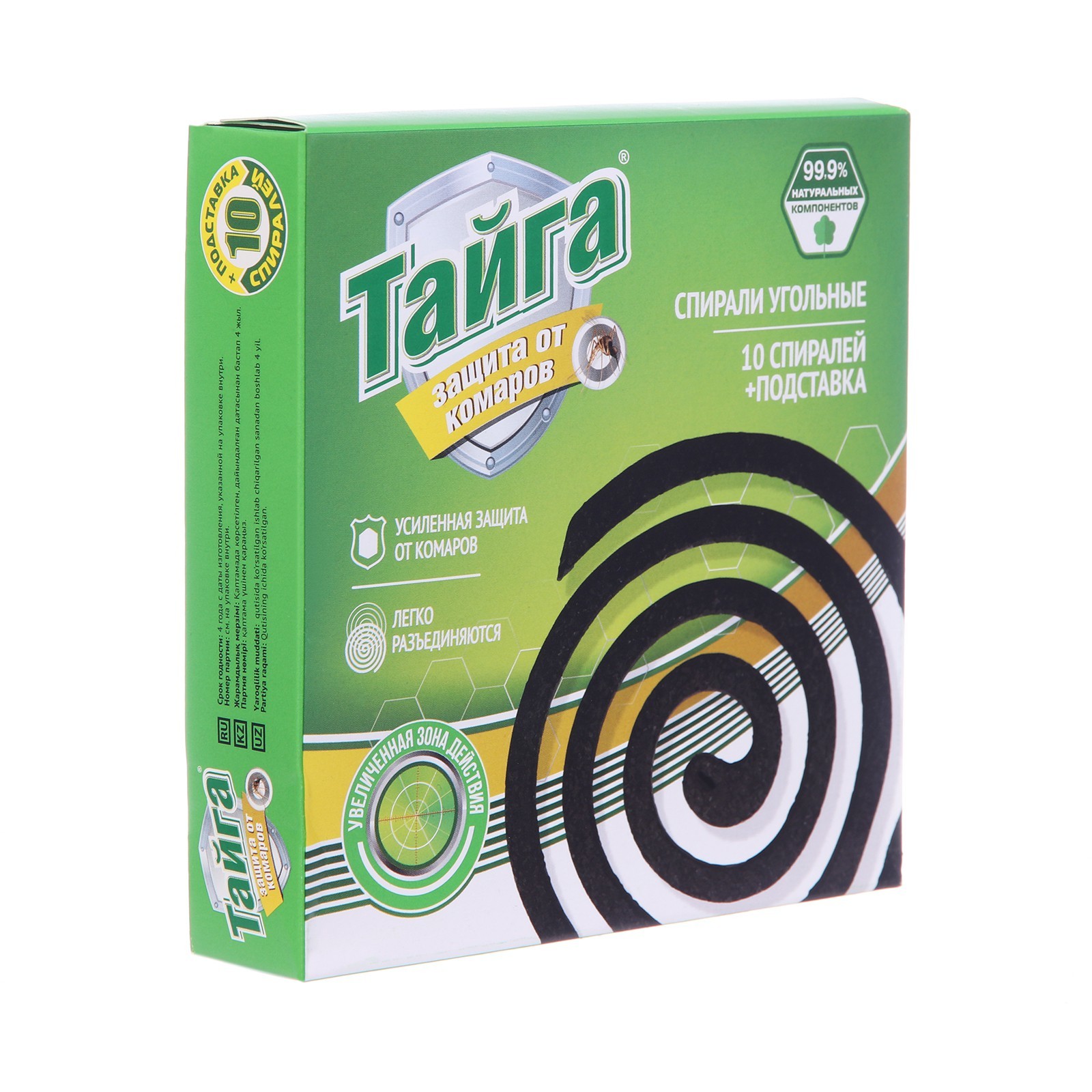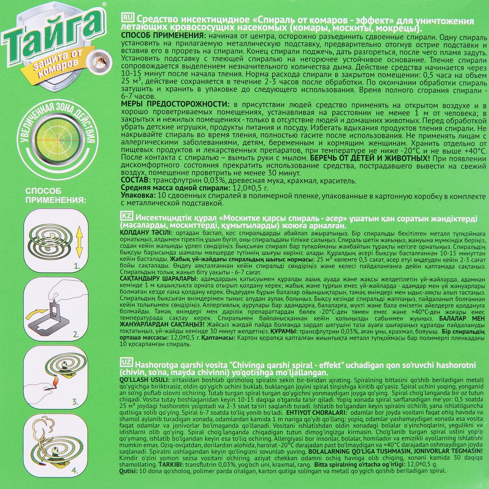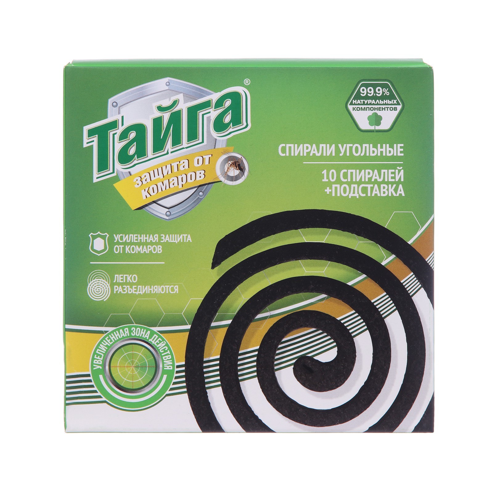 Спирали от комаров "тайга", угольные, 10 шт.. Угольные спирали от комаров Тайга предназначены для уничтожения летающих насекомых (комары, мошки, мокрецы, москиты). Спирали Тайга — оптимальное средство для защиты от комаров на открытом воздухе и в хорошо проветриваемых помещениях. Лучший вариант для отдыха на природе, в походе, на рыбалке или пикнике. Способ примененияначиная от центра, осторожно разъединить сдвоенные спирали. Одну спираль установить на прилагаемую металлическую подставку, предварительно отогнув острие подставки и вставив его в прорезь на спирали. Конец спирали поджечь, дать разгореться, после чего пламя задуть. Установить подставку с тлеющей спиралью на негорючее устойчивое основание. Тление спирали сопровождается выделением незначительного количества дыма, который отпугивает комаров. В процессе испарения действующего вещества его концентрация в воздухе возрастает, комары дезориентируются и погибают. Действие средства начинается через 10-15 минут после начала тления. По окончании обработки спираль затушить и хранить в упаковке до следующего использования. Время полного сгорания спирали: 6-7 часов. Состав: ДВ-трансфлутрин (0, 03%), древесная уголь >30%, крахмал 15-30%. Вид средства: Спирали, стержни Температурное ограничение: Нет Тип средства: Репеллент  развернуть описание ▼
