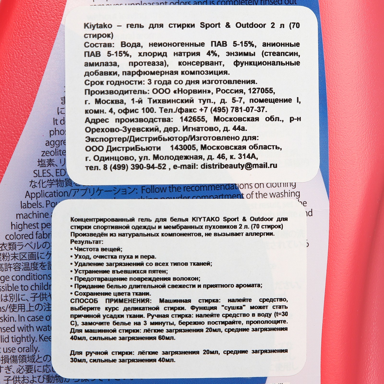 Жидкое средство для стирки kiytako для спортивной одежды, 2 л. Гель-концентрат Kiytako Sport & Outdoor предназначен для бережной и эффективной стирки спортивной одежды и изделий из мембранных и технологических тканей. Гель сохраняет все первоначальные свойства мембранных тканей - воздухопроницаемость, специальные пропитки, водоотталкивающие свойства. Он легко справляется с большинством загрязнений, удаляет неприятные запахи и полностью смывается, не оставляя разводов на одежде. Сохраняет первоначальный цвет и мягко очищает волокна ткани, обладая нежным нейтральным ароматом. Не содержит фосфатов и агрессивных химических веществ: хлора, - фосфатов, оптических отбеливателей, создающих иллюзию чистоты, агрессивных поверхностно-активных веществ, SLES, EDTA, нефтепродуктов, синтетических цеолитов, парабенов. Способ применения: Следуйте рекомендациям на этикетках одежды. Налейте гель в отсек для стирального порошка стиральной машины машину в соответствии с указанной дозировкой. Для достижения наилучшего результата установите максимально допустимую температуру, указанную на изделии lalel для стирки белых и цветных тканей отдельно. Условия хранения: Хранить при температуре от +5 до +30 °C в недоступном для детей и домашних животных месте, отдельно от продуктов питания. Состав Вода, неионогенные поверхностно-активные вещества 5-15%, анионные поверхностно-активные вещества 5-15%, хлорид натрия 4%, ферменты, консервант, функциональные добавки, парфюмерная композиция. Объём, л: 2 Назначение: Для спортивной одежды Вид стирки: Для всех видов стирки : 0 Температурное ограничение: Нет  развернуть описание ▼