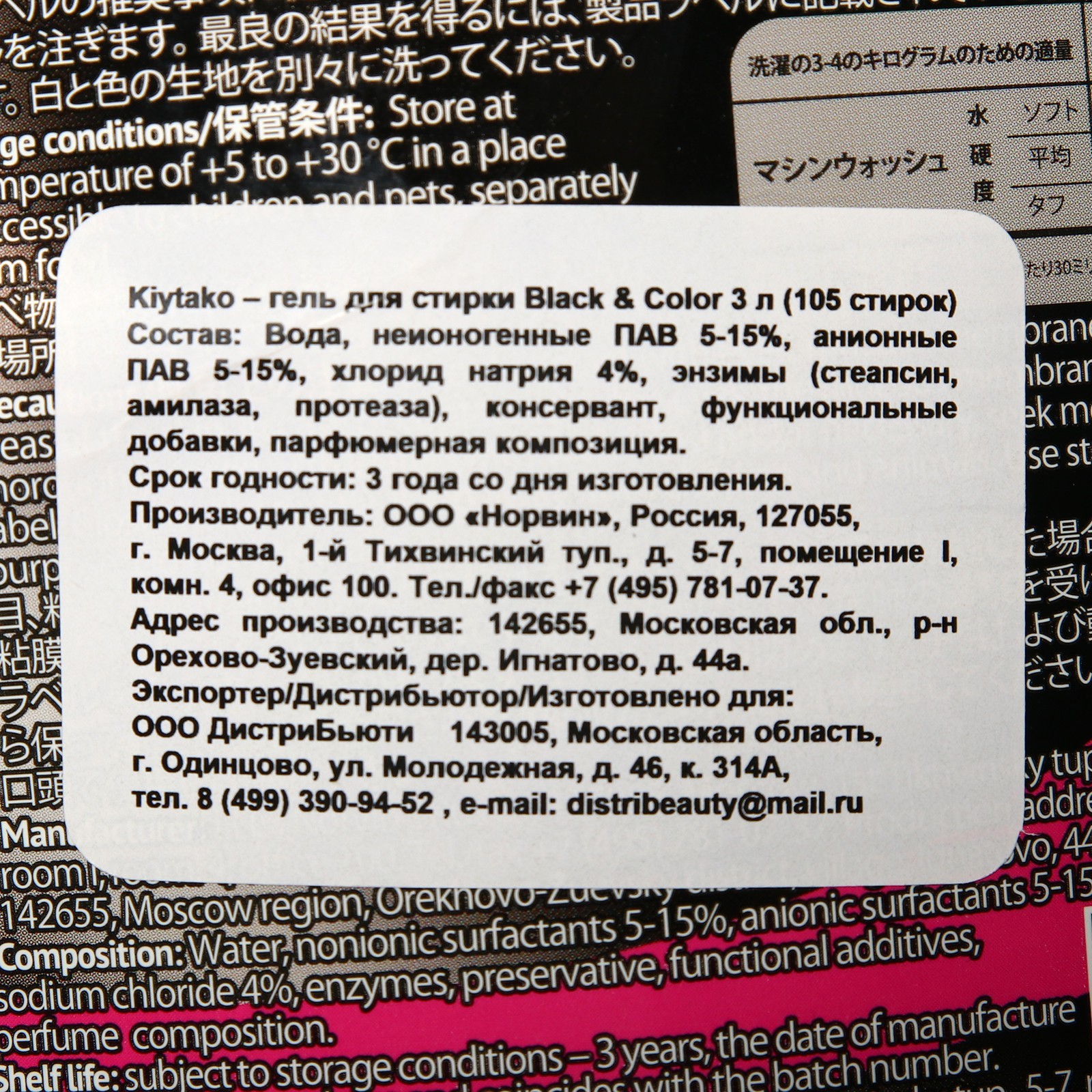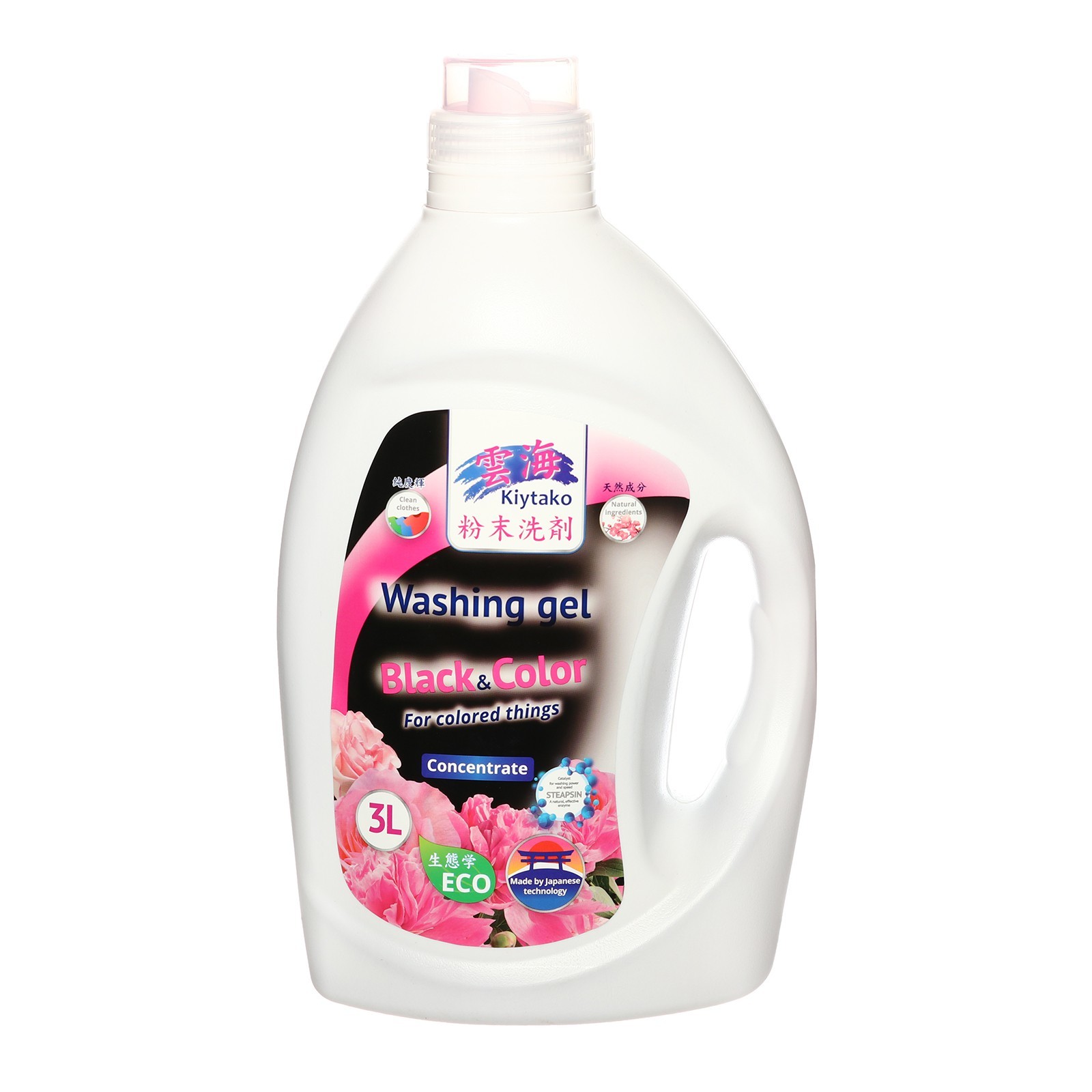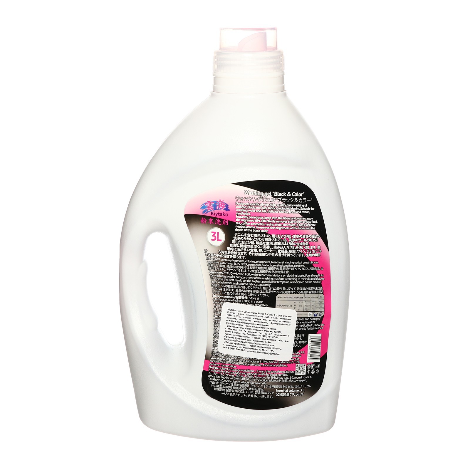 Жидкое средство для стирки kiytako для черного и цветного белья, 3 л. Kiytako Black & Color Гель разработан специально для высококачественной ежедневной стирки цветных, черных и темных тканей, включая деним. Подходит для стирки шерсти и шелка, деликатных тканей, льна и хлопка, синтетики. Мгновенно проникает глубоко в волокна и смывает въевшуюся грязь, эффективно удаляет пятна от жирной пищи, чая, кофе, косметики, смол, вина, шоколада. Он обладает нежным нейтральным ароматом. Сохраняет яркость ткани и глубину черного цвета. Не содержит фосфатов, хлора, фосфорнокислых веществ, отбеливателей (в том числе оптические), силикаты, агрессивные поверхностно-активные вещества, SLES, ЭДТА, нефтепродукты, синтетические цеолиты, парабены. Концентрированный гель для черного и цветного белья KIYTAKO Black&Color произведён из натуральных компонентов, не вызывает аллергии. Результат: • Чистота вещей; • Сохранение цвета вещей; • Удаление пятен и загрязнений; • Свежесть и мягкость белья. • Устранение неприятного запаха. СПОСОБ ПРИМЕНЕНИЯ: Машинная стирка: налейте средство, выберите курс деликатной стирки. Функция "сушка" может стать причиной усадки ткани. Ручная стирка: налейте средство в воду (t=30 С), замочите белье на 3 минуты, бережно постирайте, прополощите. Для машинной стирки: лёгкие загрязнения 20мл, средние загрязнения 40мл, сильные загрязнения 60мл. Для ручной стирки: лёгкие загрязнения 20мл, средние загрязнения 30мл, сильные загрязнения 40мл. Состав Вода, неионогенные поверхностно-активные вещества 5-15%, анионные поверхностно-активные вещества 5-15%, хлорид натрия 4%, ферменты, консервант, функциональные добавки, парфюмерная композиция. Объём, л: 3 Назначение: Для чёрных тканей Назначение: Для цветных тканей Вид стирки: Для всех видов стирки : 0 Температурное ограничение: Нет  развернуть описание ▼