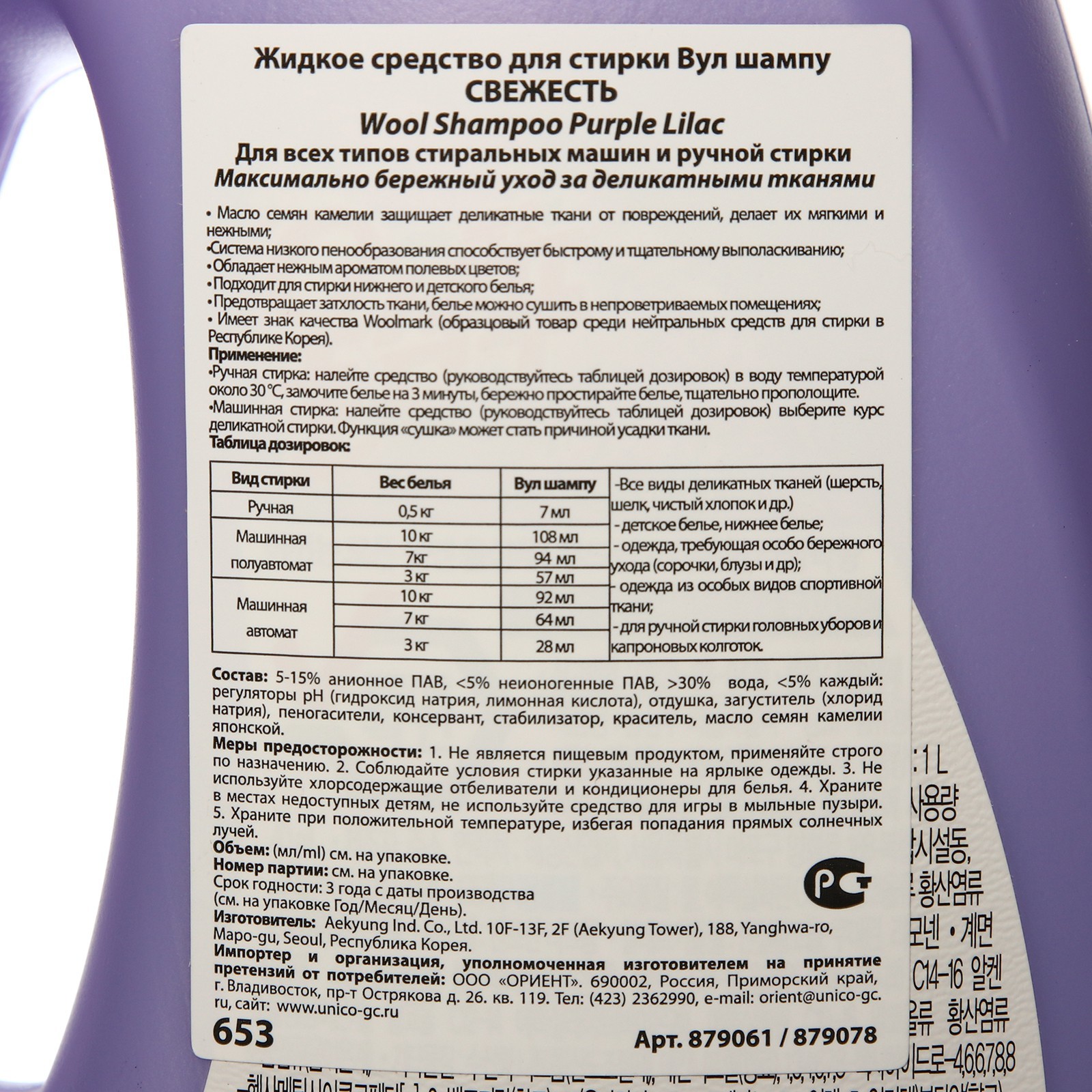 Жидкое средство для стирки wool shampoo, 1 л. Сохраняет цвет и форму, вещи выглядят как новые Входящий в состав комплекс DMBA предотвращает линьку вещей при стирке и обеспечивает полную защиту цвета Гипоаллергенно. Подходит для стирки детского и нижнего белья Защищает ткань от появления излишней ворсистости и предотвращает образование катышков. Состав: деионизированная вода, этиленгликоль моностеарат, дистеарат этиленгликоль, альфаолефин сульфонат, гидроксид натрия, хлорид натрия, мочевина, борная кислота, миристиновая кислота, отдушка, краситель, энзимы, стабилизатор, лауретсульфат натрия, консерванты. Назначение: для нижнего белья, для детского белья, для черных и темных тканей, для белого белья. Объём, л: 1 Назначение: Для всех видов тканей Вид стирки: Для всех видов стирки : 0 Температурное ограничение: Нет  развернуть описание ▼