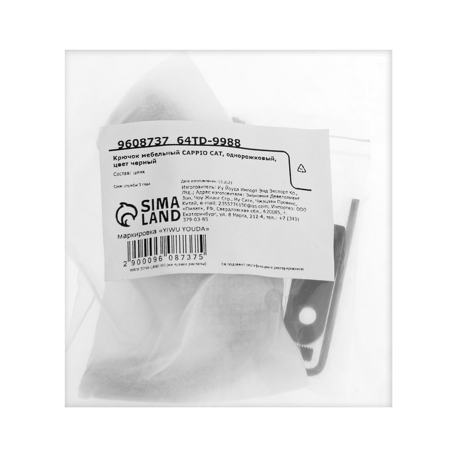 Крючок мебельный Cappio Cat, однорожковый, черный