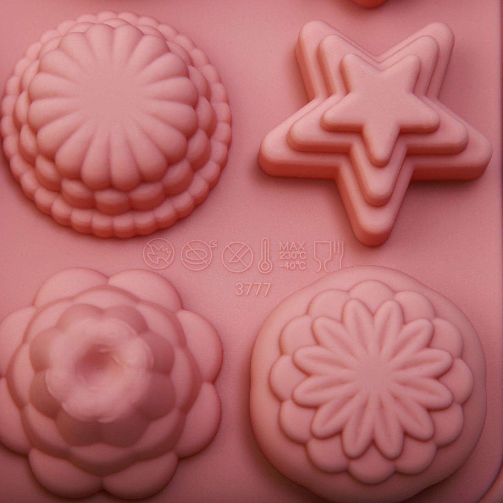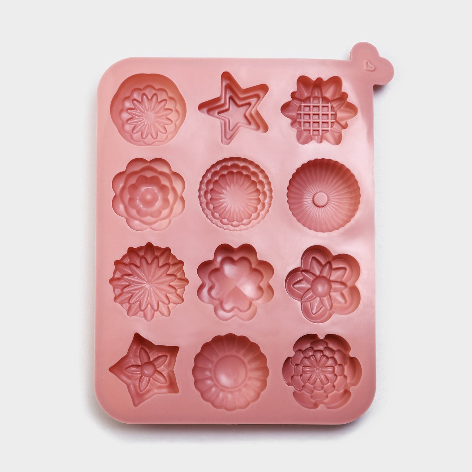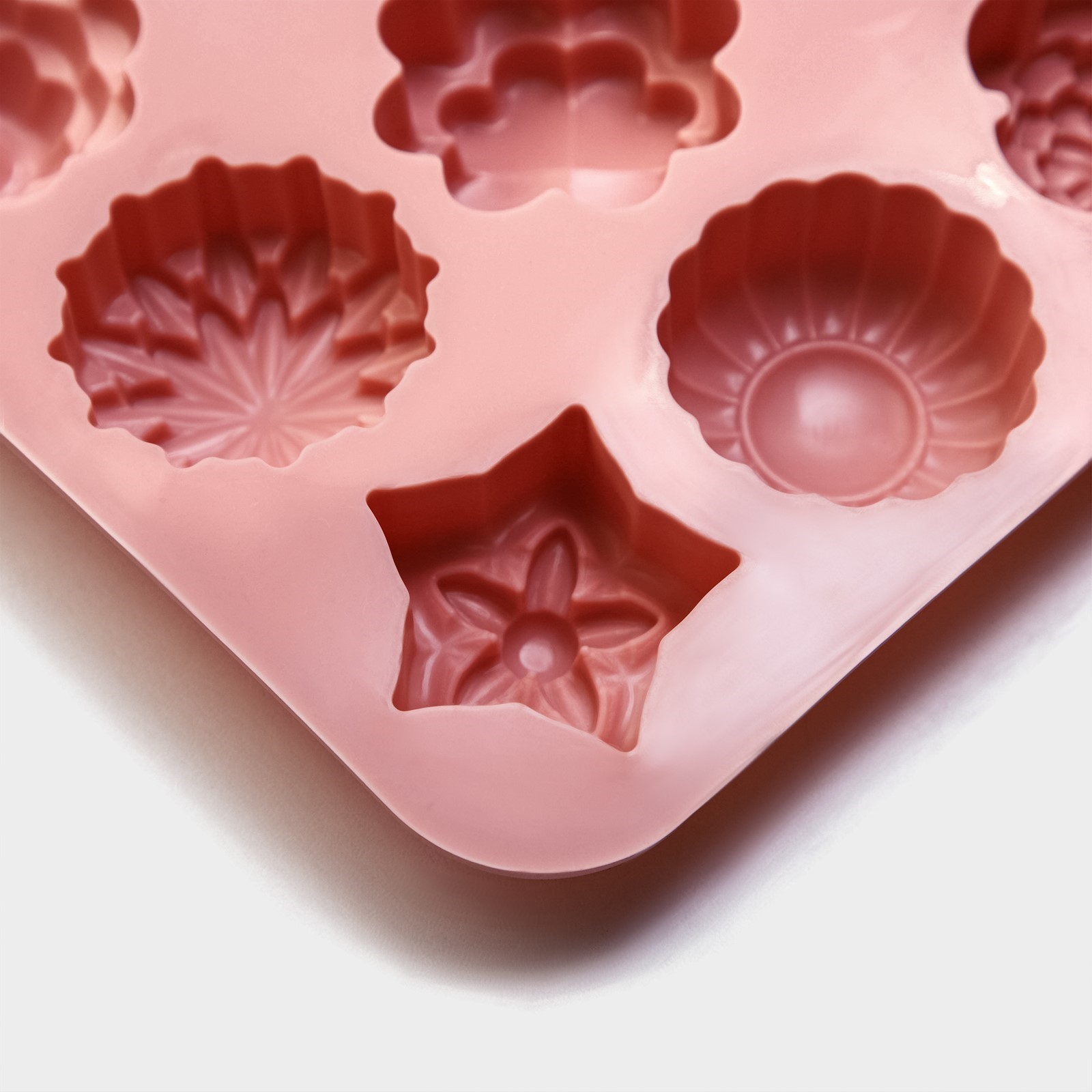 Форма силиконовая для выпечки доляна «цветы», 12 ячеек, 20,5x15,6x2 см, цвет розовый. Цвет: Розовый Форма: Фигурная Фасовка, шт.: 1 Крышка: Нет Материал: Силикон Тип покрытия: Без покрытия Ячейки: Да Наличие палочек для форм: Нет Тип формы: Для печенья и пирожных Разъёмная форма: Нет Съёмное дно: Нет Можно мыть в посудомоечной машине: Да  развернуть описание ▼