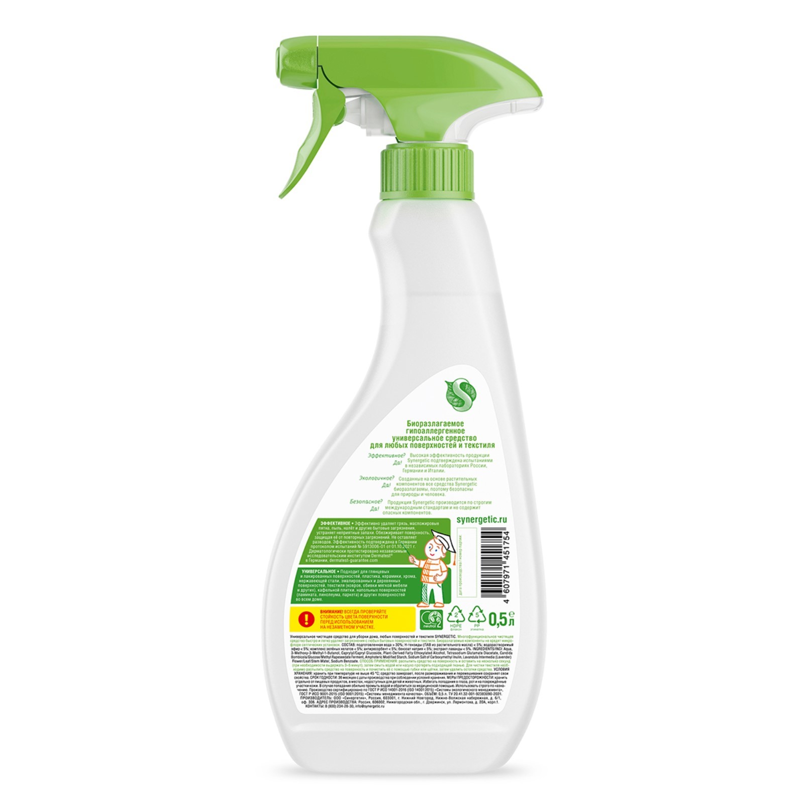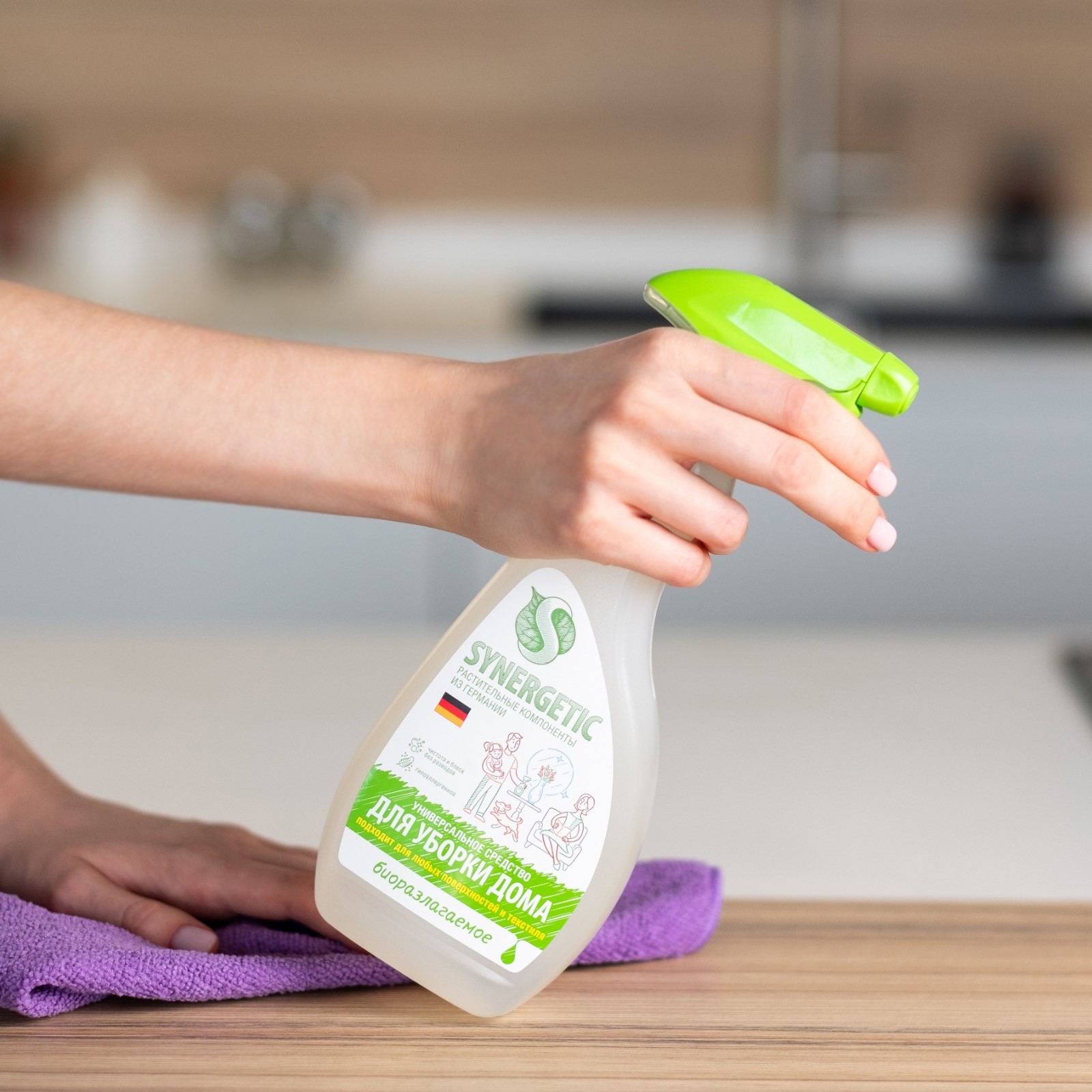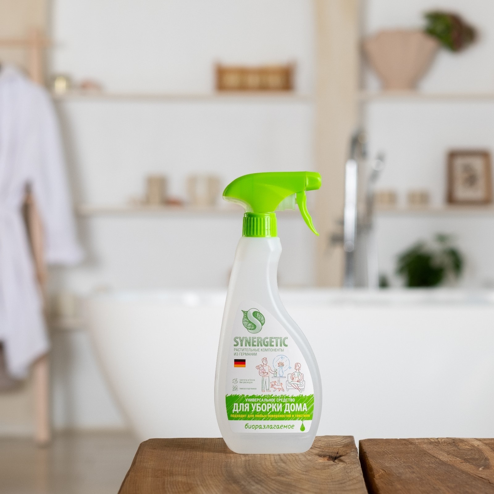 Средство чистящее для уборки дома, любых поверхностей и текстиля, гипоаллергенное, универсальное, 0,5 л. Универсальный биоразлагаемый спрей для уборки SYNERGETIC - это многофункциональное чистящее средство, которое быстро и легко удаляет любые виды бытовых загрязнений: грязь, масложировые пятна, пыль, налет. Эффективно устраняет неприятные запахи и обезжиривает поверхность, защищая ее от повторного загрязнения. Спрей подходит для любых видов поверхностей: напольных (ламината, линолеума, паркета), глянцевых и лакированных, эмалированных и деревянных, пластика, керамики, хрома, нержавеющей стали, текстиля (ковров, обивки мягкой мебели и других), кафельной плитки. Легко смывается, не оставляя разводов, и придает блеск. Средство является гипоаллергенным и полностью состоит из биоразлагаемых компонентов, которые не вредят микрофлоре септических установок. Дерматологически протестировано независимым институтом Dermatest® в Германии. Распылить средство на поверхность и оставить на несколько секунд (при необходимости выдержать 3 - 5 минут), затем смыть водой или насухо протереть подходящей тканью. Для чистки текстиля необходимо распылить средство на поверхность и почистить ее с помощью губки или щетки, затем удалить остатки средства. Беречь от детей. Избегать попадания в глаза. При попадании средства в глаза немедленно промыть проточной водой в течение нескольких минут. При необходимости обратиться за медицинской помощью и предъявить этикетку средства. При повреждениях кожи и повышенной чувствительности избегать длительного контакта со средством. Использовать строго по назначению. Состав: > 30%: вода подготовленная; 5-15%: комплекс А-тензидов; <5%: комплекс Н-тензидов, амфотерный тензид на основе растительных масел, поликарбоксилатный диспергатор, энзимы (без ГМО), соль этидроновой кислоты, консервант, парфюмерная композиция, красители. Объём, мл: 500 Температурное ограничение: Нет  развернуть описание ▼