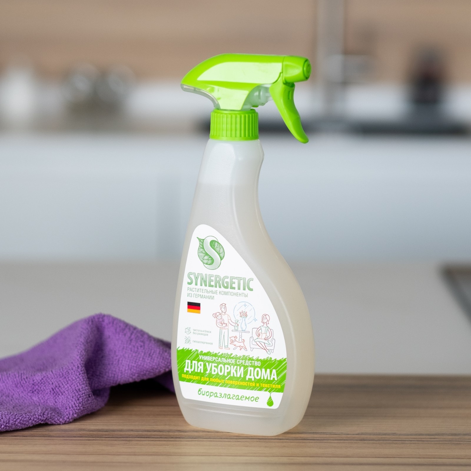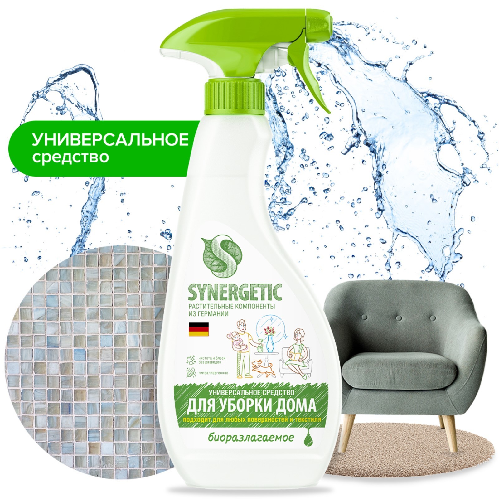 Средство чистящее для уборки дома, любых поверхностей и текстиля, гипоаллергенное, универсальное, 0,5 л.   Универсальный биоразлагаемый спрей для уборки SYNERGETIC - это многофункциональное чистящее средство, которое быстро и легко удаляет любые виды бытовых загрязнений: грязь, масложировые пятна, пыль, налет. Эффективно устраняет неприятные запахи и обезжиривает поверхность, защищая ее от повторного загрязнения.  Спрей подходит для любых видов поверхностей: напольных (ламината, линолеума, паркета), глянцевых и лакированных, эмалированных и деревянных, пластика, керамики, хрома, нержавеющей стали, текстиля (ковров, обивки мягкой мебели и других), кафельной плитки. Легко смывается, не оставляя разводов, и придает блеск.  Средство является гипоаллергенным и полностью состоит из биоразлагаемых компонентов, которые не вредят микрофлоре септических установок. Дерматологически протестировано независимым институтом Dermatest® в Германии.  Распылить средство на поверхность и оставить на несколько секунд (при необходимости выдержать 3 - 5 минут), затем смыть водой или насухо протереть подходящей тканью. Для чистки текстиля необходимо распылить средство на поверхность и почистить ее с помощью губки или щетки, затем удалить остатки средства.  Беречь от детей. Избегать попадания в глаза.  При попадании средства в глаза немедленно промыть проточной водой в течение нескольких минут. При необходимости обратиться за медицинской помощью и предъявить этикетку средства. При повреждениях кожи и повышенной чувствительности избегать длительного контакта со средством. Использовать строго по назначению.  Состав: > 30%: вода подготовленная; 5-15%: комплекс А-тензидов; <5%: комплекс Н-тензидов, амфотерный тензид на основе растительных масел, поликарбоксилатный диспергатор, энзимы (без ГМО), соль этидроновой кислоты, консервант, парфюмерная композиция, красители.  Объём, мл: 500 Температурное ограничение: Нет  развернуть описание ▼
