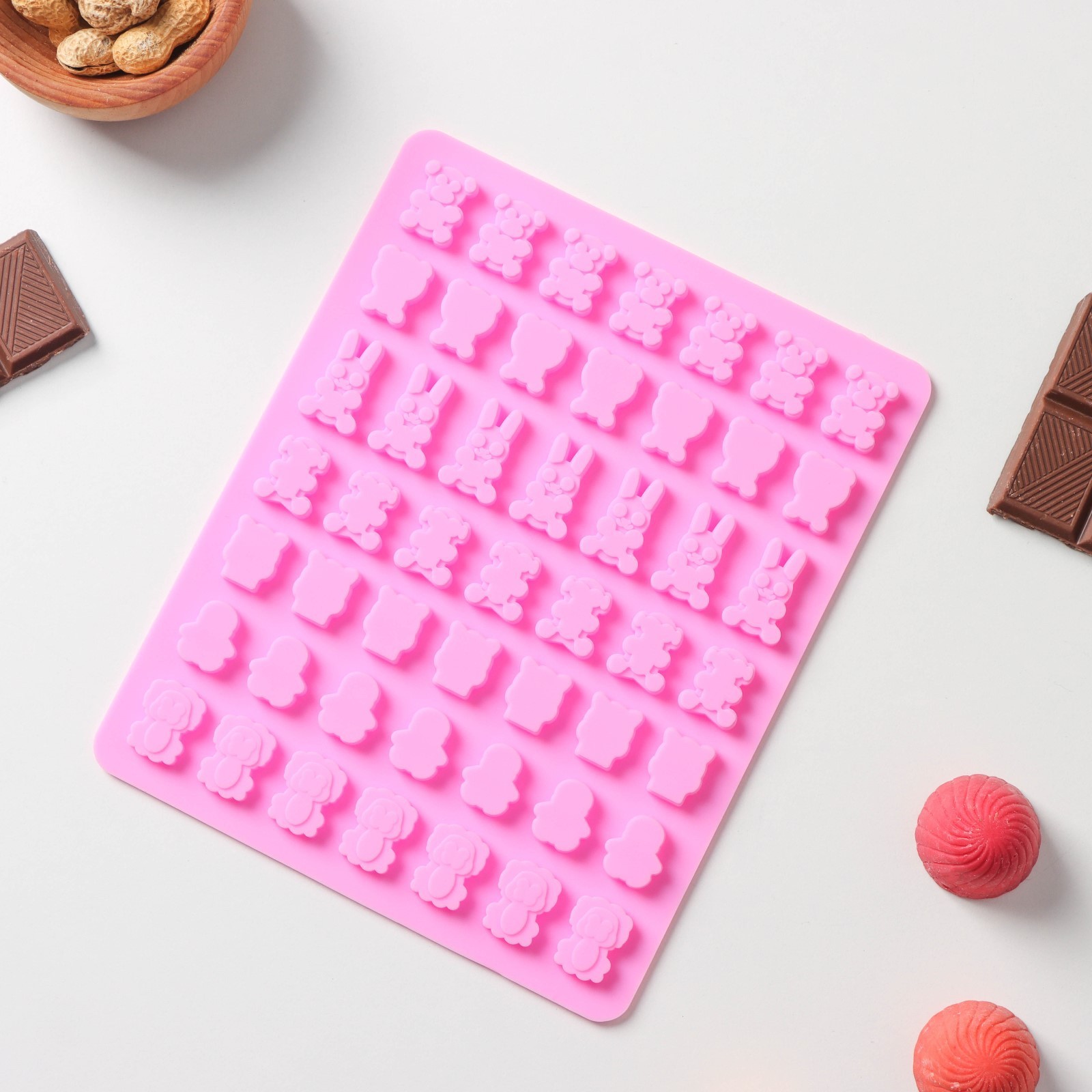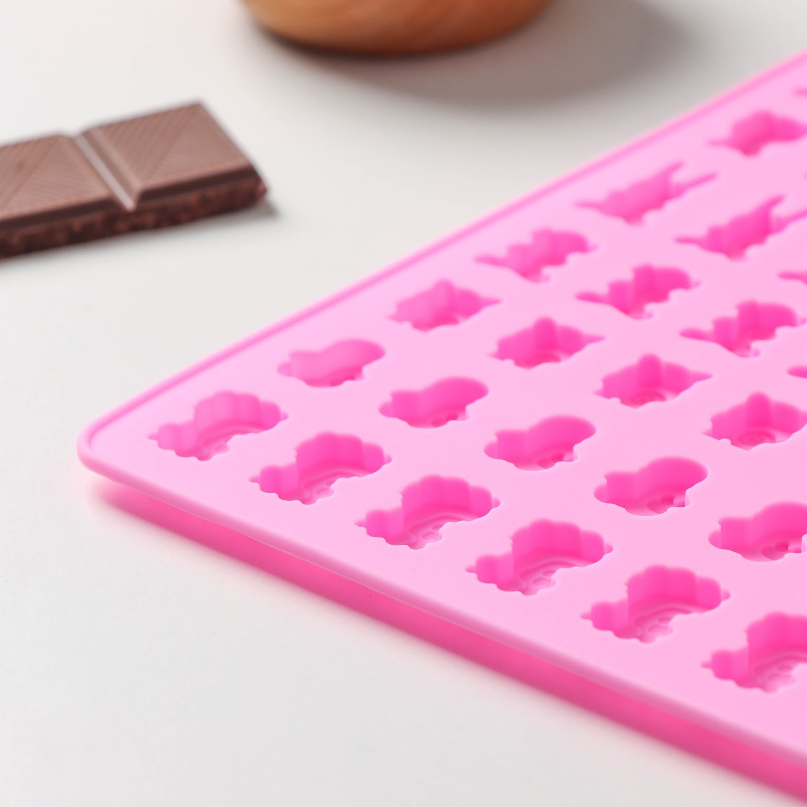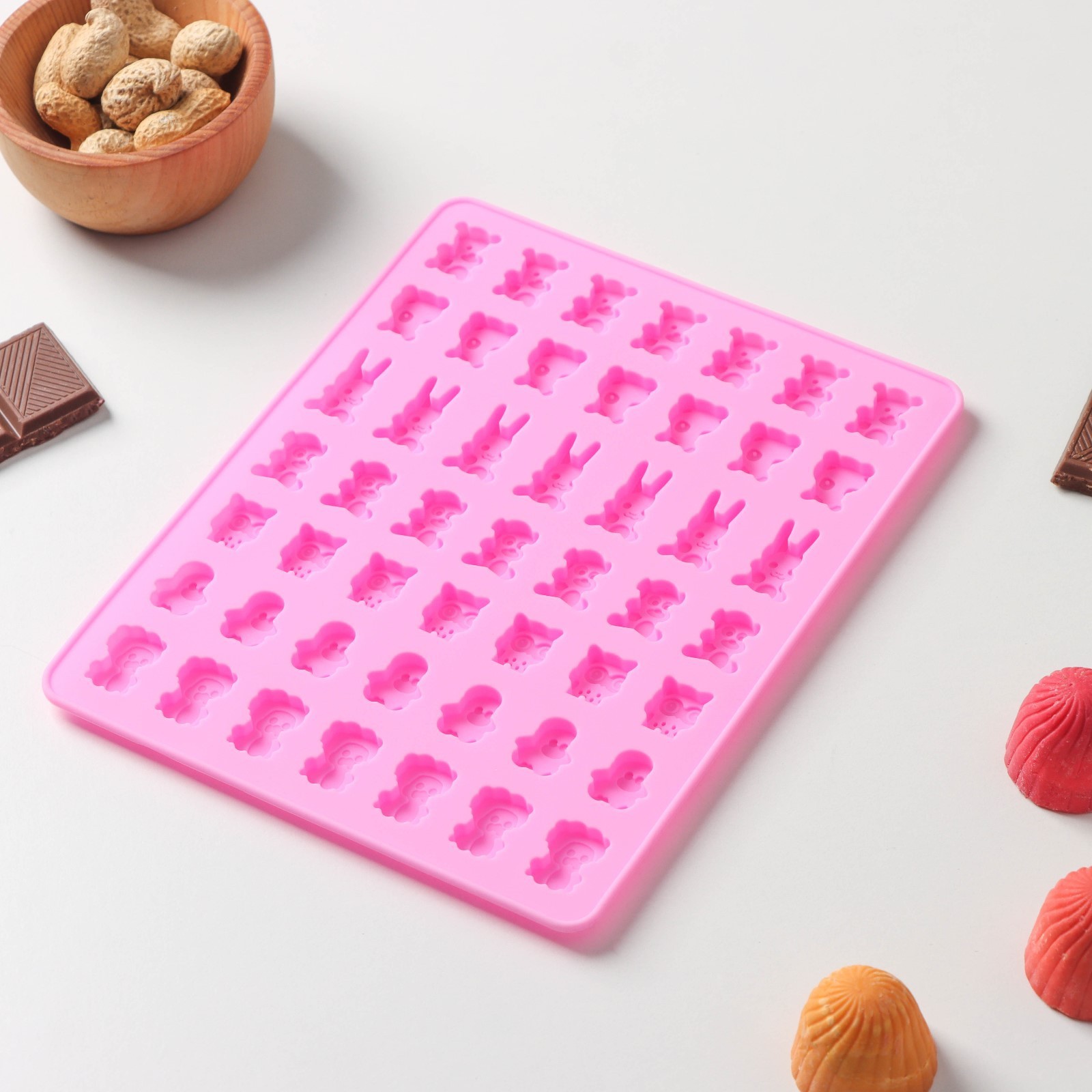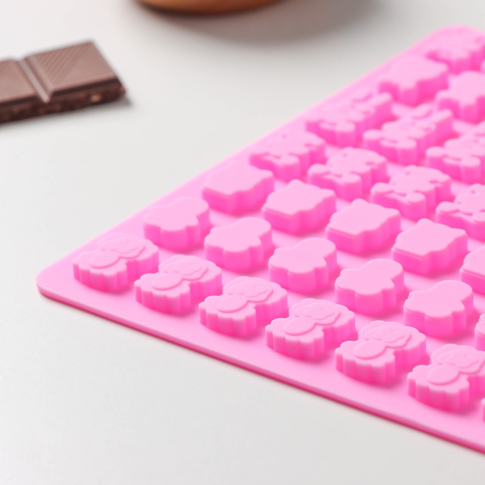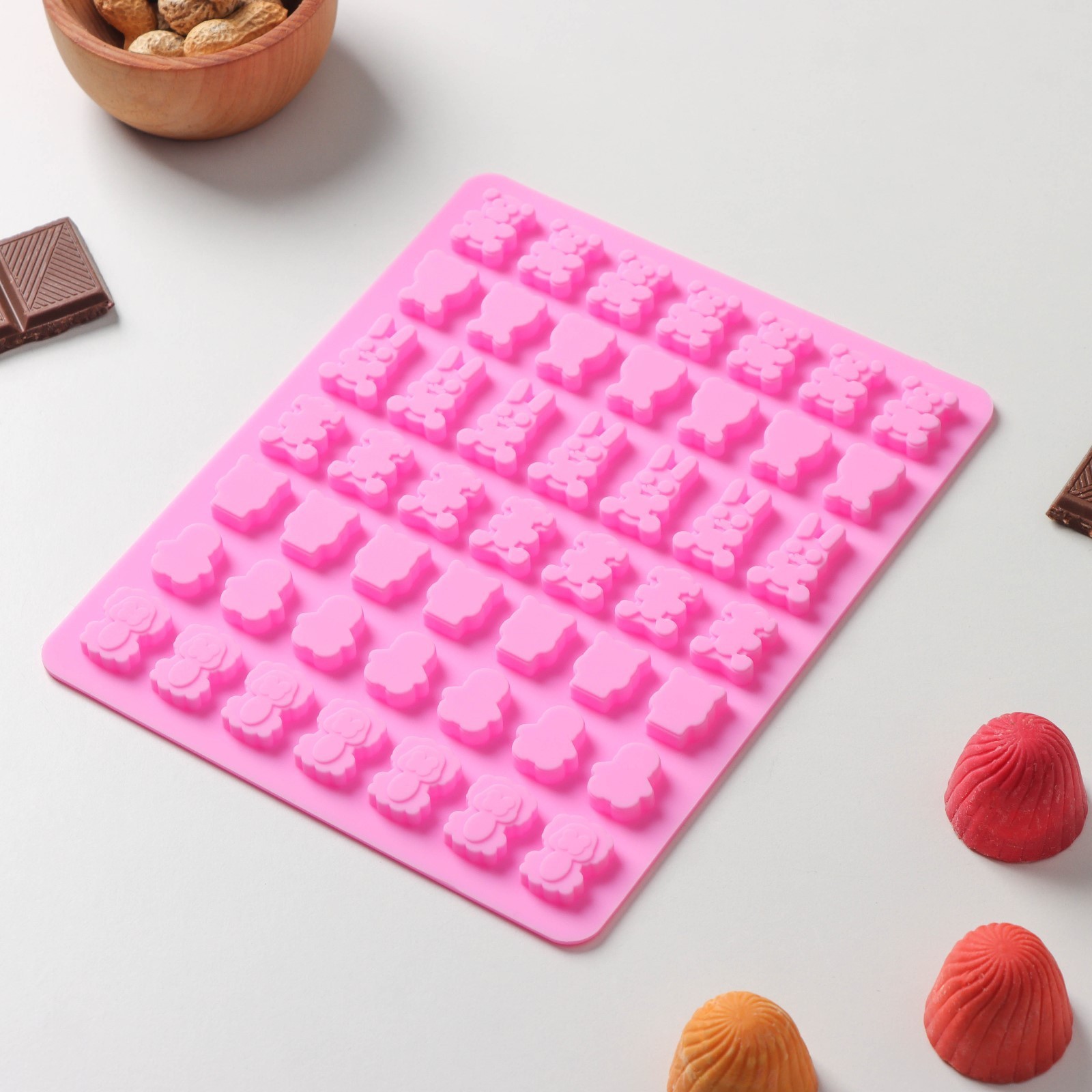 Форма для мармелада доляна «зоопарк», 18,5x15x0,5 см, 49 ячеек (2x1,5 см), цвет розовый. Силиконовые формы для мармелада помогут приготовить вкусные и натуральные желейные десерты в домашних условиях! Форма изготовлена из качественного силикона, что гарантирует долгий срок службы. Удобный дизайн позволяет легко извлекать готовый мармелад, а благодаря своей гибкости, форма обеспечивает идеальную текстуру мармелада. Достоинства: содержимое не прилипает к стенкам изделия;силикон выдерживает температуру от -40 до 230 °С;материал не впитывает запахов и полностью безопасен для продуктов питания;форма легко отмывается, в том числе в посудомоечной машине. Создавайте неповторимые кулинарные шедевры вместе с формой «Зоопарк»! Цвет: Розовый Форма: Прямоугольная Количество ячеек: 49 Крышка: Нет Материал: Силикон Тип покрытия: Без покрытия Ячейки: Да Наличие палочек для форм: Нет Разъёмная форма: Нет Съёмное дно: Нет Тематика: Животный мир  развернуть описание ▼