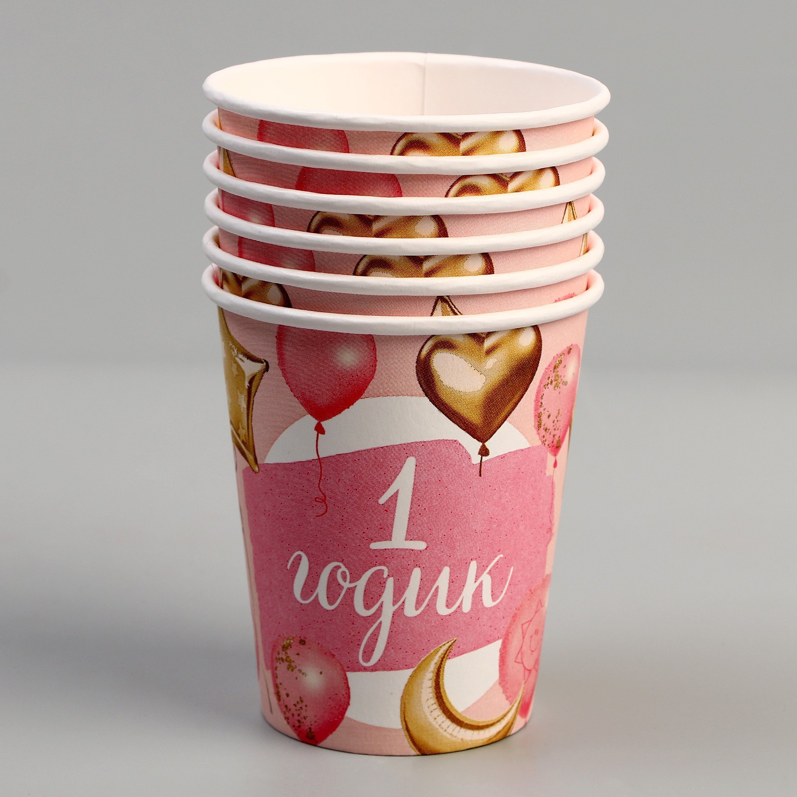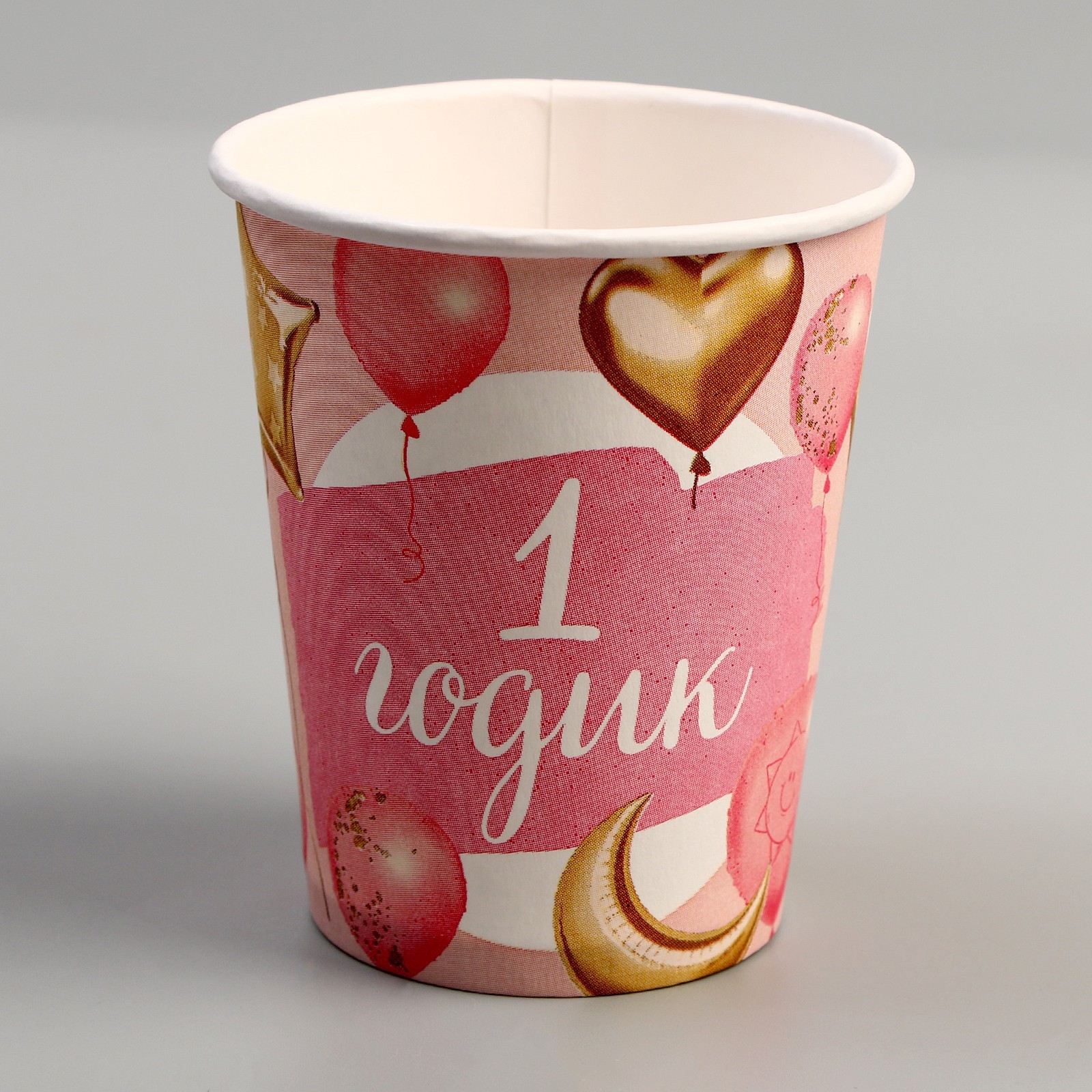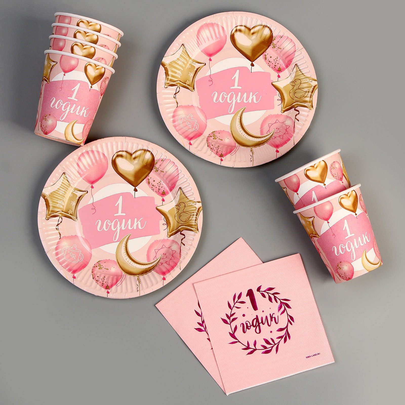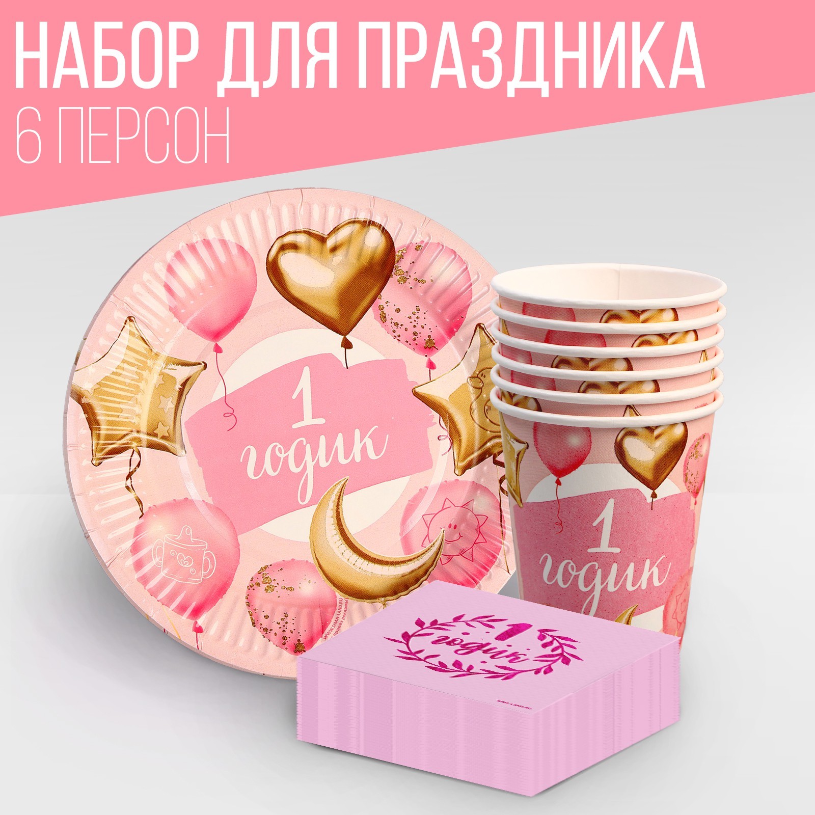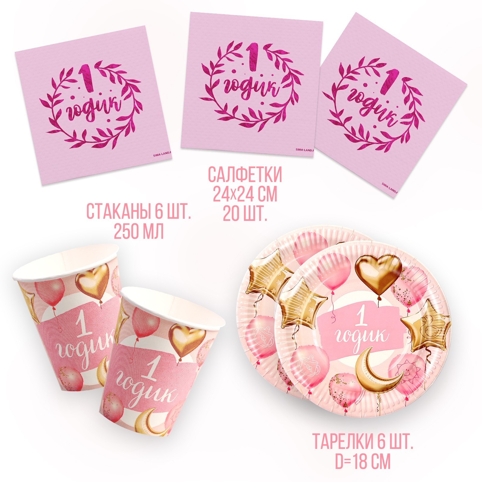 Набор посуды «1 годик»: салфетки 20 шт., стаканы 6 шт., тарелки 6 шт., розовый