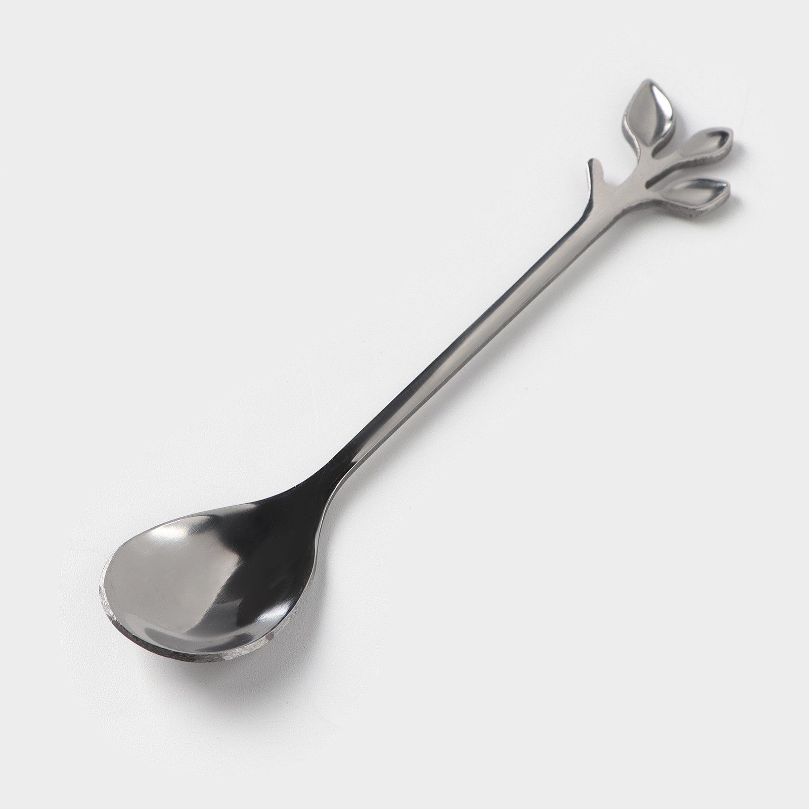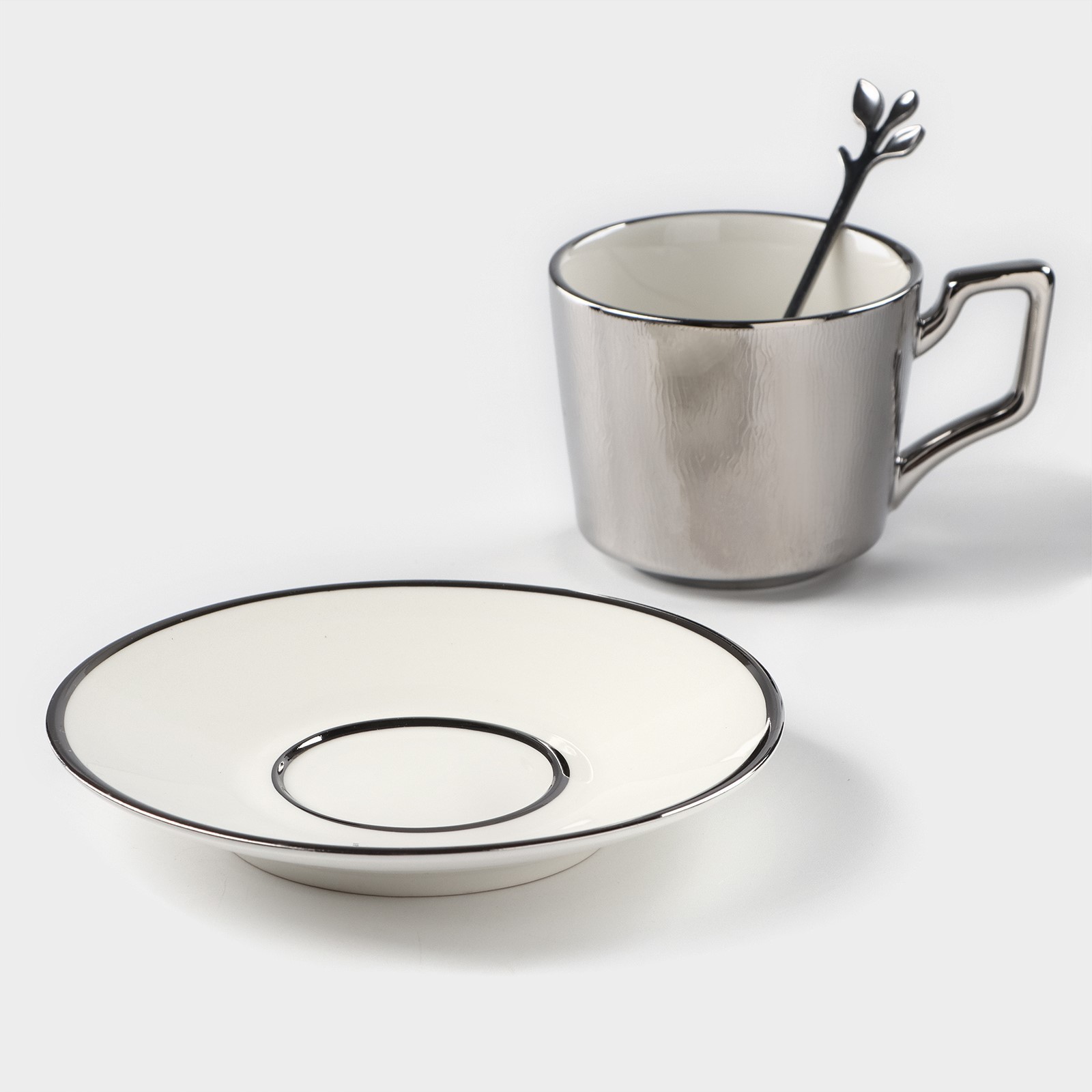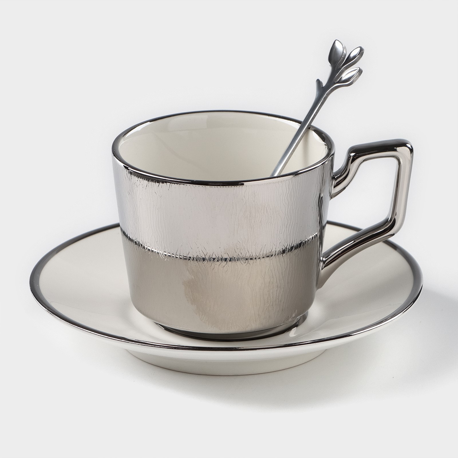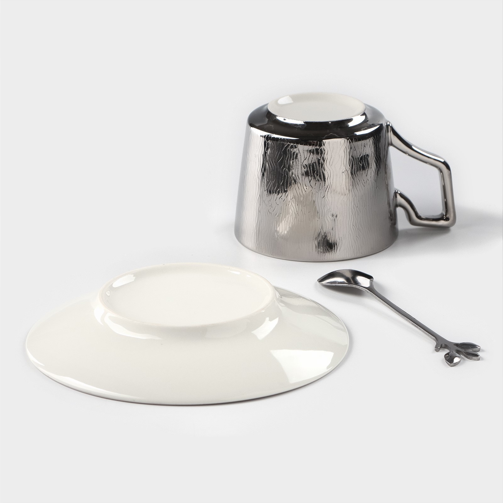 Кофейная пара керамическая «серебро», 3 предмета: чашка 200 мл, блюдце D=14 см, ложка H=12,5 см, цвет серебряный