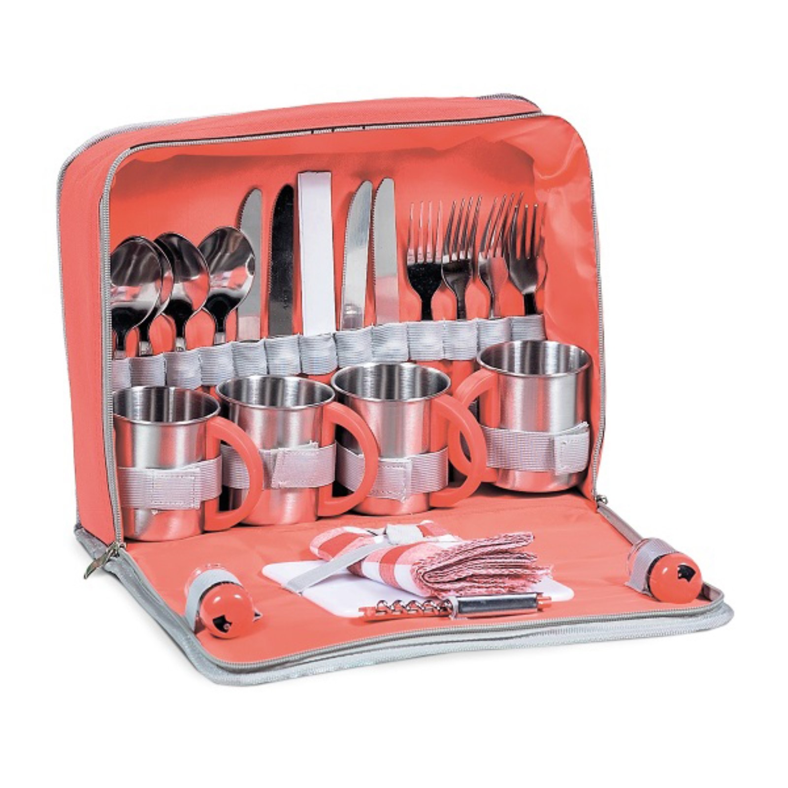 Набор для пикника 3044, 26 предметов. Цвет: Красный Количество персон: 4 В наборе, шт.: 26 Вид упаковки: Коробка Материал: Полиэстер Материал: Нержавеющая сталь Назначение: Для приёма пищи Комплектация: Столовые приборы Комплектация: Посуда для напитков  развернуть описание ▼