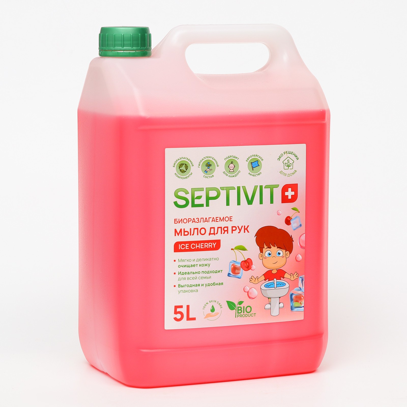 Жидкое мыло septivit "ice cherry", 5 л.   Средства из Новогодней коллекции SEPTIVIT Premium обладают потрясающими ароматами, которые наполнят Ваш дом Рождественским настроением. Новогодний аромат зимней вишни будет создавать уютную атмосферу зимними вечерами.  Помимо волшебной отдушки, жидкое мыло нежно питает и оказывает уход за руками. Нейтральный Ph бережно очищает, не вызывает раздражений и полностью смывается водой. Мягкая консистенция и густая пена обеспечивают максимально экономичный расход средства, а при данном объёме это позволит вам надолго забыть о покупке нового мыла! Жидкое мыло 5л Ice cherry - идеальный подарок для ценителей ухода за домом. Новогодние подарки разные - а ЭКО решение для дома одно - это SEPTIVIT Premium.  Состав: Вода питьевая >30%, лауретсульфат натрия >5%, диэтаноламиды жирных кислот кокосового масла >1%, хлорид натрия> 1, 5 , кокамидопропилбетаин>3%, лауриламинооксид>5%, парфюмерная композиция, стирол/акрилатный сополимер<1% лимоннаяя кислота <1%.  Цвет: Розовый parts count: 0 Вес, г/Объём, мл: 5000 Аромат: Вишня Тип: Жидкое Вид мыла: Туалетное Вид мыла: Кухонное Вид мыла: Детское : 0 Температурное ограничение: Нет Товар 18+: Нет  развернуть описание ▼