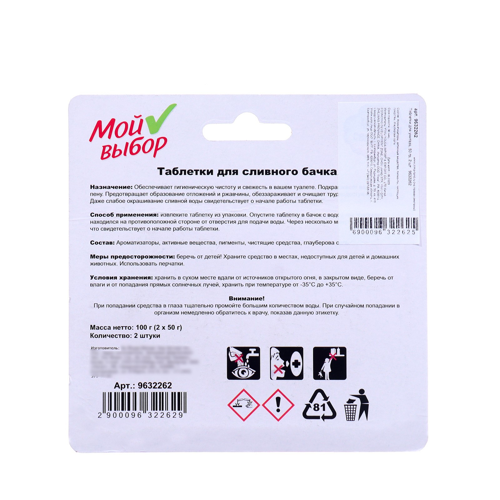 Таблетки для унитаза, 50 гр, 2 шт. Эффективное чистящее и освежающее средство. Не содержит фосфор, способствует дезинфекции и очистке сантехники. Удобные водорастворимые капсулы, к которым не требуется прикасаться руками, полностью растворяются и не создают засоров. Средство безопасно в использовании, не обладает коррозионными свойствами, отличается свежим, утонченным, изысканным ароматом. Применение: Выньте таблетку из упаковки и не снимая защитную пленку поместите в бачок унитаза подальше от сливного отверстия. Аромат: Без аромата Вид средства: Таблетка  развернуть описание ▼
