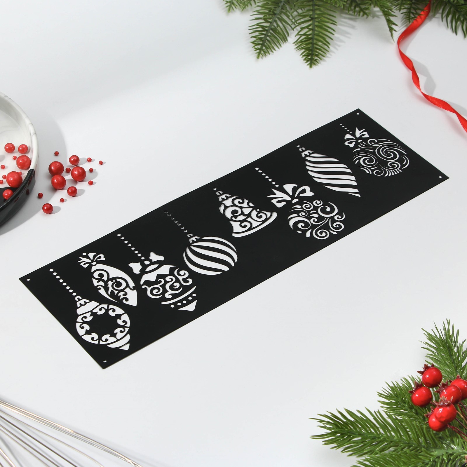 Трафарет для выпечки «игрушки», 32 х 10 см. Трафарет для выпечки – это готовый шаблон с узорами и изображениями, с помощью которого можно украсить торты, печенье, пирожные, пряники, кексы. Узор можно переносить на бумагу, ткань, кожзам, бетон и многое другое. На боковых трафаретах сделаны специальные отверстия, чтобы закрепить трафарет на изделии и не придерживать рукой, украшать Ваше кондитерское либо любое другое изделие. Данные трафареты можно использовать для всевозможных творческих работ. Форма: Прямоугольная Тематика: Новогодняя Материал: Пластик Вид: Трафареты Форма: Прямоугольник  развернуть описание ▼