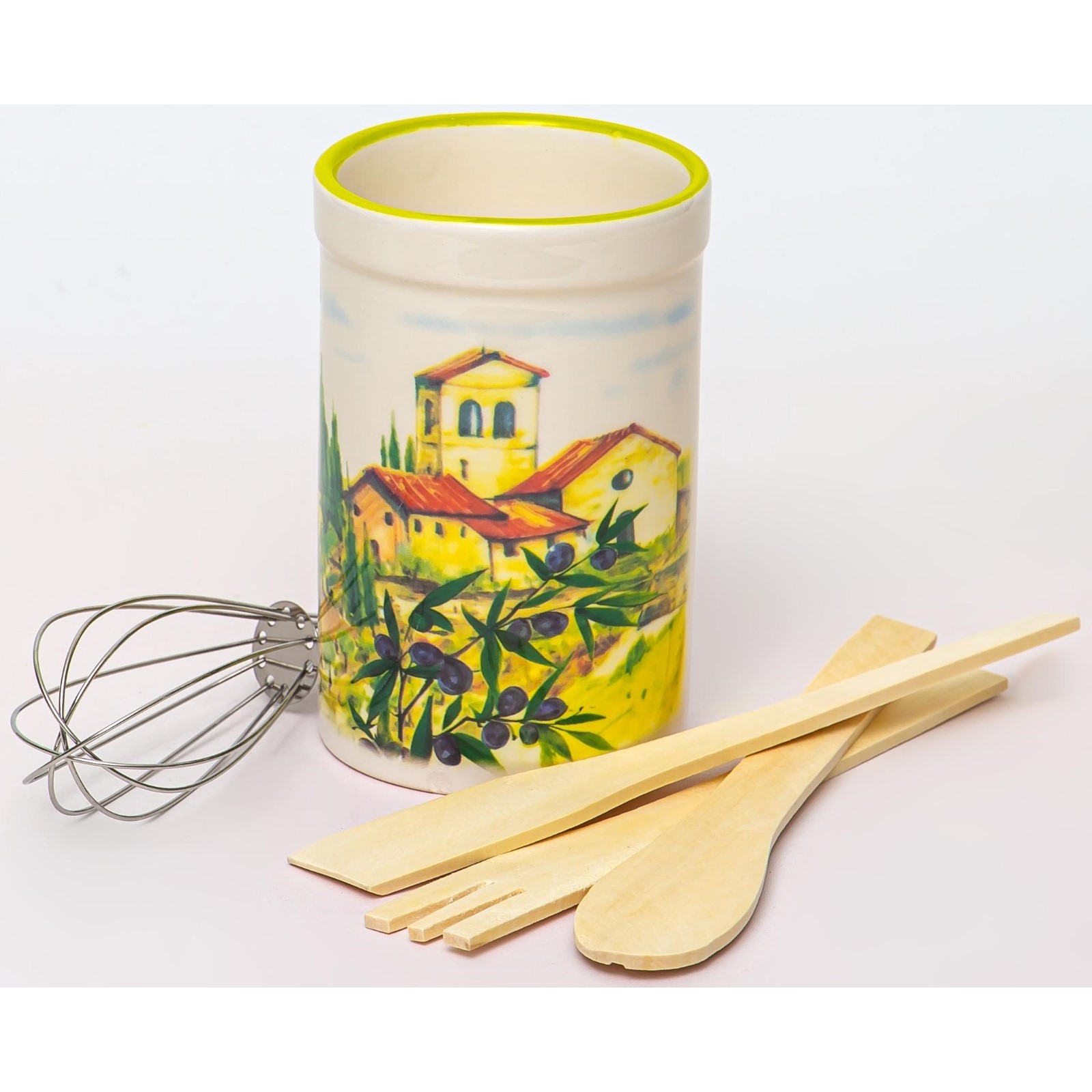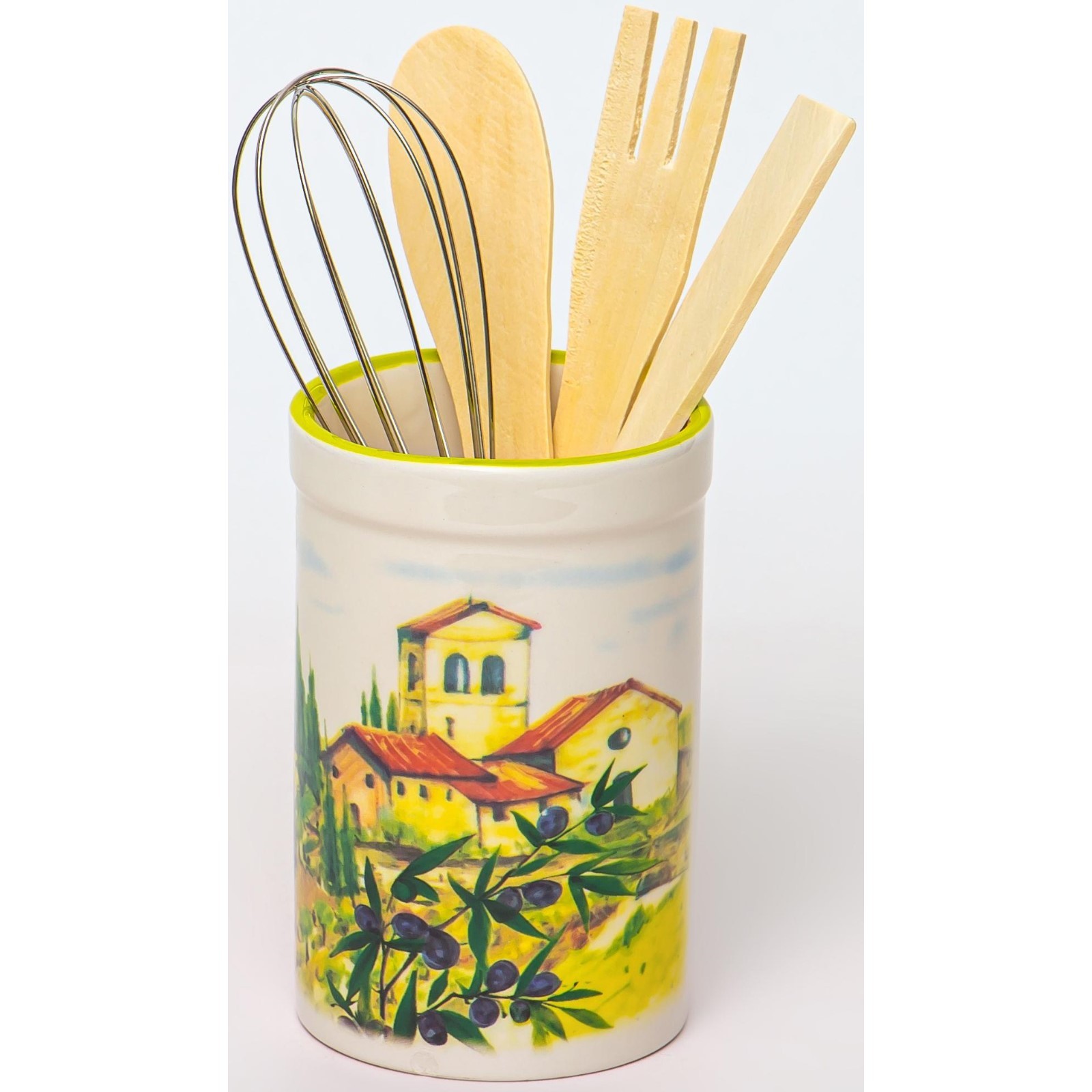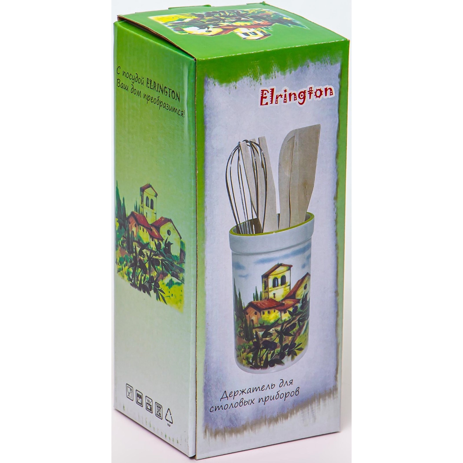 Держатель для столовых приборов elrington «итальянский дворик». Изделие может иметь следующие несущественные дефекты: незначительный скол краски;прерывание и наплыв рисунка;наличие полосы на рисунке;потёртости и наплыв золотой краски на внутренней стороне;небольшие потёртости и царапины на глазури;засорения под глазурью;плотные вздутия глазури на внутренней поверхности;натёк глазури;наличие мушек (чёрных точек);неровность внутреннего отверстия;отклеивание страз;потёртость упаковки в уголках. Данные недостатки не влияют на свойства изделия при использовании. Цвет: Белый Материал: Керамика (Доломит) С поддоном: Нет Можно мыть в посудомоечной машине: Нет  развернуть описание ▼