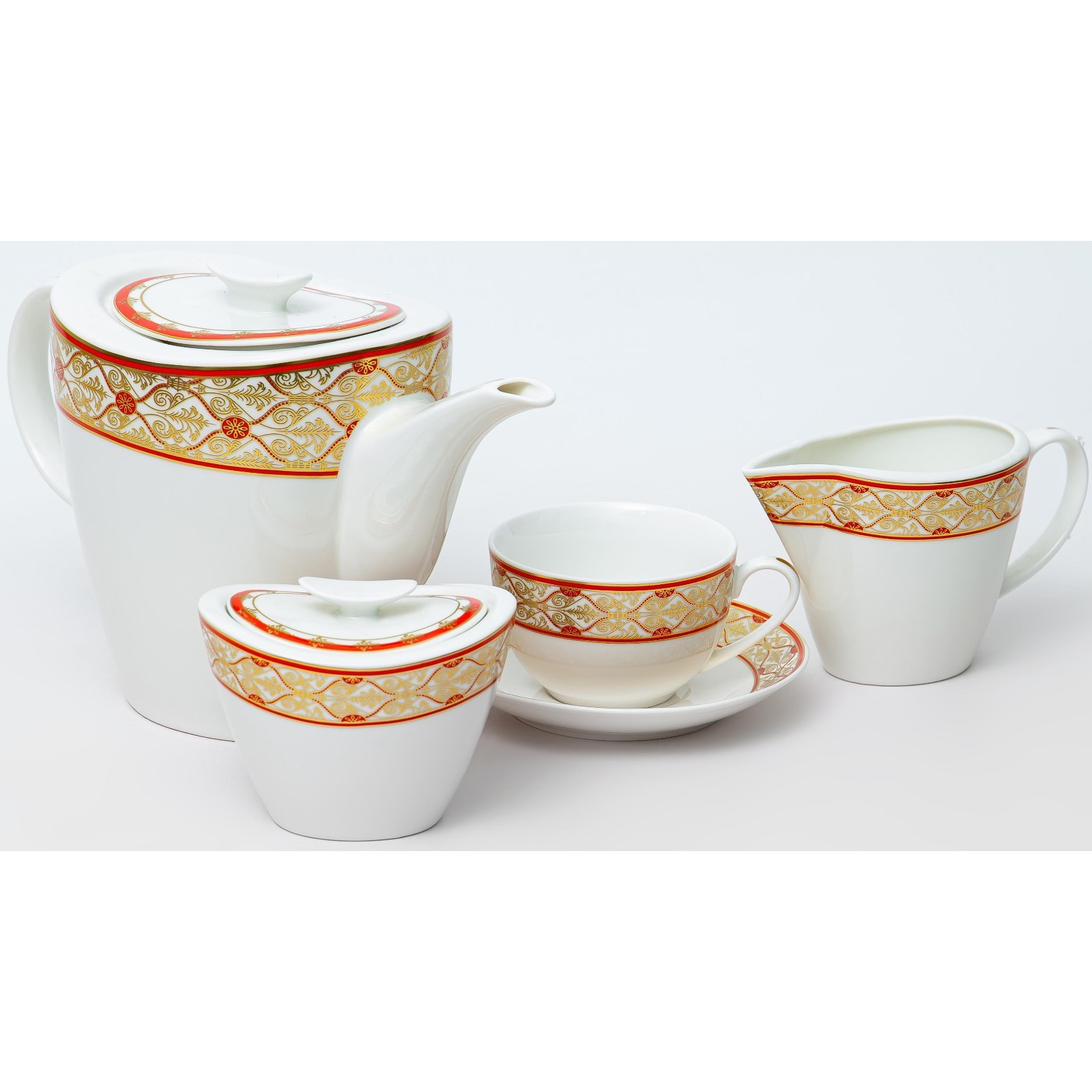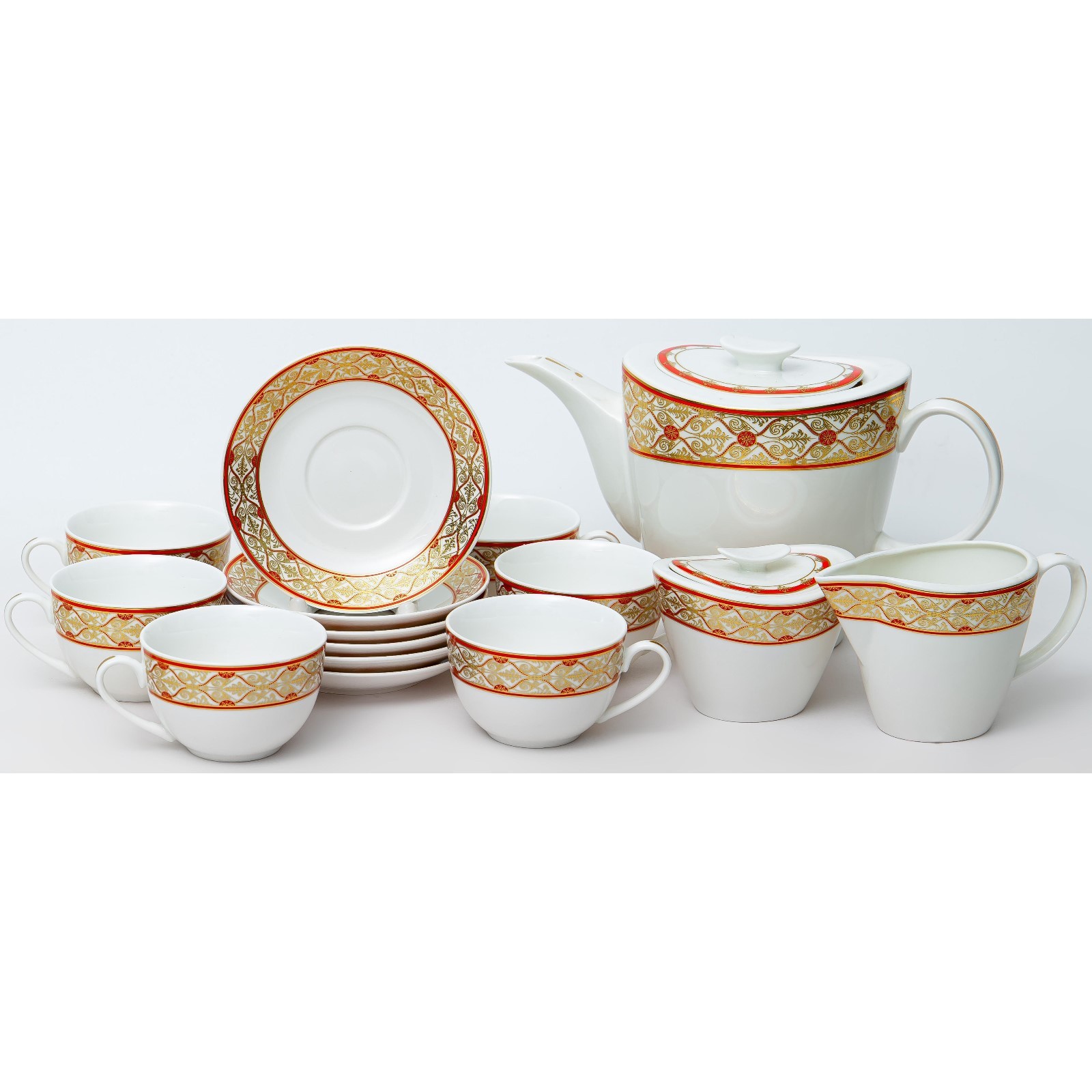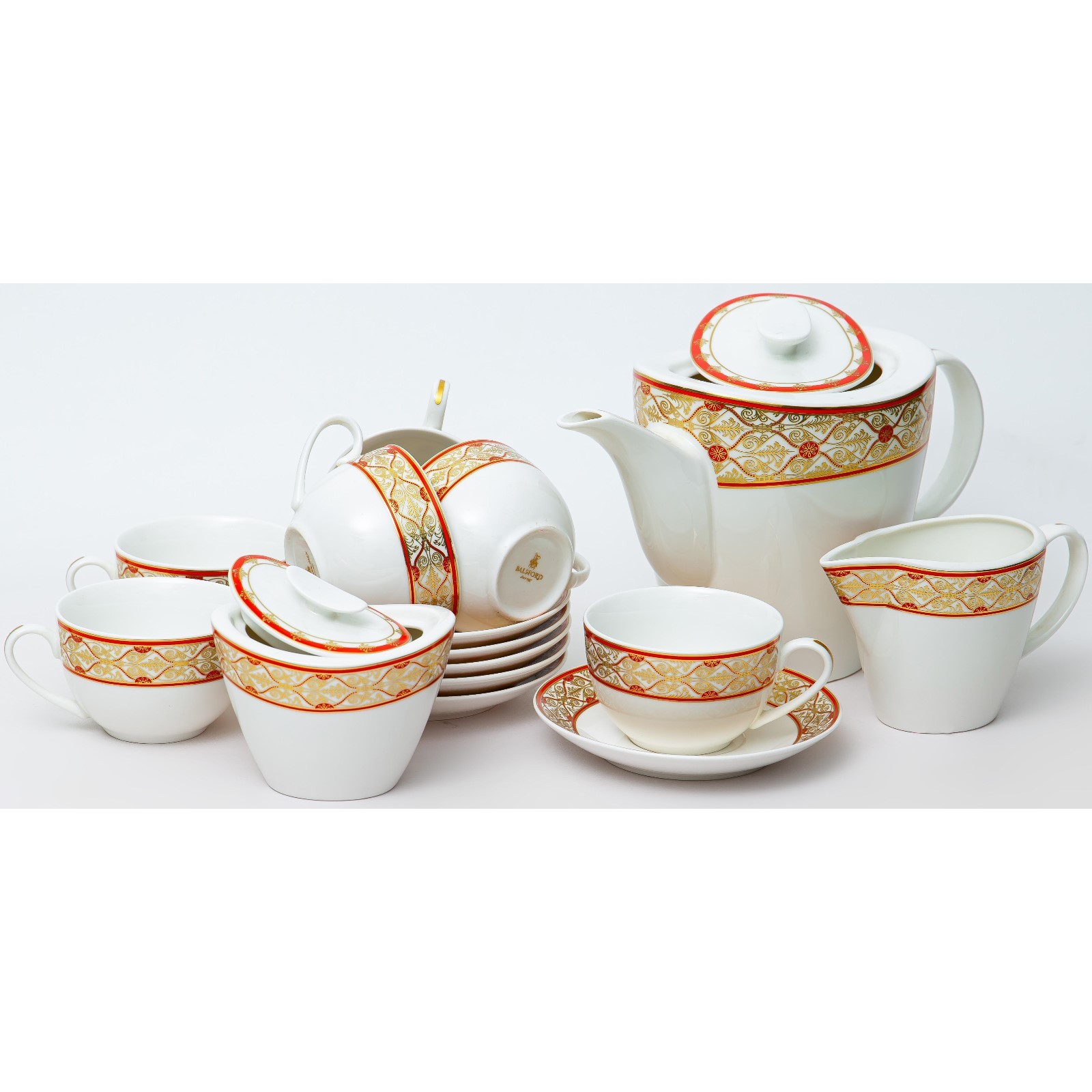 Чайный набор balsford «эстелла», 17 предметов. Изделие может иметь следующие несущественные дефекты: незначительный скол краски;прерывание и наплыв рисунка;наличие полосы на рисунке;потёртости и наплыв золотой краски на внутренней стороне;небольшие потёртости и царапины на глазури;засорения под глазурью;плотные вздутия глазури на внутренней поверхности;натёк глазури;наличие мушек (чёрных точек);неровность внутреннего отверстия;отклеивание страз;потёртость упаковки в уголках. Данные недостатки не влияют на свойства изделия при использовании. Цвет: Белый Количество персон: 6 В наборе, шт.: 17 Объём, мл: 250 Тематика: Орнамент Материал: Фарфор (Новый костяной фарфор) Наличие подставки: Нет Можно мыть в посудомоечной машине: Нет Можно использовать в СВЧ-печи: Нет Текстура: Гладкая Тип: Чайный сервиз Особенности: С золотой отводкой Матовая поверхность: Нет  развернуть описание ▼