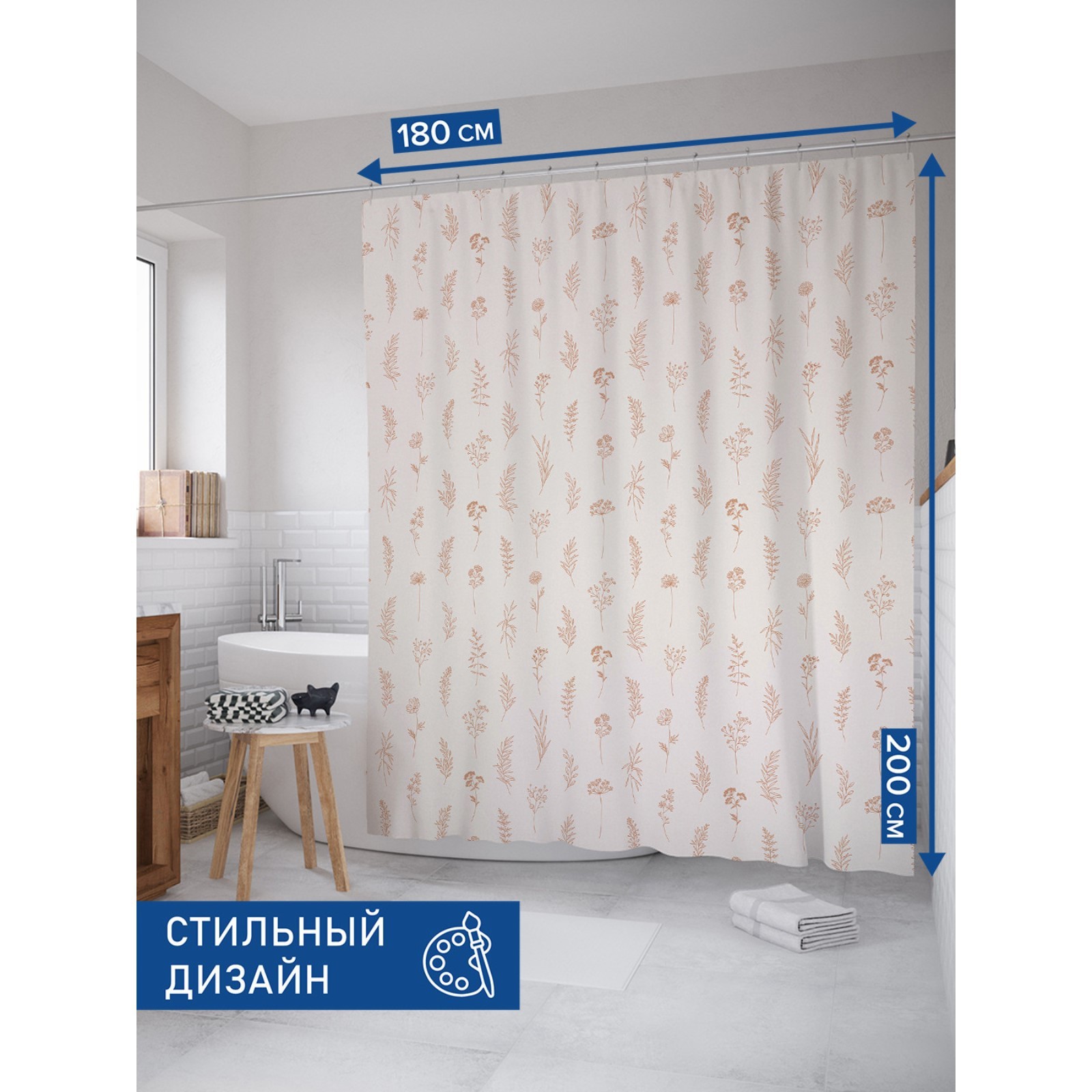 Фотоштора для ванной «цветочные зарисовки», сатен, размер 180х200 см