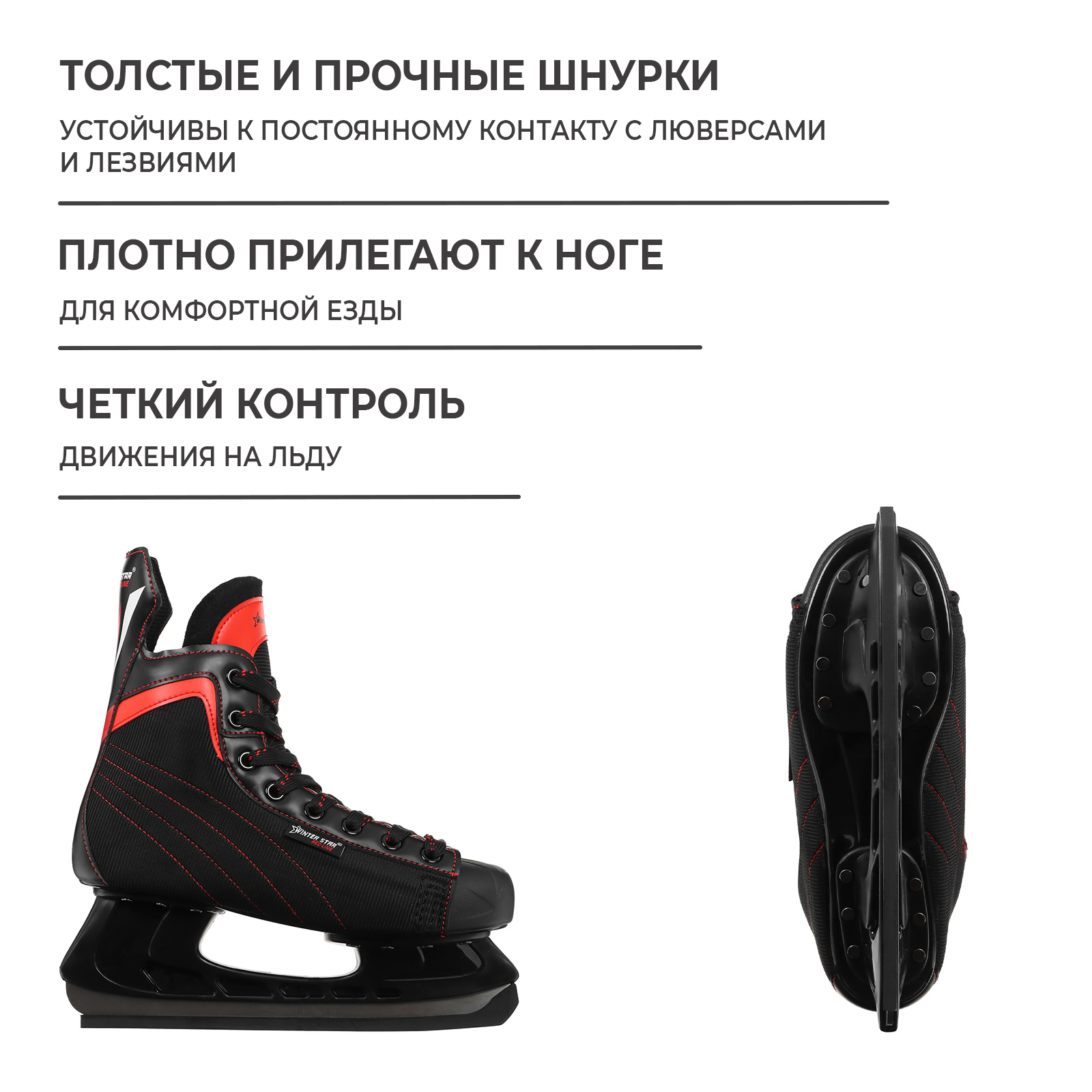 Коньки хоккейные winter star red line, р. 39. Коньки подойдут для новичков и опытных игроков. Характеристики Основа ботинка: пластик. Жёсткий материал создаёт надёжную защиту от попадания шайбы. Пластиковый носок обеспечивает стойкость изделия к порезам и истиранию. Материал верха: сетка, искусственная кожа. Внутренний материал: вельвет. Материал стельки: бархат, вельвет. Материал шнурка: полиэфир, толщина — 17 мм. Лезвие: нержавеющая сталь, толщина — 3 мм. Максимальная нагрузка: 100 кг. Рекомендации по эксплуатации После катания удалите влагу с лезвия мягкой тканью. Сушите при комнатной температуре вдали от отопительных приборов. Используйте чехлы для лезвий коньков для хранения и перехода до ледовой площадки. Заточите лезвия после покупки и повторяйте эту процедуру по мере необходимости для комфортного катания. Коньки не предназначены для коммерческого использования и в пунктах проката. Цвет: Чёрный Цвет: Красный Для кого: Унисекс Длина по стельке, см: 25 Размер обуви: 39 Возраст: Взрослый Материал подкладки: Вельвет Уровень: Продвинутый Уровень: Новичок Серия: Без серии Раздвижные коньки: Нет Тип коньков: Хоккейные Роликовая платформа: Нет Материал верха: Искусственная кожа Материал верха: Сетка Позиция игрока: Полевой игрок Подходят для проката: Нет Материал лезвия: Нержавеющая сталь  развернуть описание ▼