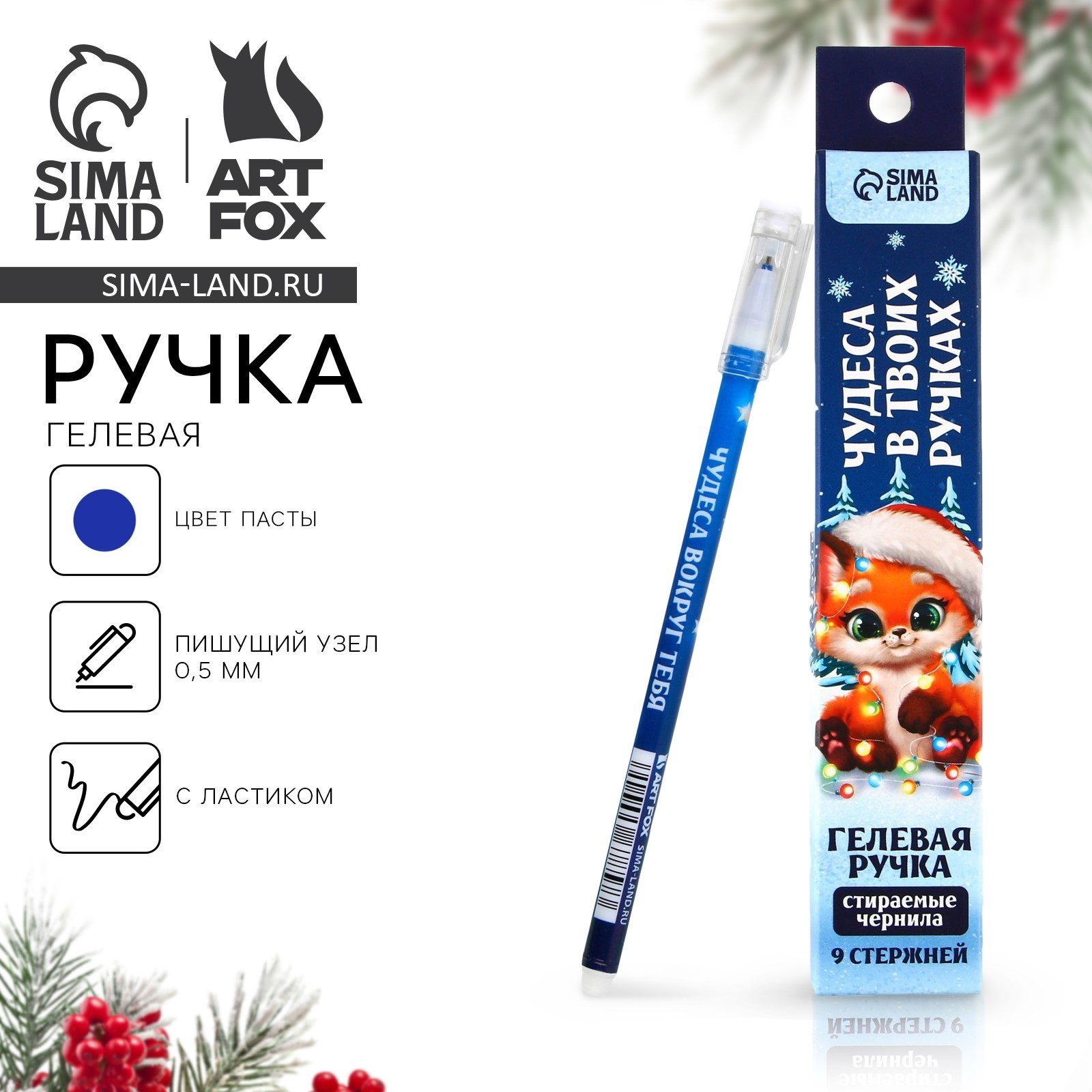 Ручка пиши-стирай, гелевая, синяя паста, 0.5 мм и стержни 9 шт. «чудеса в твоих». Ручка торговой марки ArtFox отлично подойдет в качестве подарка. Яркий дизайн несомненно привлечет внимание и будет выделяться среди других предметов, а удобная форма корпуса позволит использовать ее с комфортом. Цвет стержня: синий;Стержень заменяемый: да;Материал: пластик;Форма корпуса: круглая.Диаметр пишущего узла, мм:0.5|Набор:Да|Вид ручки:Гелевая|Цвет стержня:Синий|Европодвес:Да|Вид упаковки:Коробка картонная|Символ года:Нет|Тематика праздника:Новый год|Адресат:Без адресата|Материал:Пластик|Материал упаковки:Картон|Составляющие набора:Ручка|Стержень заменяемый:Да|Штрихкод на единице товара:Да|Наличие грипа:Нет|Страна:Китай  развернуть описание ▼