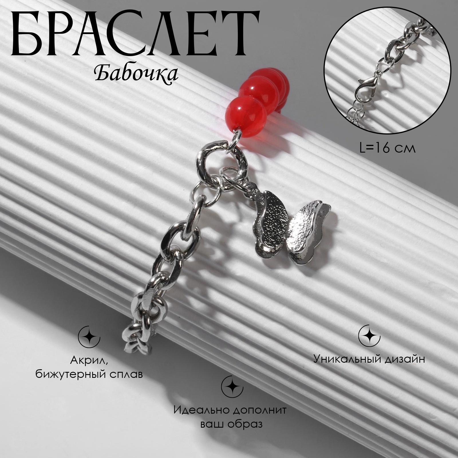 Браслет «бабочка» полевая, цвет красный в серебре, l=16 см. Торговая марка Queen fair — это яркий пример сочетания бессмертной классики и актуальных трендов в мире аксессуаров. Металлические цепи, серьги-кольца, украшения со стразами, яркие броши — вы всегда найдёте подходящий аксессуар. Queen fair включает огромный ассортимент бижутерии, а если вы хотите проявить фантазию и сделать что-то оригинальное самостоятельно, фурнитура для создания украшений — идеальное решение. Аксессуары — это способ проявить себя и своё чувство стиля, с ними вы можете подчеркнуть свои достоинства, привлечь внимание и создать неповторимый образ. Набор:Нет|Цвет:Серебристый|Цвет:Красный|Для кого:Для женщины|Длина, см:16|В наборе, шт.:1|Количество нитей:1|Тематика праздника:Универсальная тематика|Материал:Металл|Цвет фурнитуры:Серебряный|Вставка/Подвеска:Акрил|Материал основания:Металл|Материал основы:Металл|Тематика:Бабочка|Вид:Цепочка|Вид застёжки:Карабин|Тематика:Насекомые|Страна:Китай  развернуть описание ▼