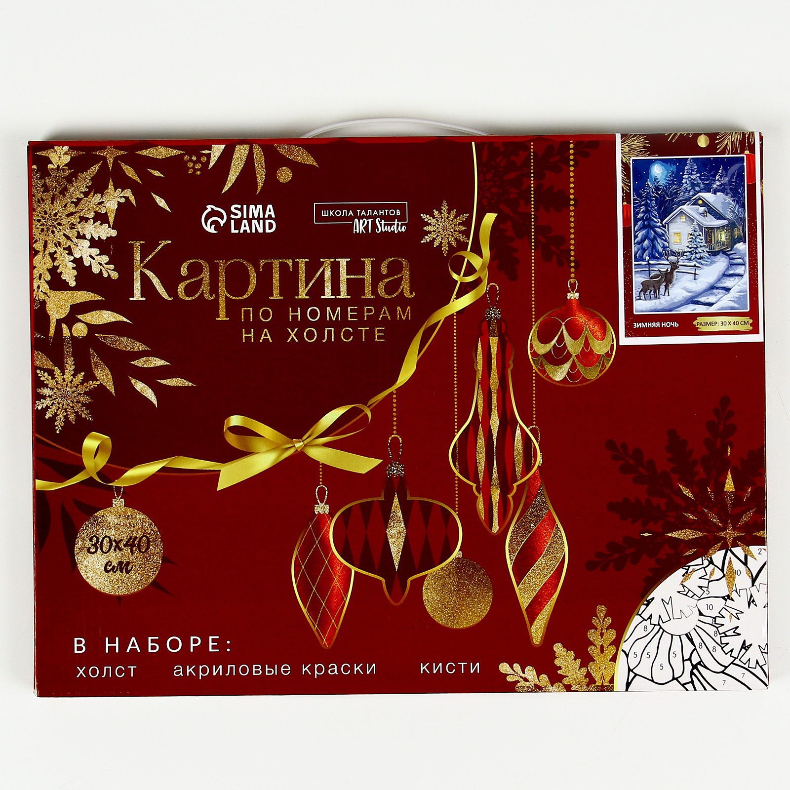Картина по номерам на новый год на холсте с подрамником «зимняя ночь», 40 30 см. Раскрашивание по номерам покорило сердца миллионов людей по всему миру, ведь с ним каждый может создать шедевр! Присоединяйтесь к этому увлекательному занятию, творите и наслаждайтесь результатами. Особенности набора Холст разделён на множество мелких фрагментов, на каждом указано число, соответствующее цвету, которым нужно закрасить данный участок.В набор входят все необходимые оттенки красок. Баночки пронумерованы.Поначалу, когда вы только возьмёте холст в руки, будет сложно представить, что получится в итоге. Но, уверяем вас, результат превзойдёт все ожидания. Полотно с множеством оттенков, теней и красок будет выглядеть так, словно оно из музея.Для кого:Унисекс|Размер, см:30 х 40|Возраст:Для взрослых|Тематика:Новогодняя|Символ года:Нет|Тематика праздника:Новый год|Ориентация изображения:Вертикально|Вид:Холст под роспись|Составляющие набора:Товары для творчества|Уровень сложности:Сложный|Комплектация набора:С кисточками|Комплектация набора:С красками|Страна:Китай  развернуть описание ▼
