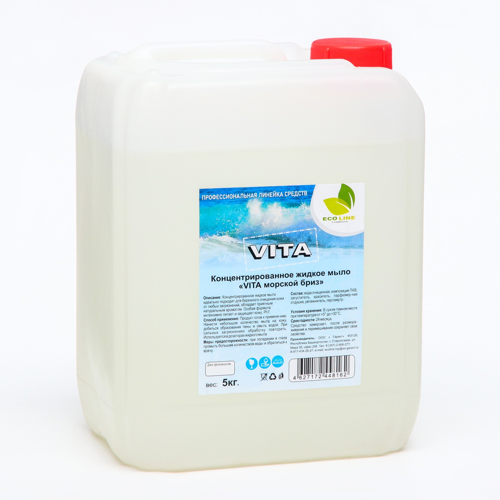 Концентрированное жидкое мыло «vita морской бриз» евро канистра, 5кг. Концентрированное жидкое мыло VITA "Морской бриз» идеально подходит для бережного очищения кожи от любых загрязнений, обладает приятным натуральным ароматом. Особая формула интенсивно питает и защищает кожу. Способ применения: продукт готов к применению. Нанести небольшое количество мыла на кожу, добиться образования пены и смыть водой. При сильных загрязнениях обработку повторить. Используется в дозаторах жидкого мыла. Состав: вода очищенная, композиция ПАВ, загуститель, краситель, парфюмерная отдушка, увлажнитель, перламутр. Меры предосторожности: при попадании в глаза промыть большим количеством воды и обратиться к врачу. Условия хранения: В сухом темном месте при температуре от +5 до +30 С. Срок годности 24 месяца. Объем: 5 л. Цвет: Белый parts count: 0 Вес, г/Объём, мл: 5000 Аромат: Морской бриз Тип: Жидкое Вид мыла: Туалетное : 0 Температурное ограничение: Нет Товар 18+: Нет  развернуть описание ▼