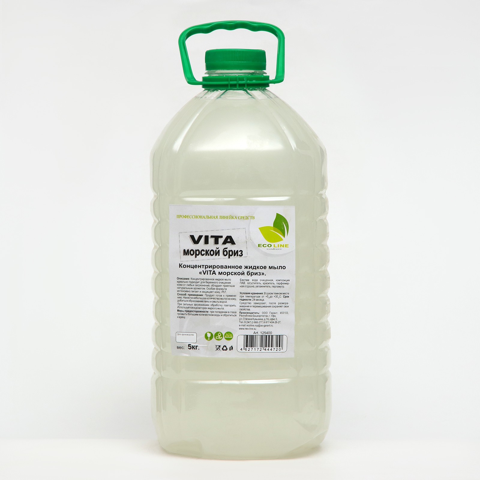 Жидкое мыло "vita морской бриз" 5 кг.. Концентрированное жидкое мыло VITA "Морской бриз" идеально подходит для бережного очищения кожи от любых загрязнений, обладает приятным натуральным ароматом. Особая формула интенсивно питает и защищает кожу. Способ применения: продукт готов к применению. Нанести небольшое количество мыла на кожу, добиться образования пены и смыть водой. При сильных загрязнениях обработку повторить. Используется в дозаторах жидкого мыла. Состав: вода очищенная, композиция ПАВ, загуститель, краситель, парфюмерная отдушка, увлажнитель, перламутр. Меры предосторожности: при попадании в глаза промыть большим количеством воды и обратиться к врачу. Условия хранения: в сухом темном месте при температуре от +5 до +30 С. Срок годности 24 месяца. Объем: 5 л. Цвет: Белый parts count: 0 Вес, г/Объём, мл: 5000 Аромат: Морской бриз Тип: Жидкое Вид мыла: Туалетное : 0 Температурное ограничение: Нет Товар 18+: Нет  развернуть описание ▼
