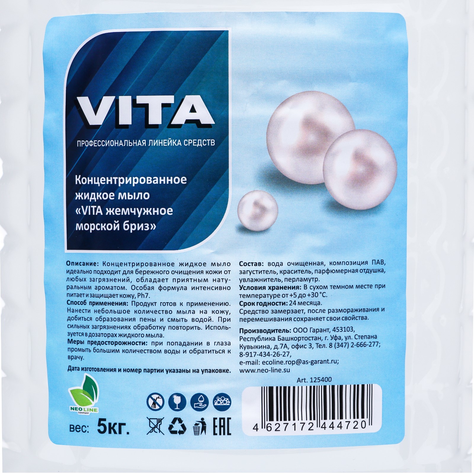 Крем - мыло жидкое «vita жемчужное морской бриз», 5кг. Крем-мыло жидкое увлажняющее VITA "Морской бриз» с легкой текстурой и нежным ароматом, созданное на основе высококачественных компонентов, обеспечивает деликатный уход за вашей кожей. Обладает хорошим очищающим эффектом. Благодаря входящим в состав смягчающим компонентам сохраняет защитные функции кожи, не вызывая ее сухости и раздражения. Способ применения: нанесите небольшое количество мыла на влажную кожу, добейтесь образования пены, смойте ее водой. Состав: вода очищенная, композиция ПАВ, загуститель, краситель, парфюмерная отдушка, перламутр. Меры предосторожности: не обрабатывайте поврежденную кожу и слизистые оболочки, при попадании в глаза промыть большим количеством воды и обратиться к врачу. Условия хранения: хранить в сухом прохладном месте при температуре от 5 до 35 °С. Избегать попадания прямого солнечного света. Хранить плотно закрытым. Срок годности 24 месяца. Объем: 5 л. Цвет: Белый Вес, г/Объём, мл: 5000 Аромат: Морской бриз Тип: Жидкое Вид мыла: Крем-мыло : 0 Температурное ограничение: Нет Товар 18+: Нет  развернуть описание ▼