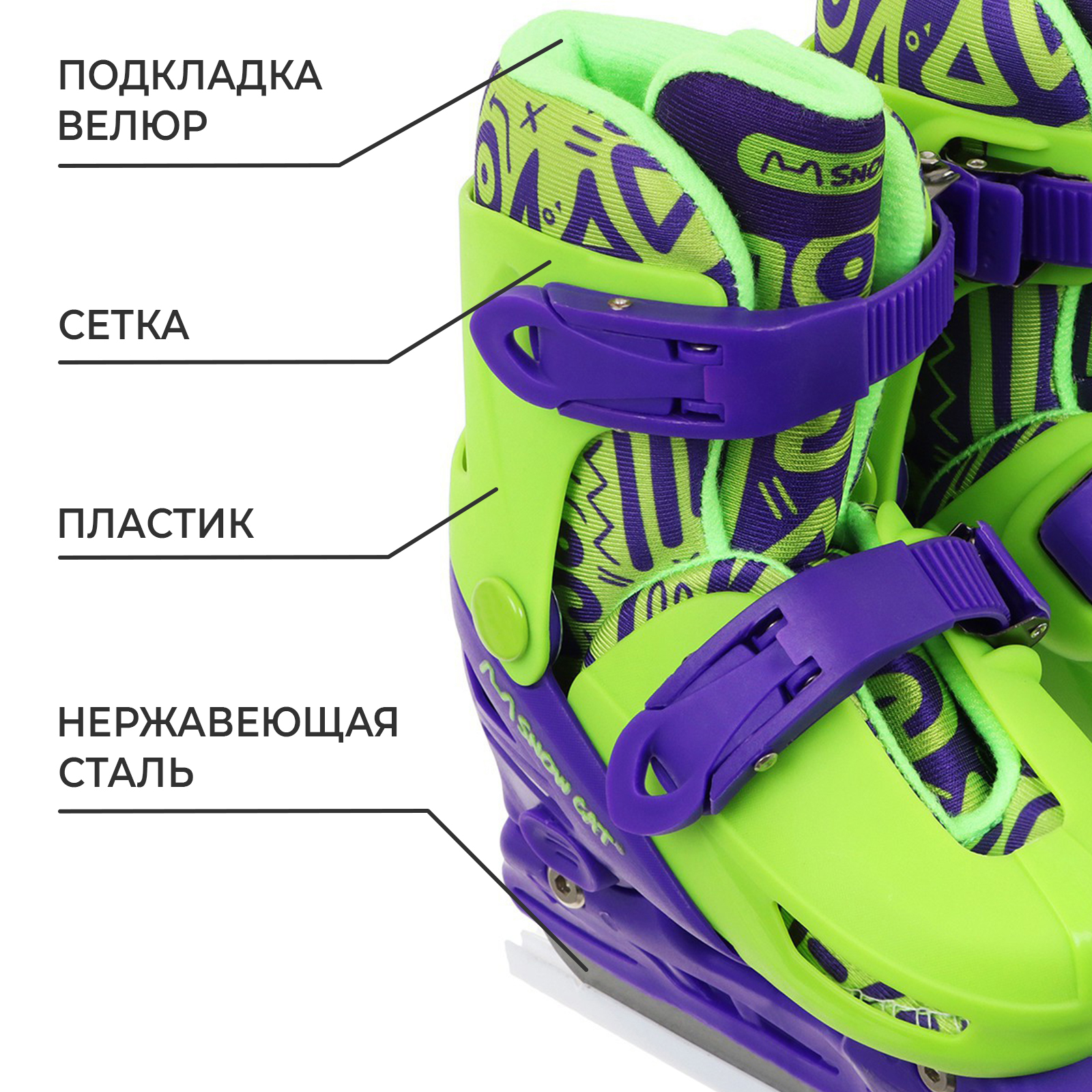 Коньки детские раздвижные snow cat, р. 26-29.   Коньки подходят для катания на открытом льду и крытых катках. Их легко надеть, отрегулировать и зафиксировать с помощью пластиковых клипс, которые расположены на голенище и в области ступни.  Жёсткий корпус ботинка защищает ногу от травм, гарантирует плотную посадку и поддерживает голеностоп. Внутренняя подкладка из сетки и бархата согревает и создаёт комфорт.  Коньки регулируются на 4 размера, это позволяет использовать их в течение нескольких сезонов. Для изменения размера необходимо зажать кнопку Push у основания пятки и раздвинуть две части пластикового каркаса до нужного положения. Внутренний сапожок состоит из двух частей, которые фиксируются с помощью липучек. При изменении размера его необходимо достать и закрепить в нужном положении.  Универсальное лезвие из нержавеющей стали не поддаётся коррозии.  Рекомендации по эксплуатации Удаляйте влагу с лезвия мягкой тканью. Сушите при комнатной температуре вдали от отопительных приборов. Используйте чехлы для лезвий коньков во время хранения и перехода к ледовой площадке. Заточите лезвия после покупки и повторяйте эту процедуру по мере необходимости для комфортного катания. Особенности Максимальная нагрузка: 40 кг.  Максимальная температура катания: до –10 °С.  Коньки не предназначены для коммерческого использования и в пунктах проката.  Цвет: Фиолетовый Цвет: Зелёный Для кого: Для девочки Для кого: Для мальчика Для кого: Унисекс Возраст: От 5 лет Размер обуви: 26 Размер обуви: 27 Размер обуви: 28 Размер обуви: 29 Материал подкладки: Вельвет Материал подкладки: Сетка Серия: Без серии Раздвижные коньки: Да Тип коньков: Детские Роликовая платформа: Нет Материал верха: Пластик Подходят для проката: Нет Материал лезвия: Нержавеющая сталь  развернуть описание ▼
