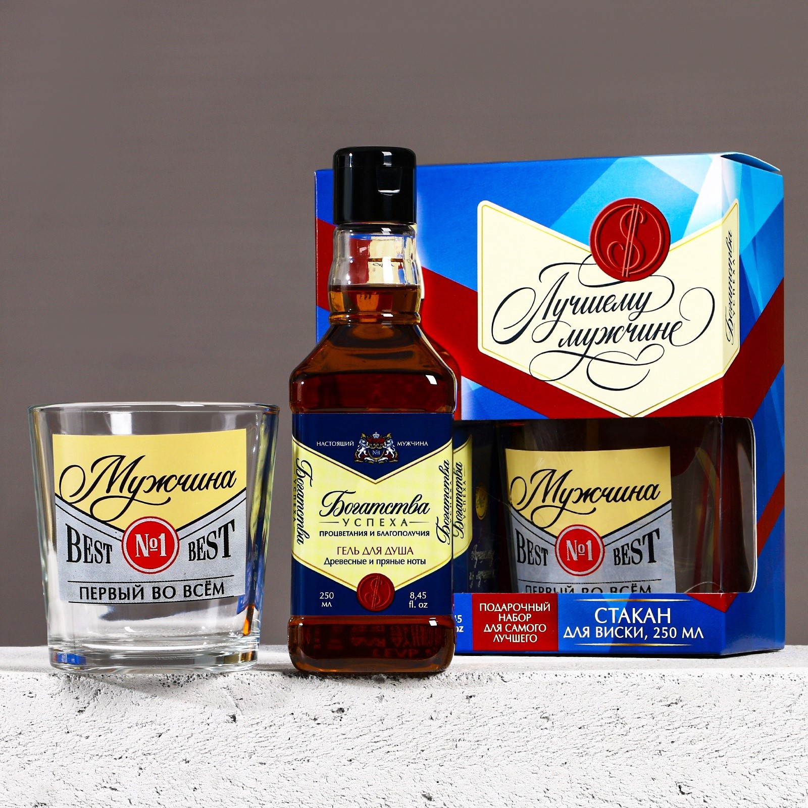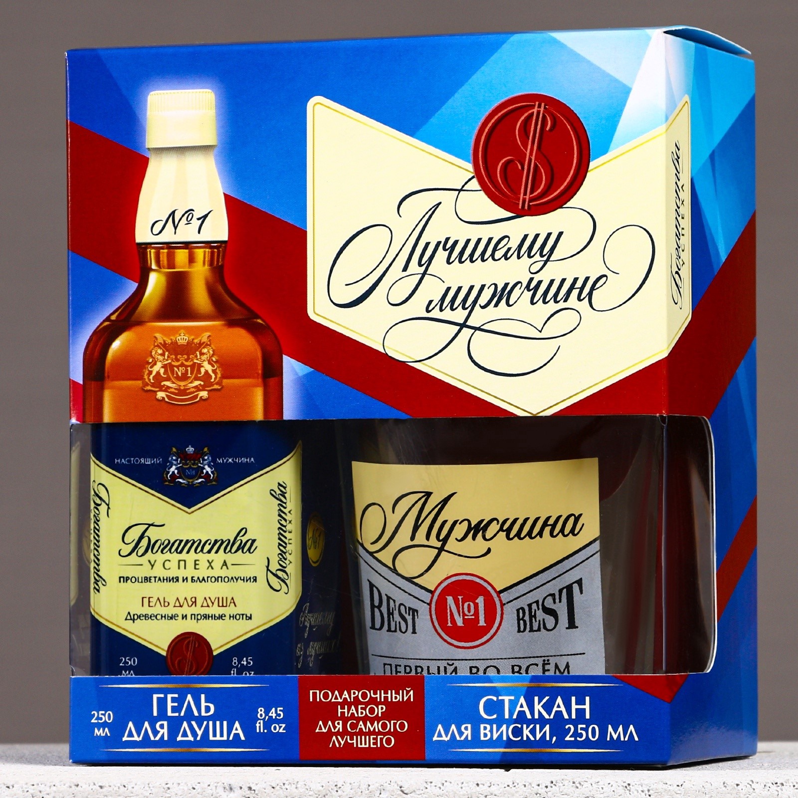 Подарочный набор «лучшему мужчине»: гель для душа виски 250 мл и стакан для виски, чистое счастье. видеоНабор:Да|Цвет:Синий|Для кого:Для мужчины|В наборе, шт.:2|В упаковке, шт.:2|Объём, мл:250|Вид упаковки:Подарочная коробка|Символ года:Нет|Тематика праздника:Универсальная тематика|Адресат:Мужчине|Возраст:Взрослый|Материал:Пластик|Область применения:Для тела|Аромат:Древесный с пряными нотами|Составляющие набора:Гель для душа|Составляющие набора:Стакан|Темпер. ограничение НЕ НИЖЕ :+5|Темпер. ограничение НЕ ВЫШЕ :+25|Возраст:Для взрослых|Назначение:Очищение, детокс|Форма выпуска:Флакон без дозатора|Форма выпуска:Формовые|Страна:Россия  развернуть описание ▼